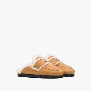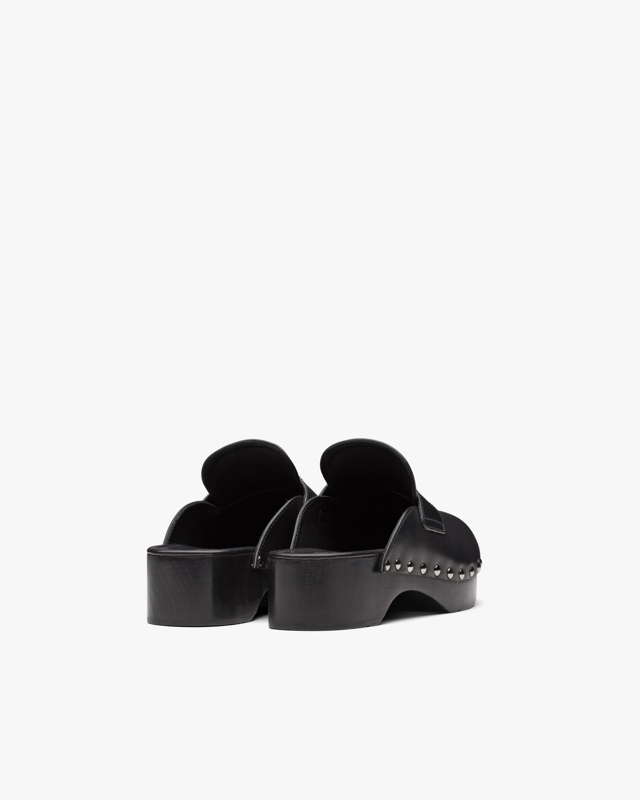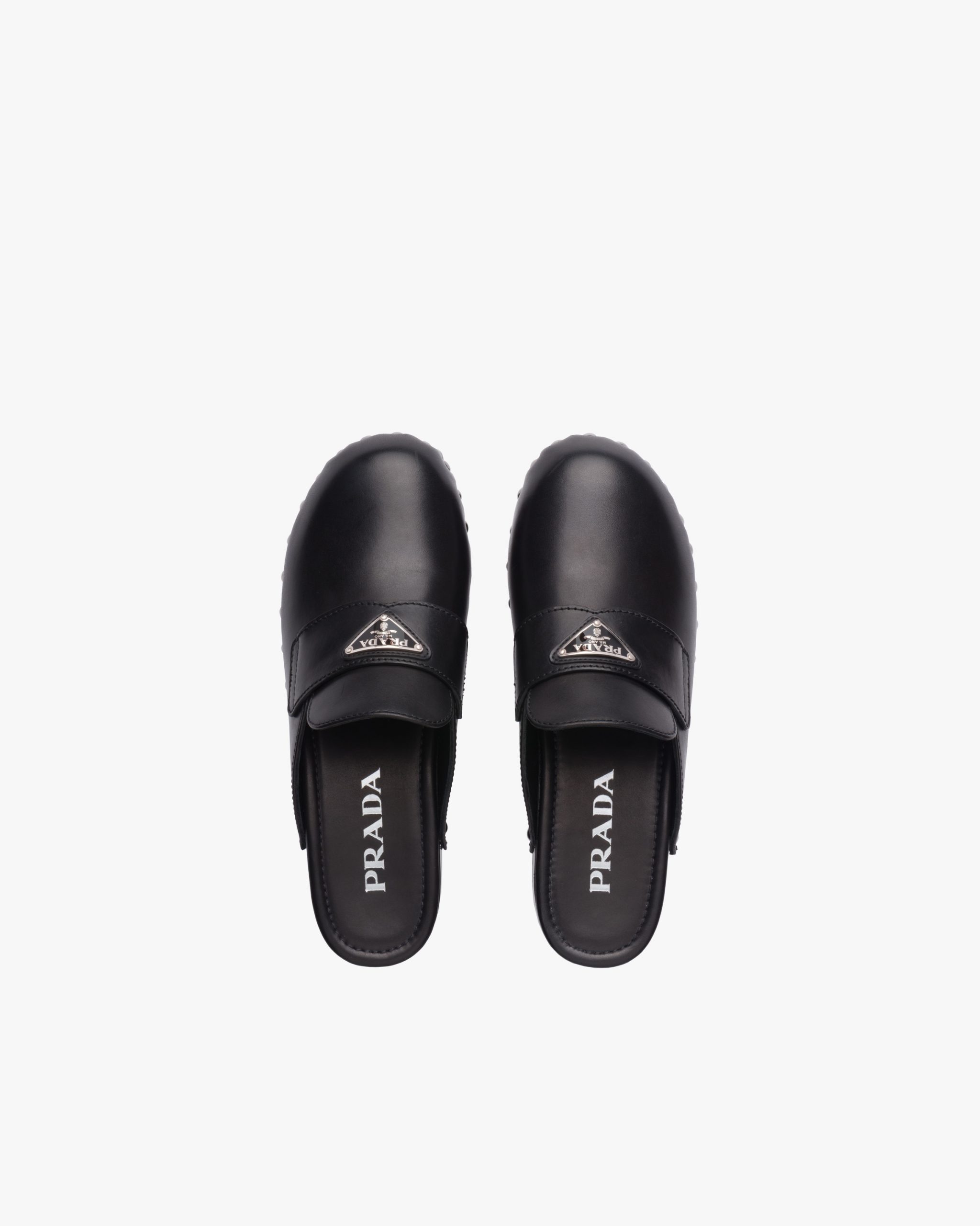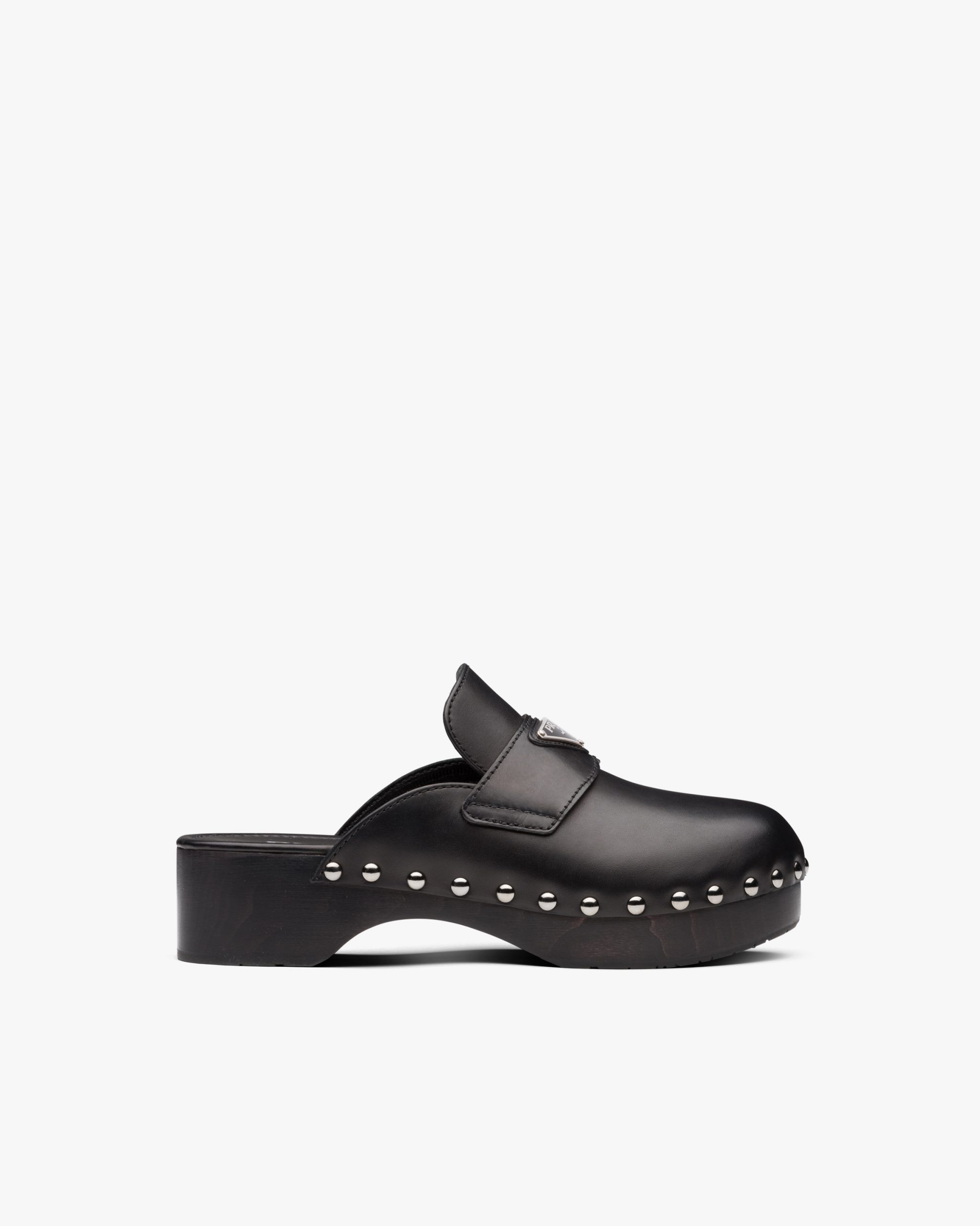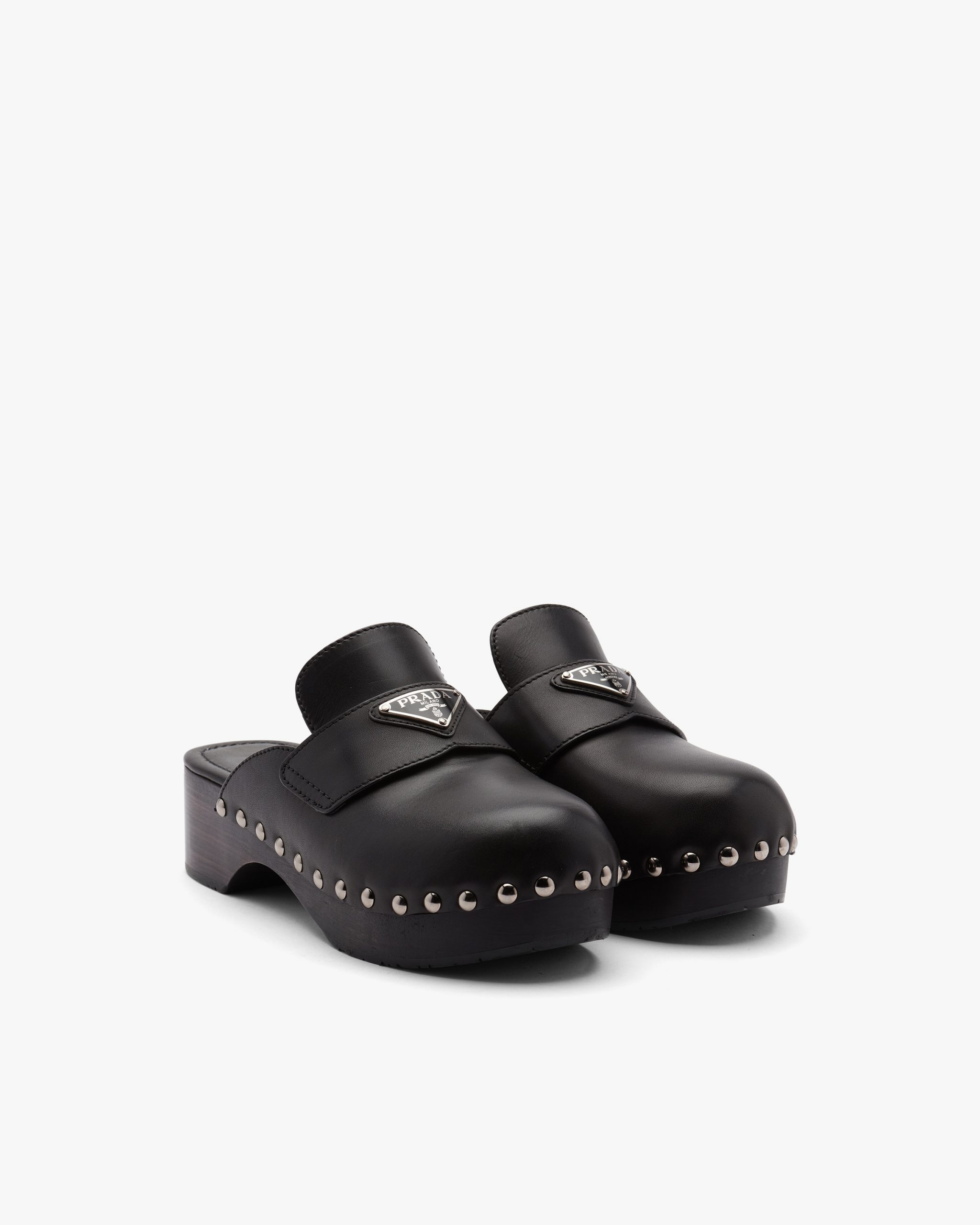 A hybrid design that reflects the duality of the brand characterizes these leather clogs. Embellished with metal studs applied along the edge, the footwear has a rubber sole, while the enameled triangle logo accentuates the sophisticated allure of the shoe.