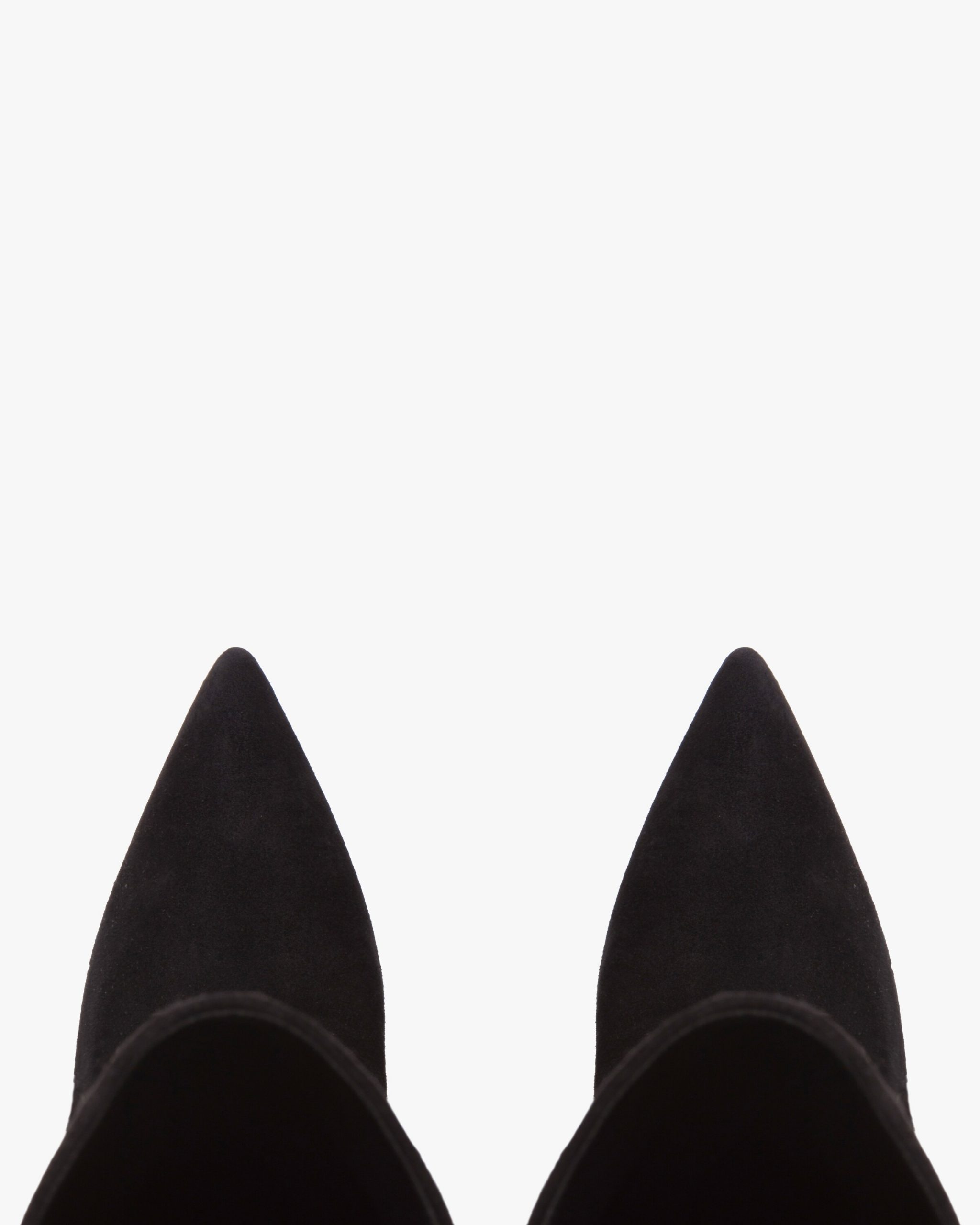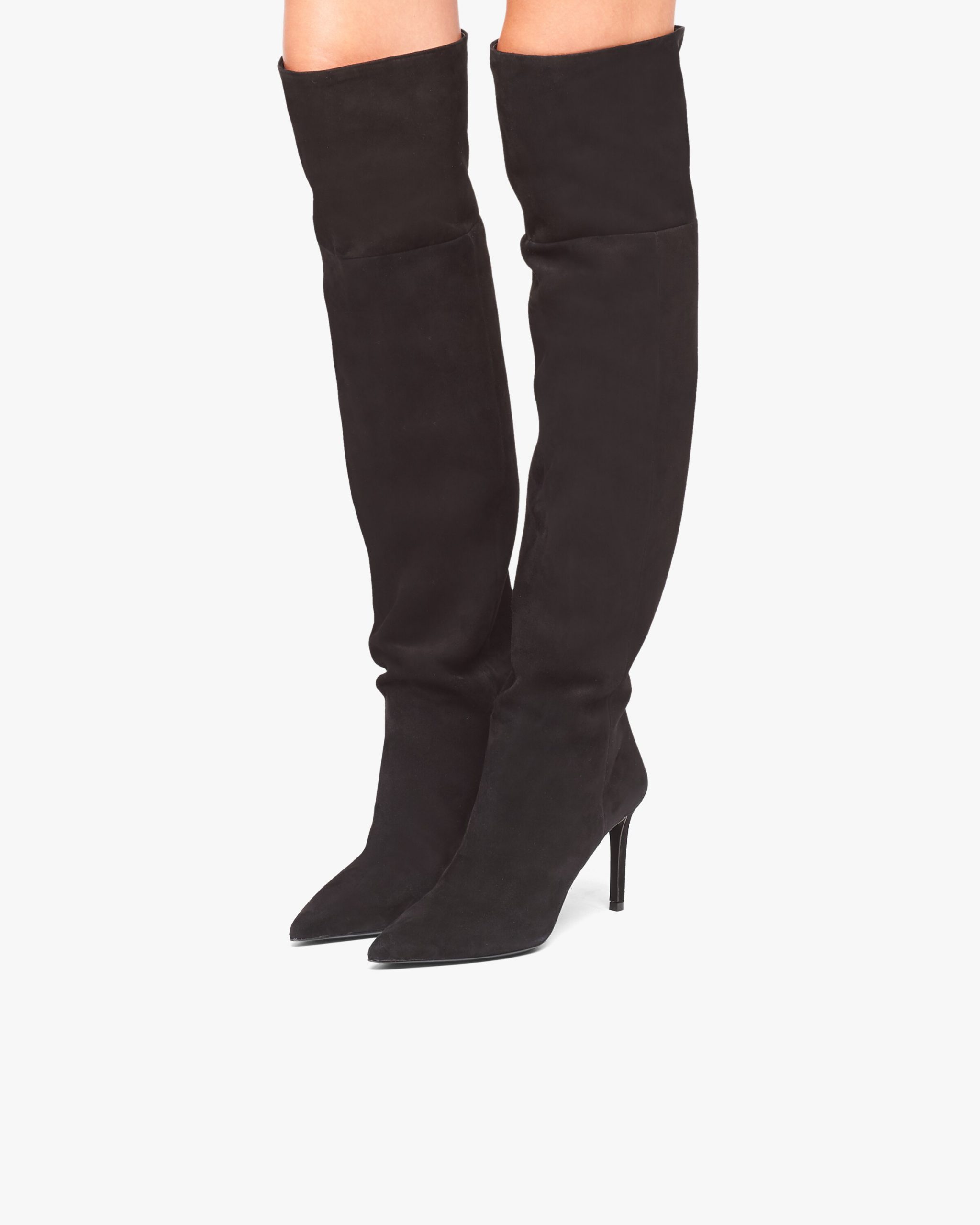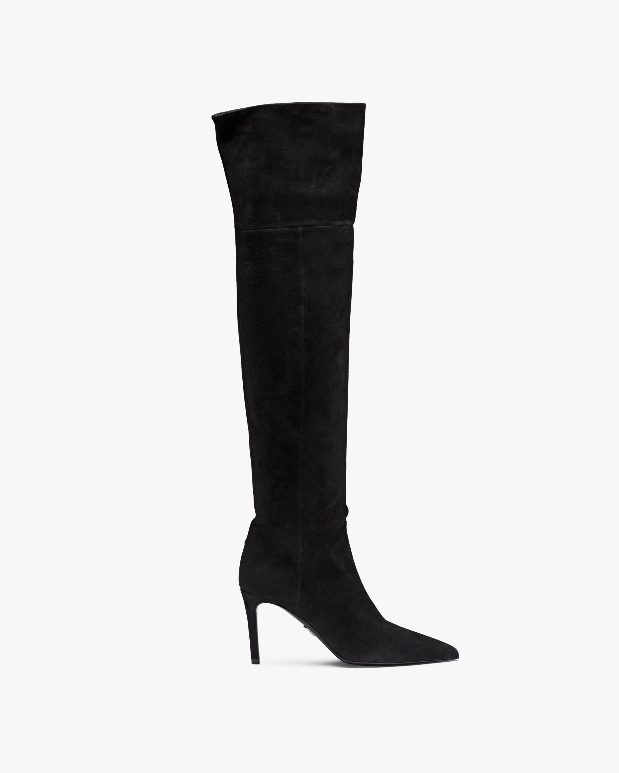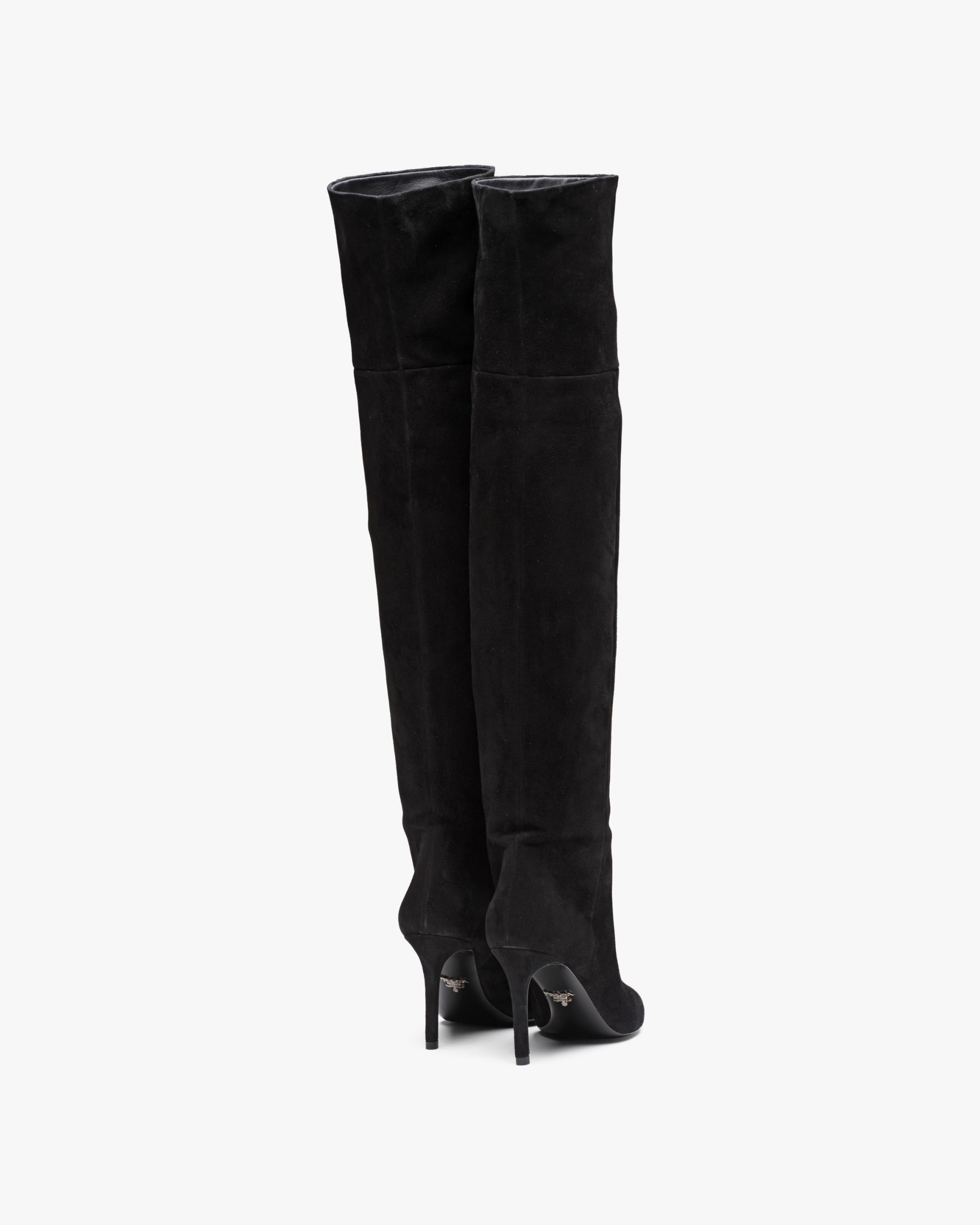 These suede boots have slender lines. They have a leather-covered high heel and are decorated with the metal lettering logo on the leather sole.
