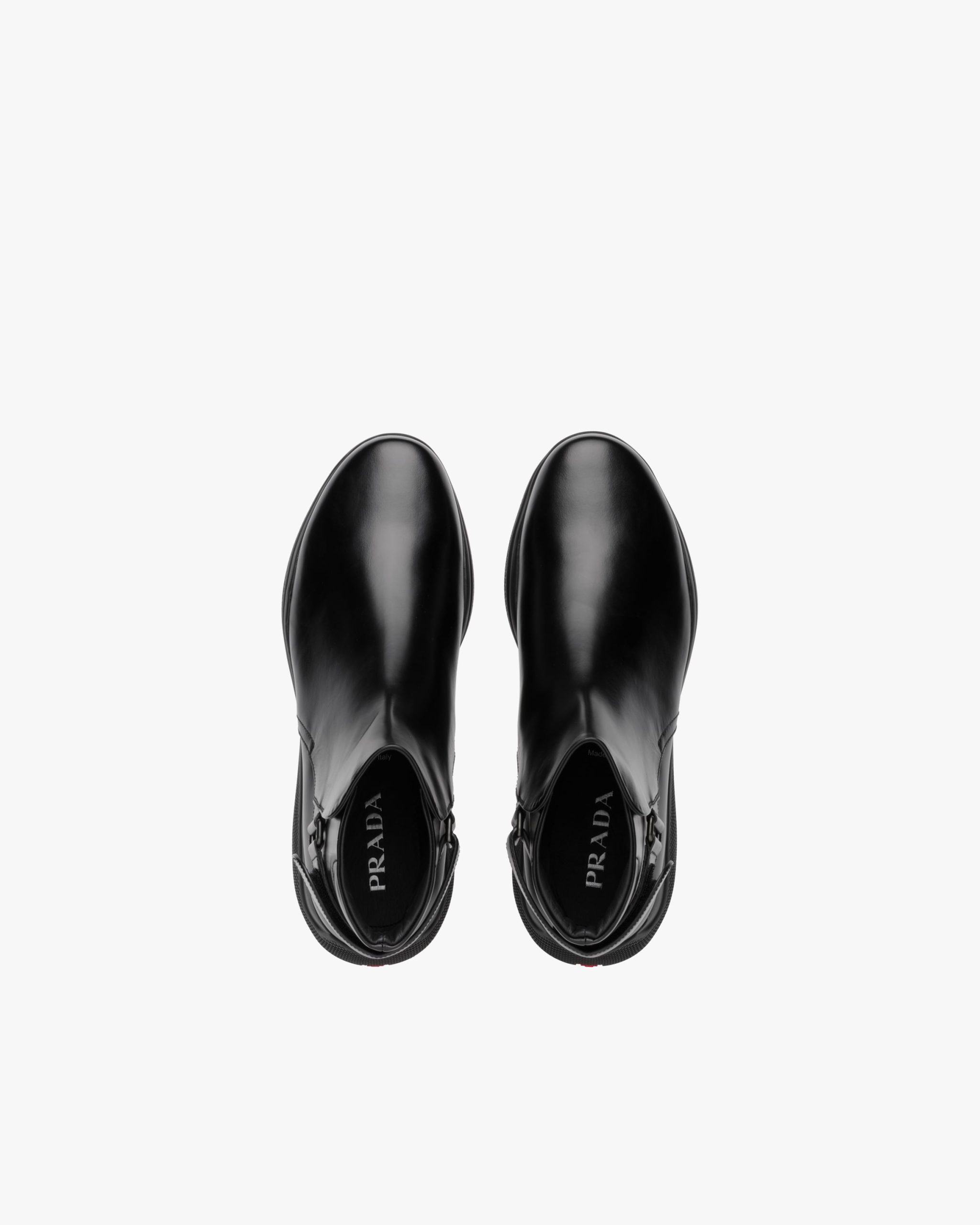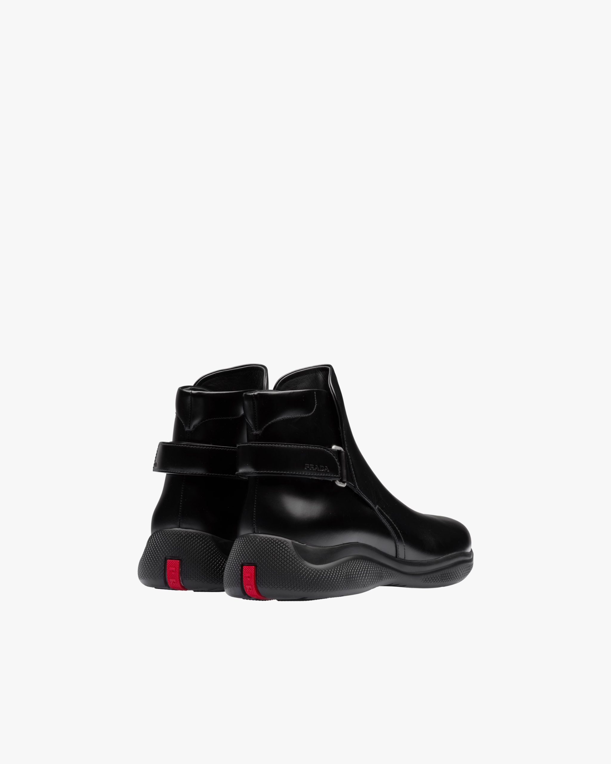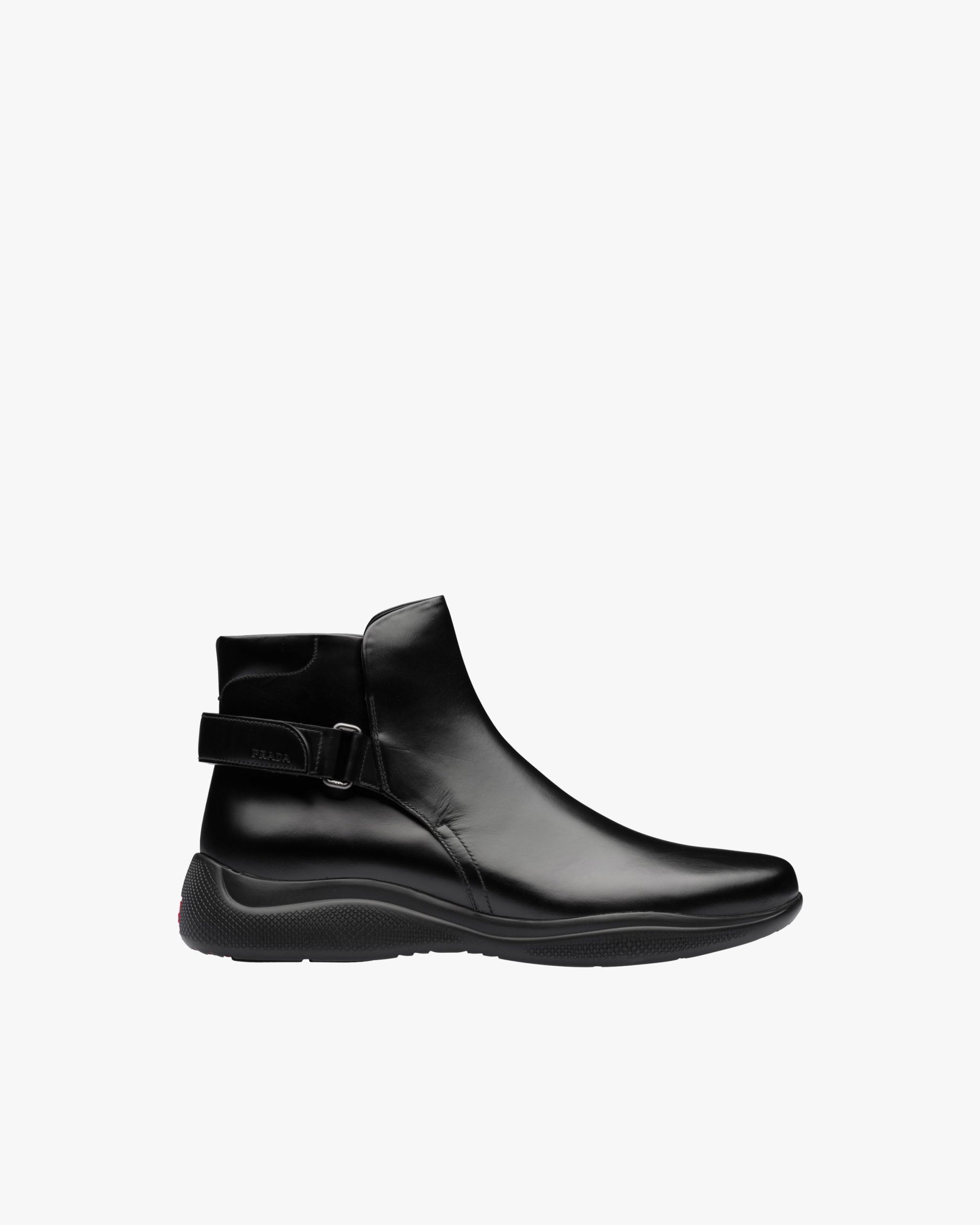 These brushed leather ankle boots have a strap with hook and loop fastener and a rubber sole.