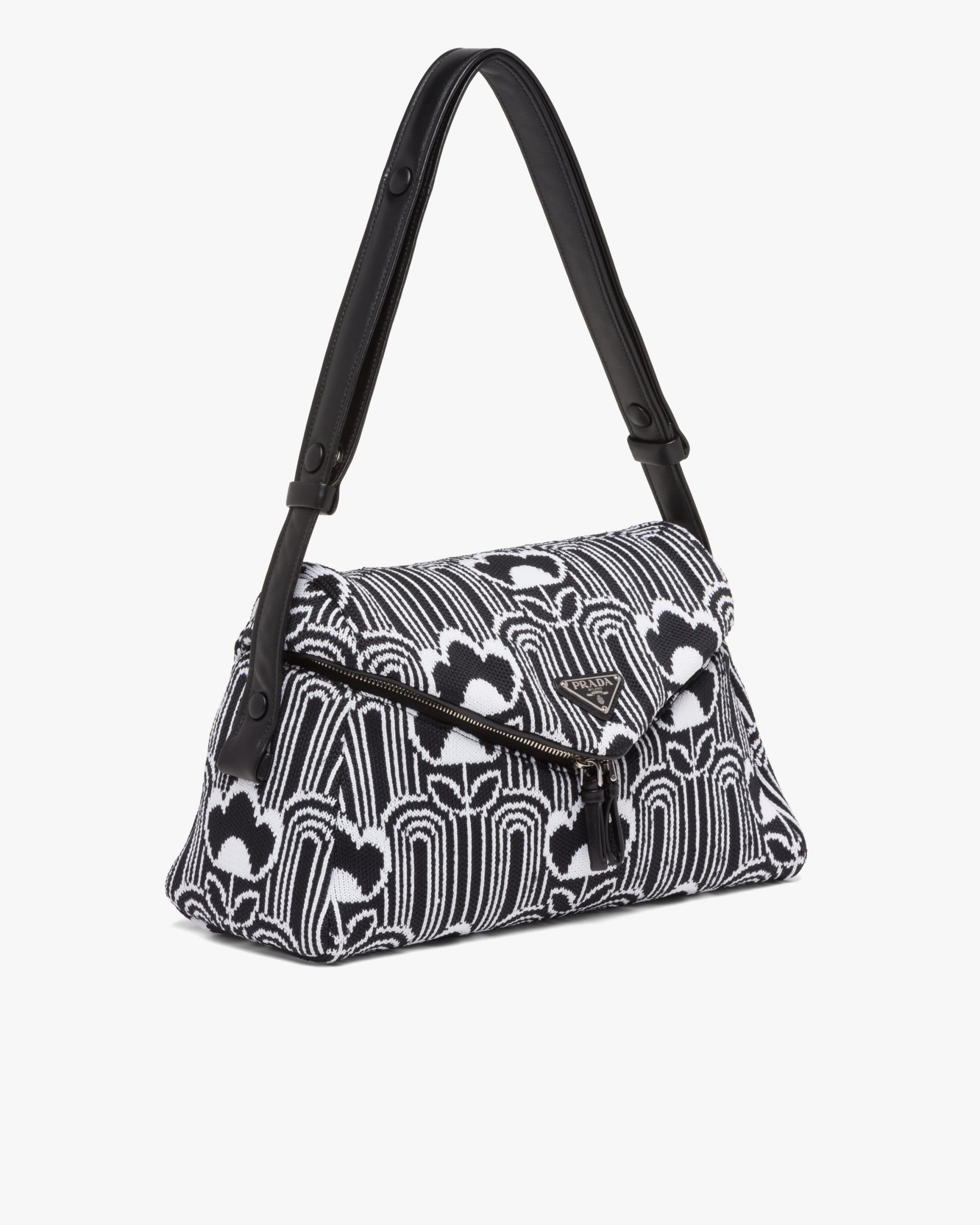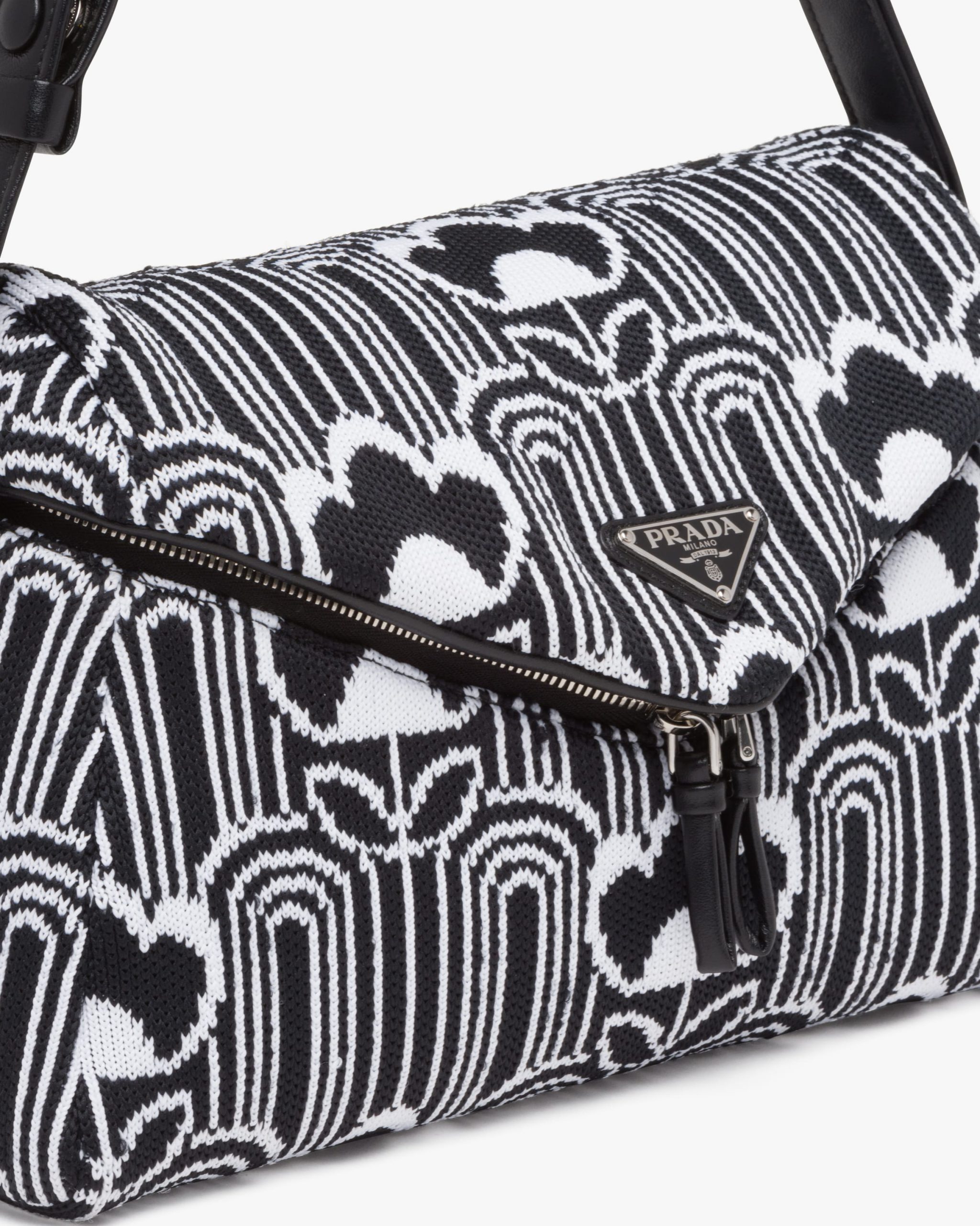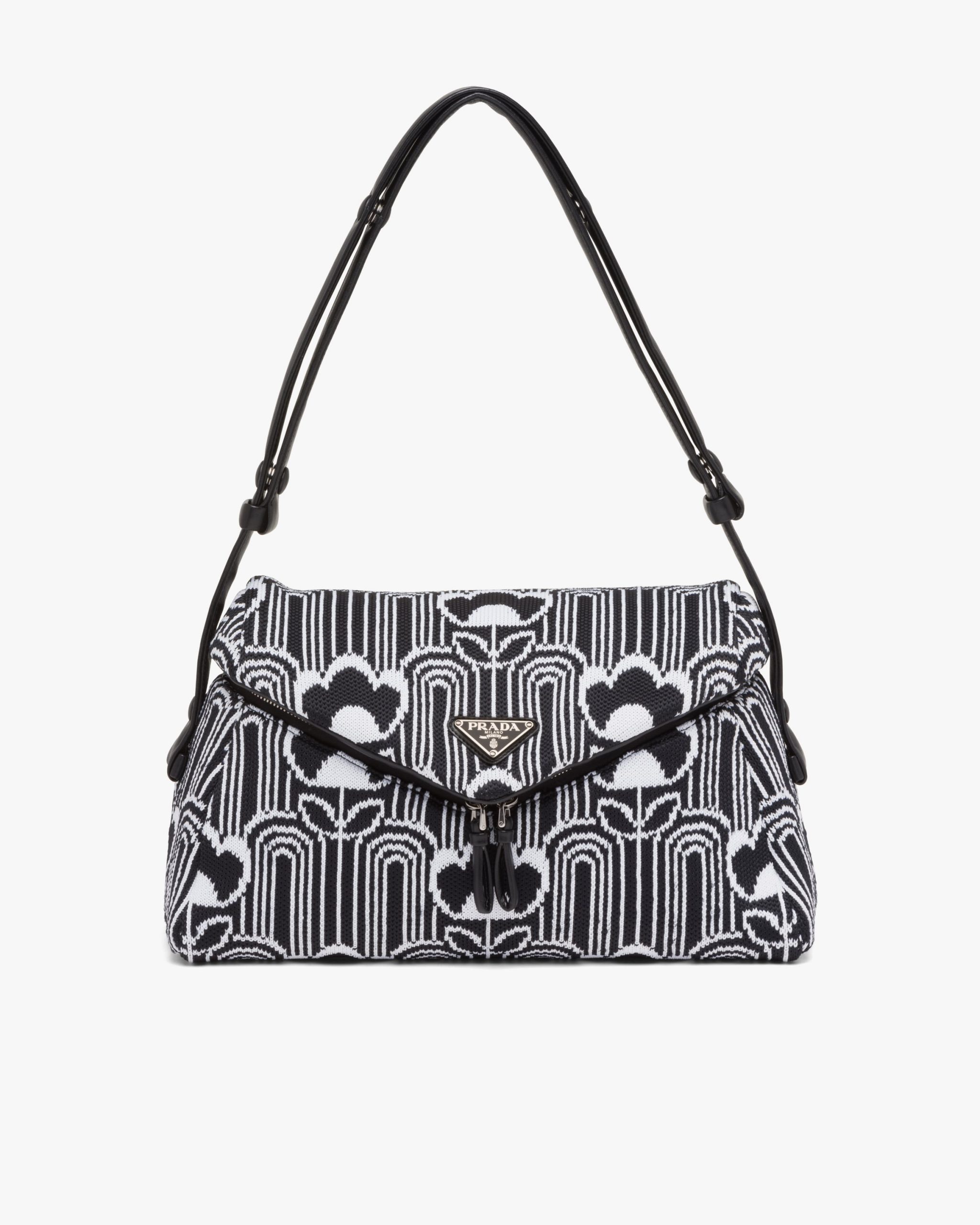 Emblematic of the Fall/Winter 2021 collectsion, geometric jacquard motifs with a sixties mood decorate this shoulder bag with a contemporary attitude and particular reverse seam construction. A study of the triangle inspires new geometric details and unique interpretations of the historic Prada logo. The iconic shape appears in the large flap of this bag with sleek lines that has an adjustable leather shoulder strap so that it can be worn in different ways.
