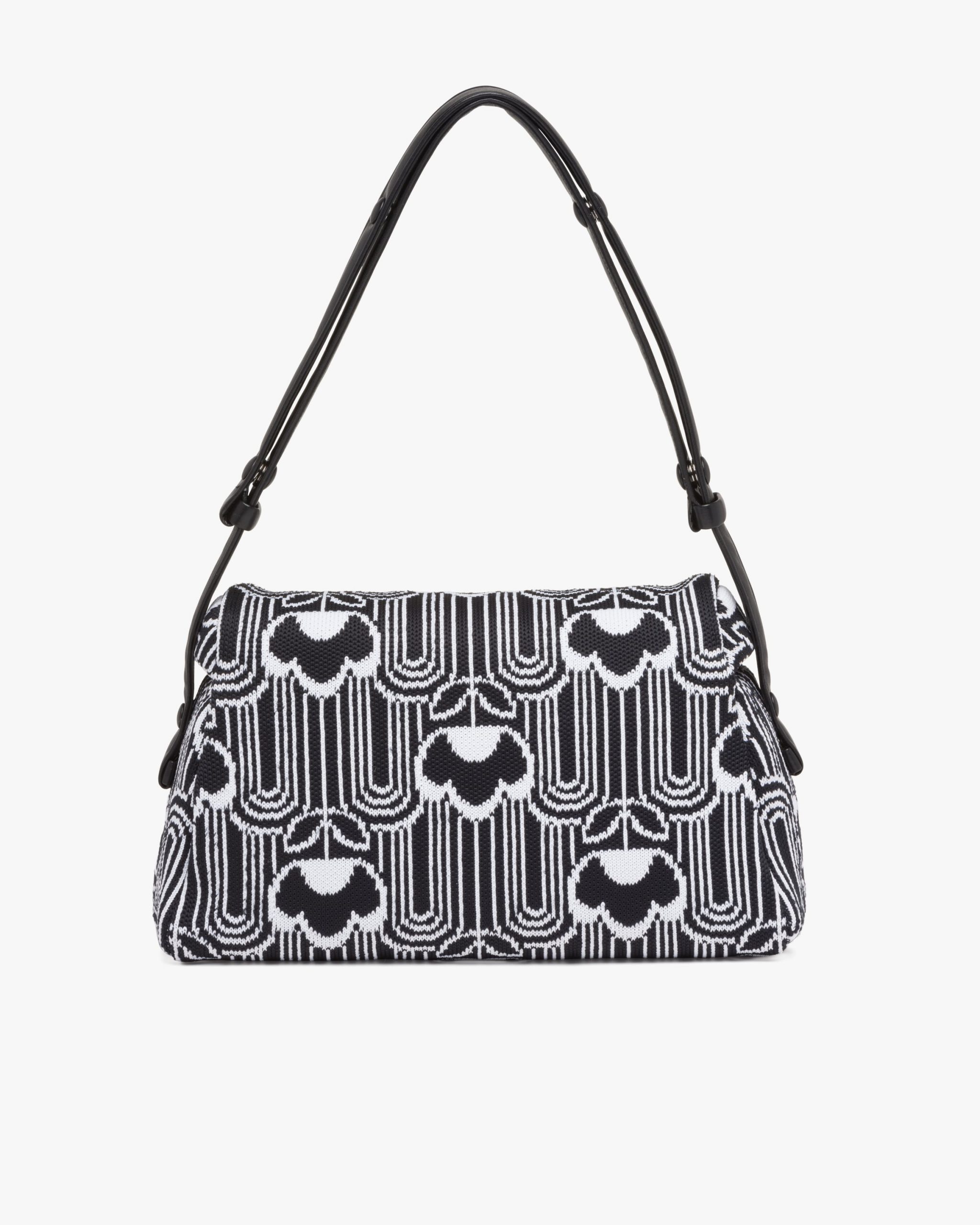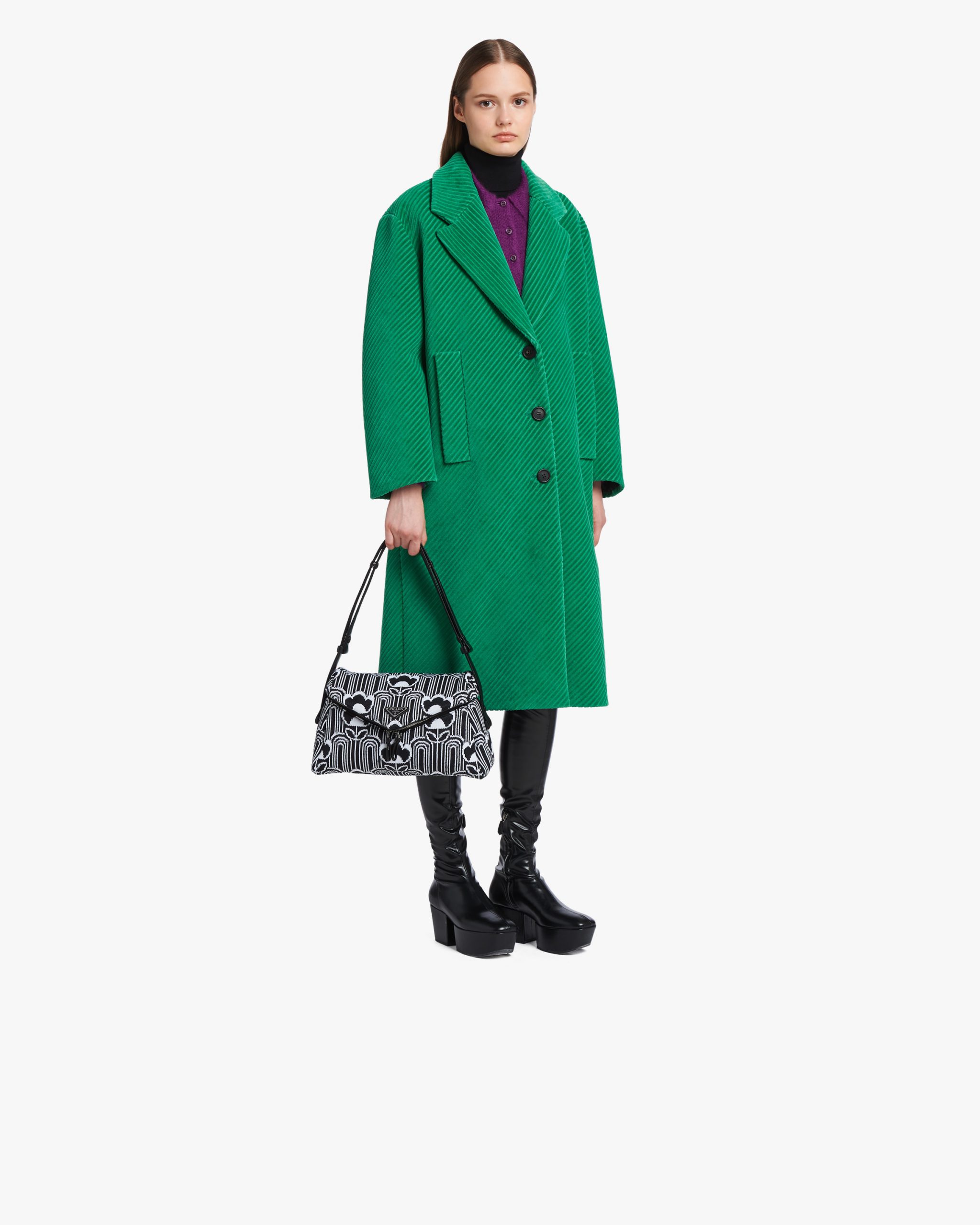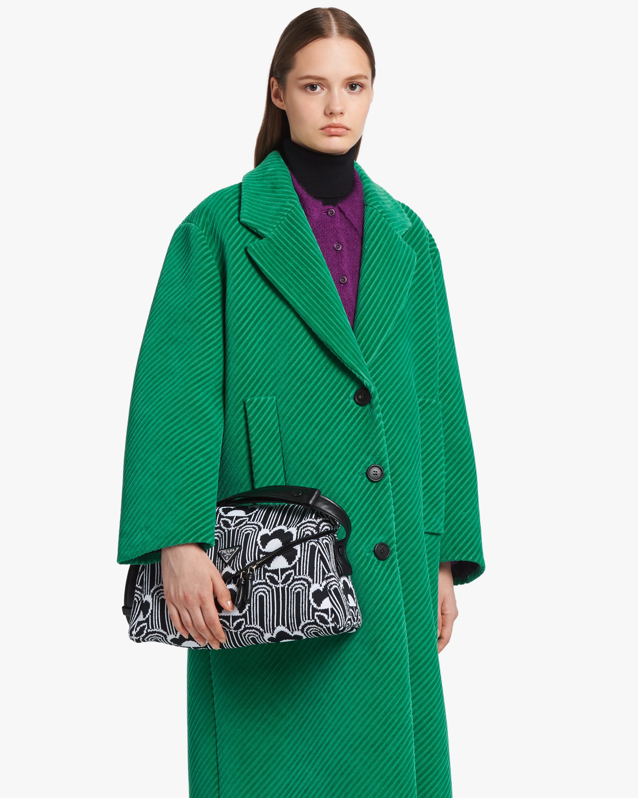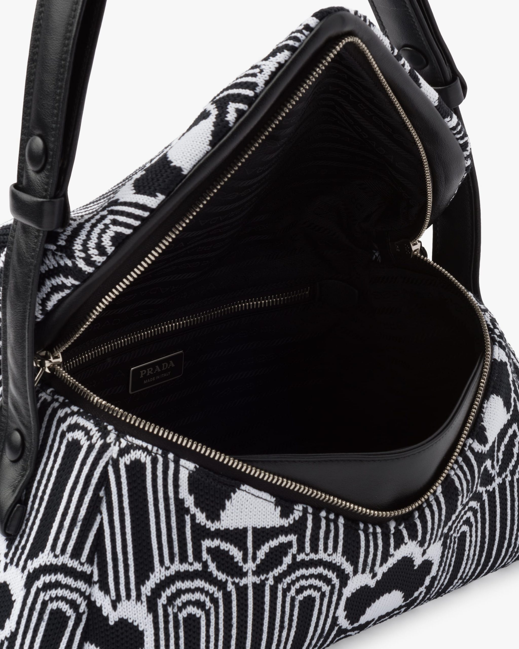 Emblematic of the Fall/Winter 2021 collectsion, geometric jacquard motifs with a sixties mood decorate this shoulder bag with a contemporary attitude and particular reverse seam construction. A study of the triangle inspires new geometric details and unique interpretations of the historic Prada logo. The iconic shape appears in the large flap of this bag with sleek lines that has an adjustable leather shoulder strap so that it can be worn in different ways.