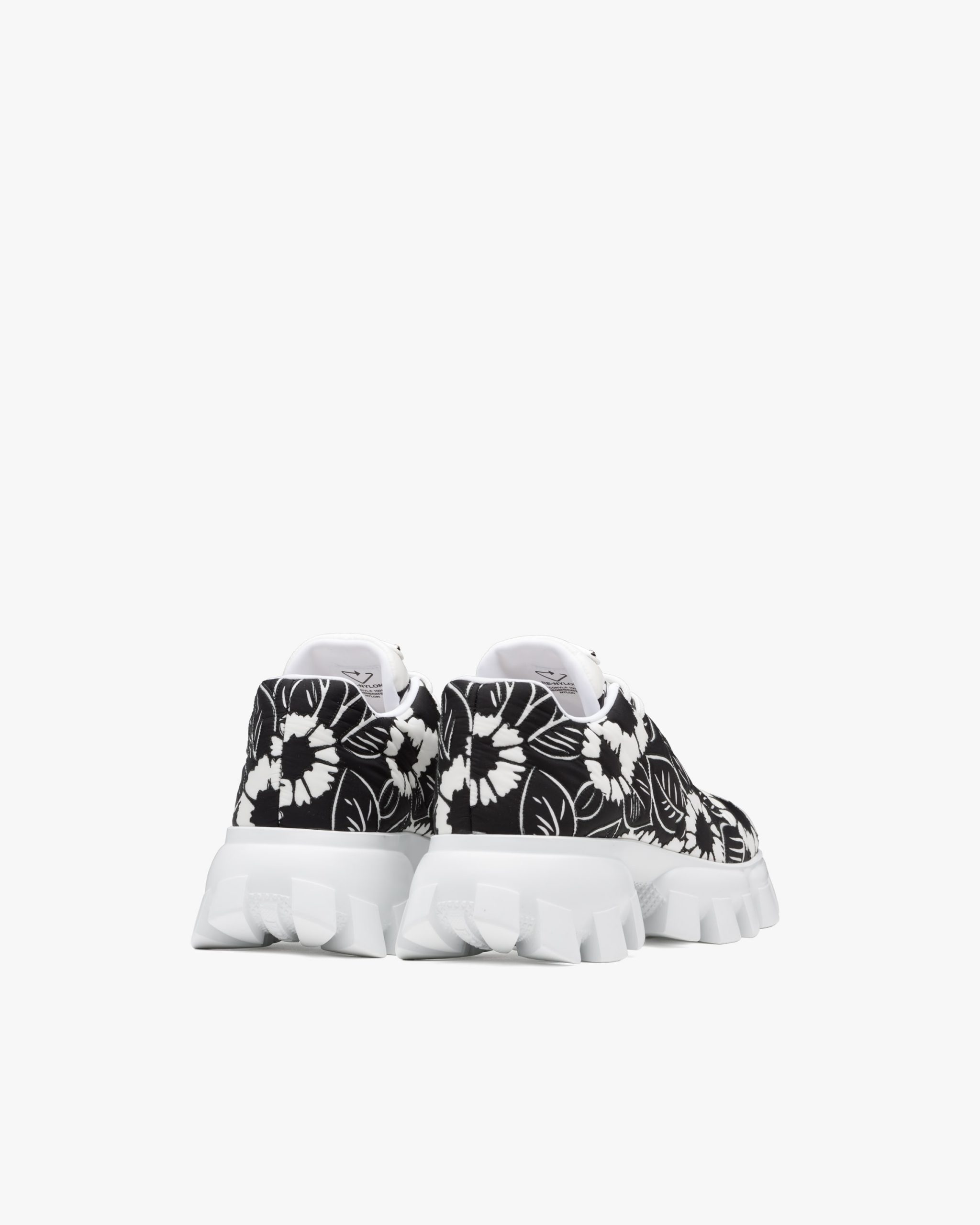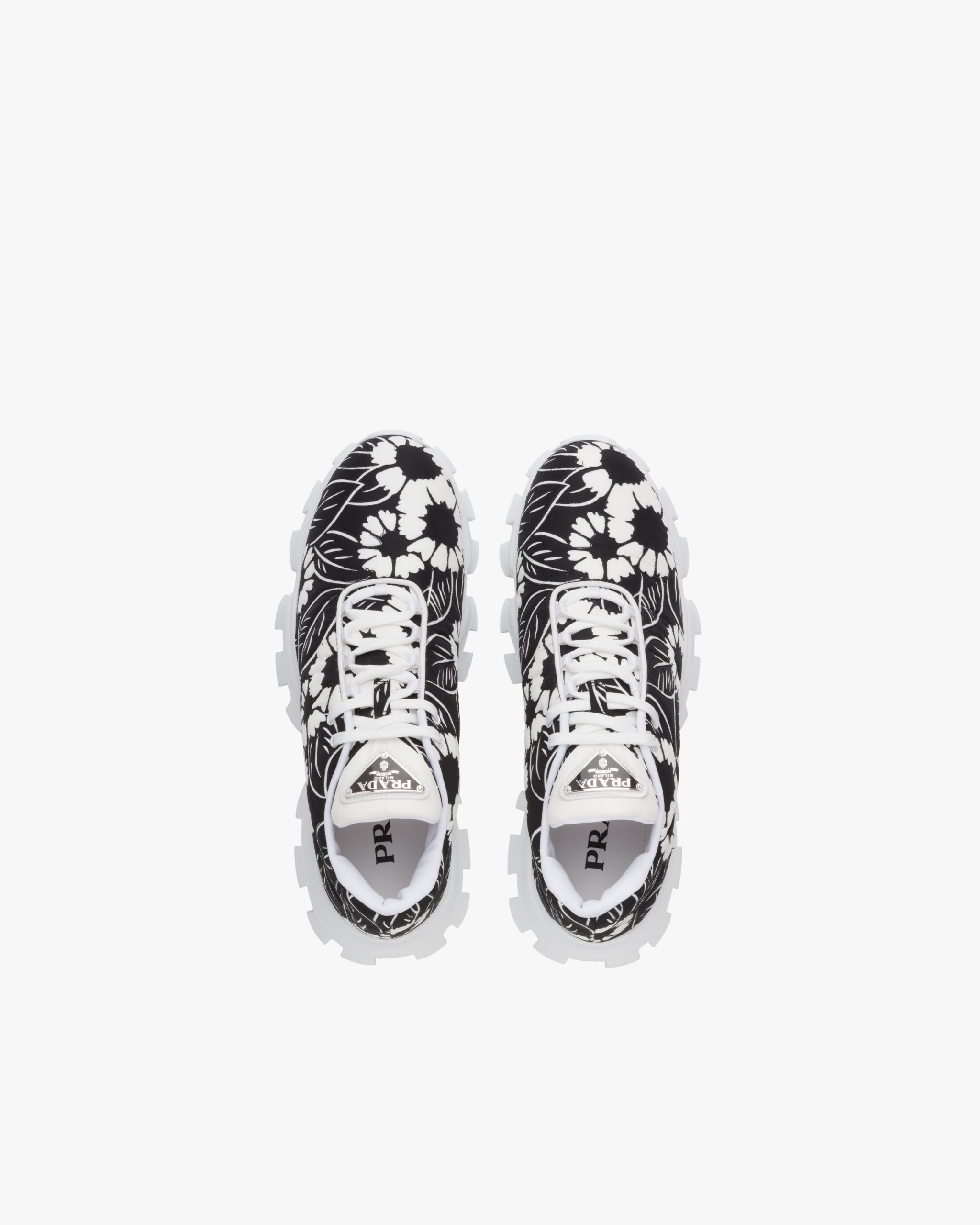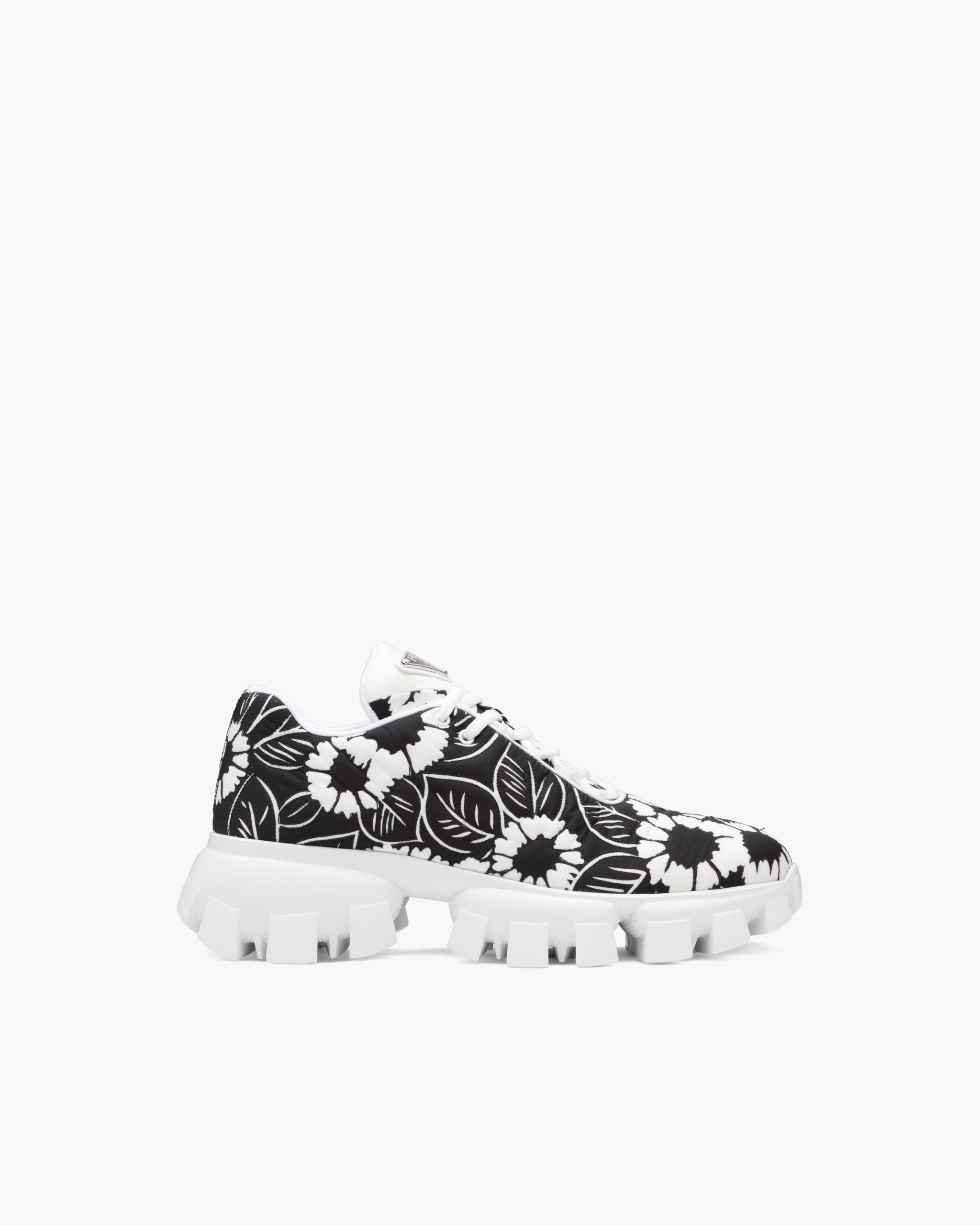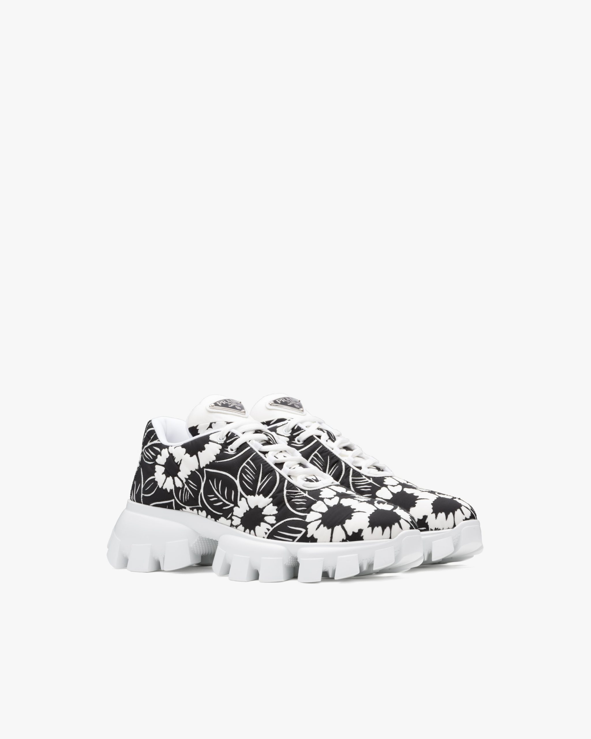 A vivid graphic design decorates these nylon sneakers with a hybrid character. These refined, sporty sneakers stand out for the harmonic stylistic contrast between the bold sole and printed upper decorated with the enameled metal triangle logo.