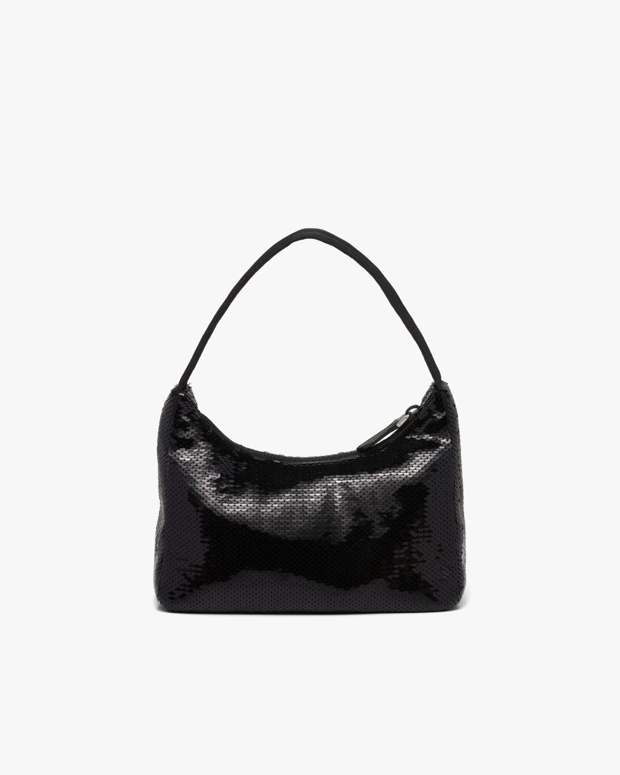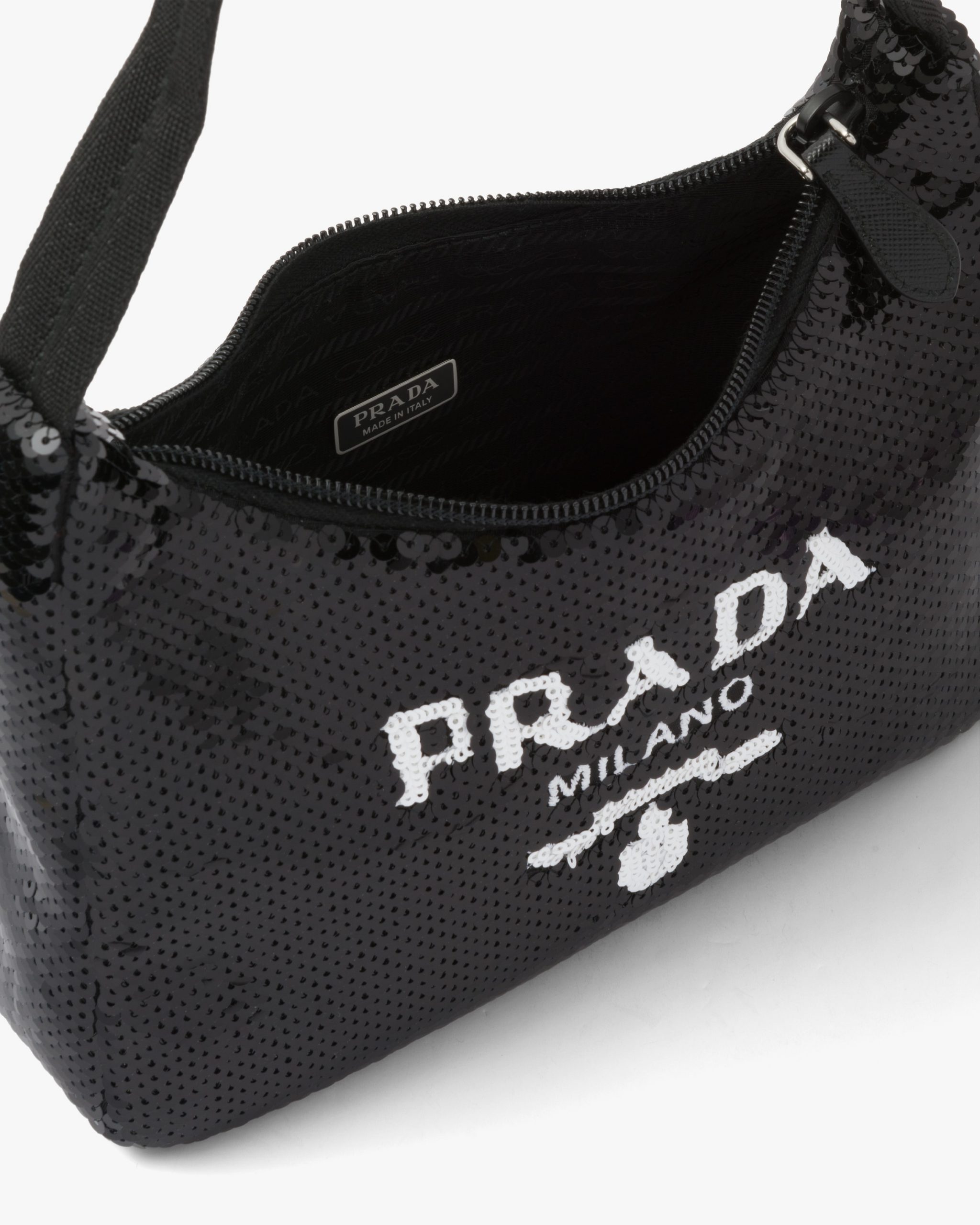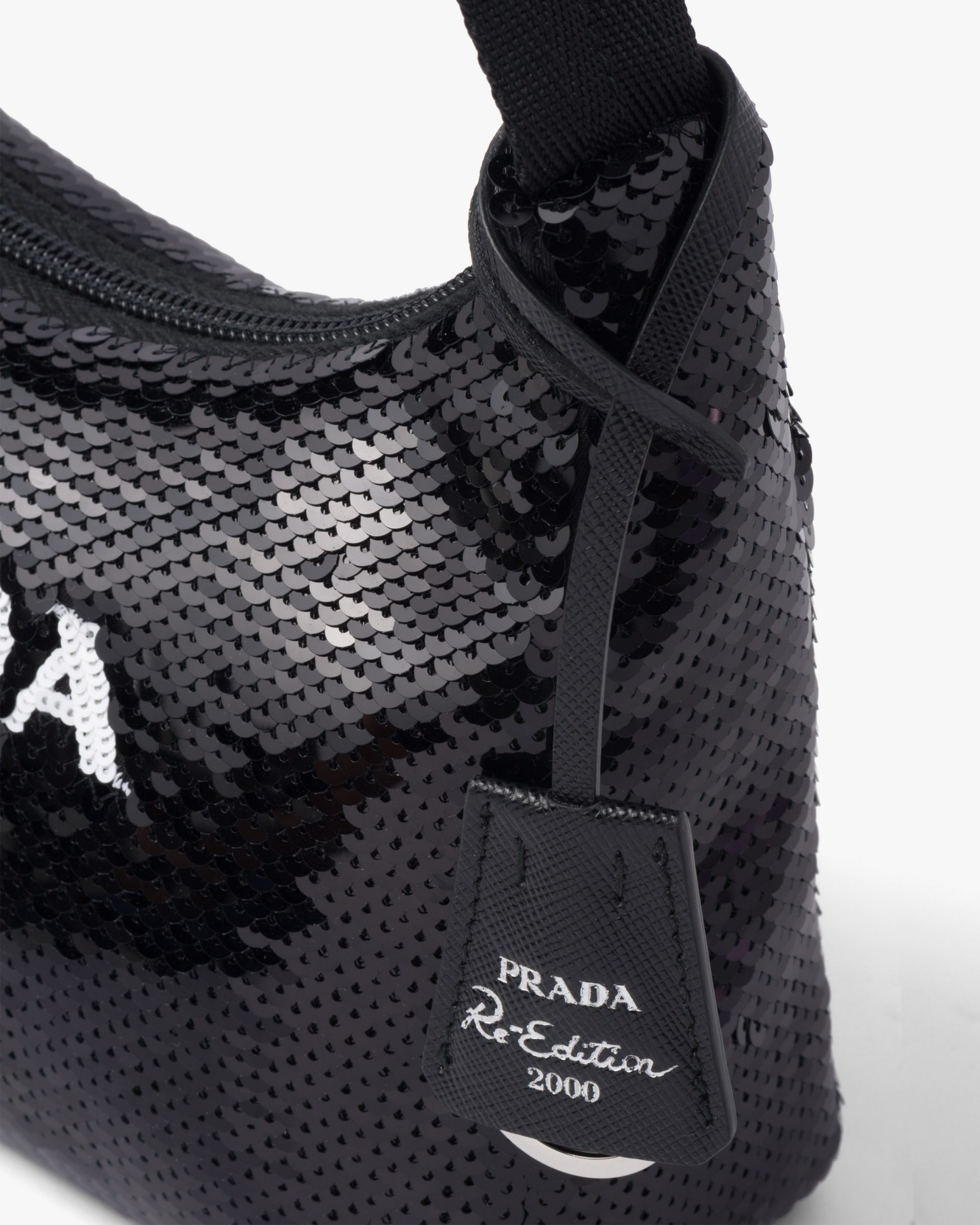 A new interpretation of an iconic Prada style, the Re-Edition 2000 mini-bag is covered with all-over sequins that create a play of light and iridescent glimmers on the surface. The design is made of innovative Re-Nylon, produced from recycled, purified plastic materials collectsed in the ocean, fishing nets, and textile fibers. The accessory with zipper closure and woven tape handle is enhanced with the distinctive enameled metal triangle logo.