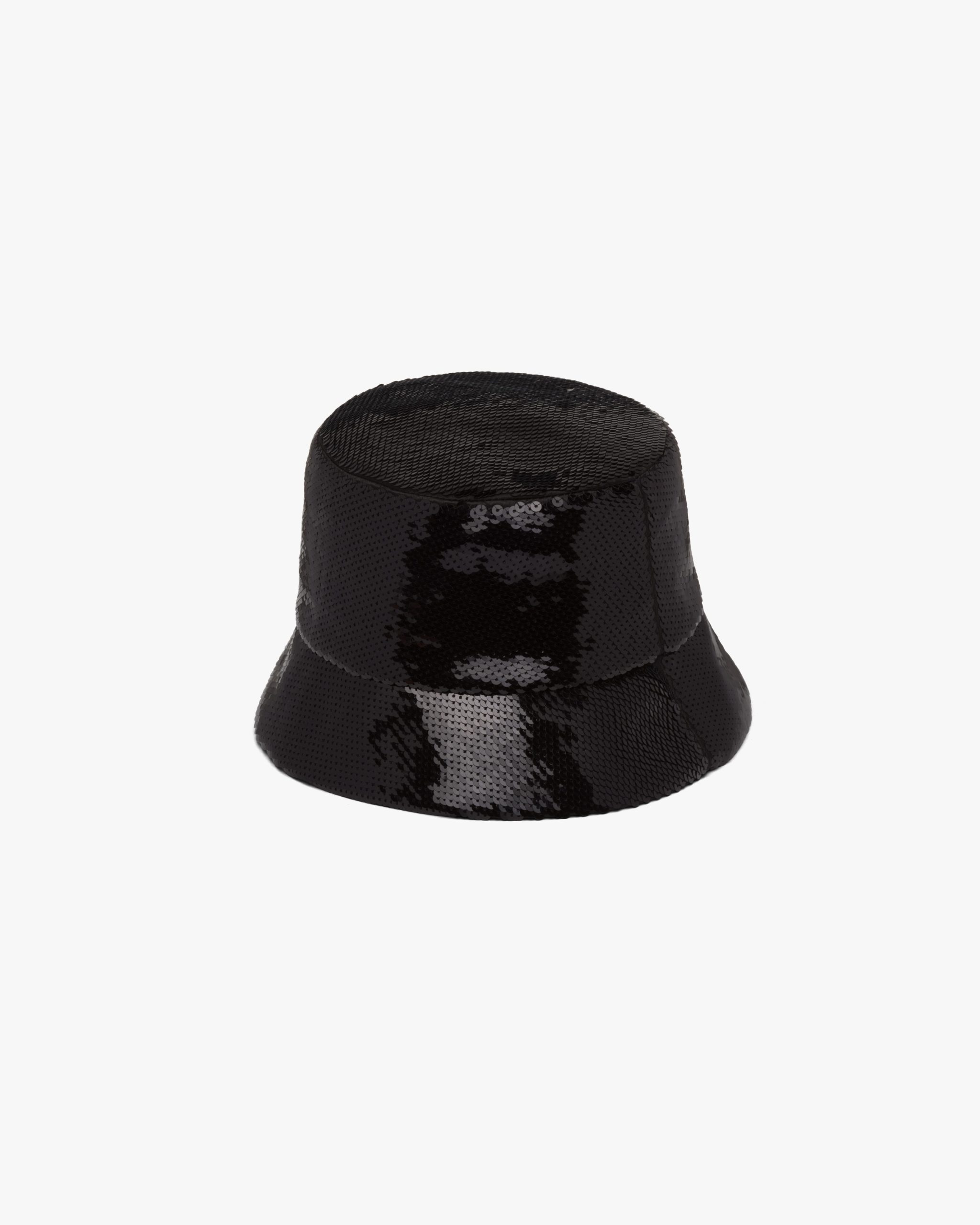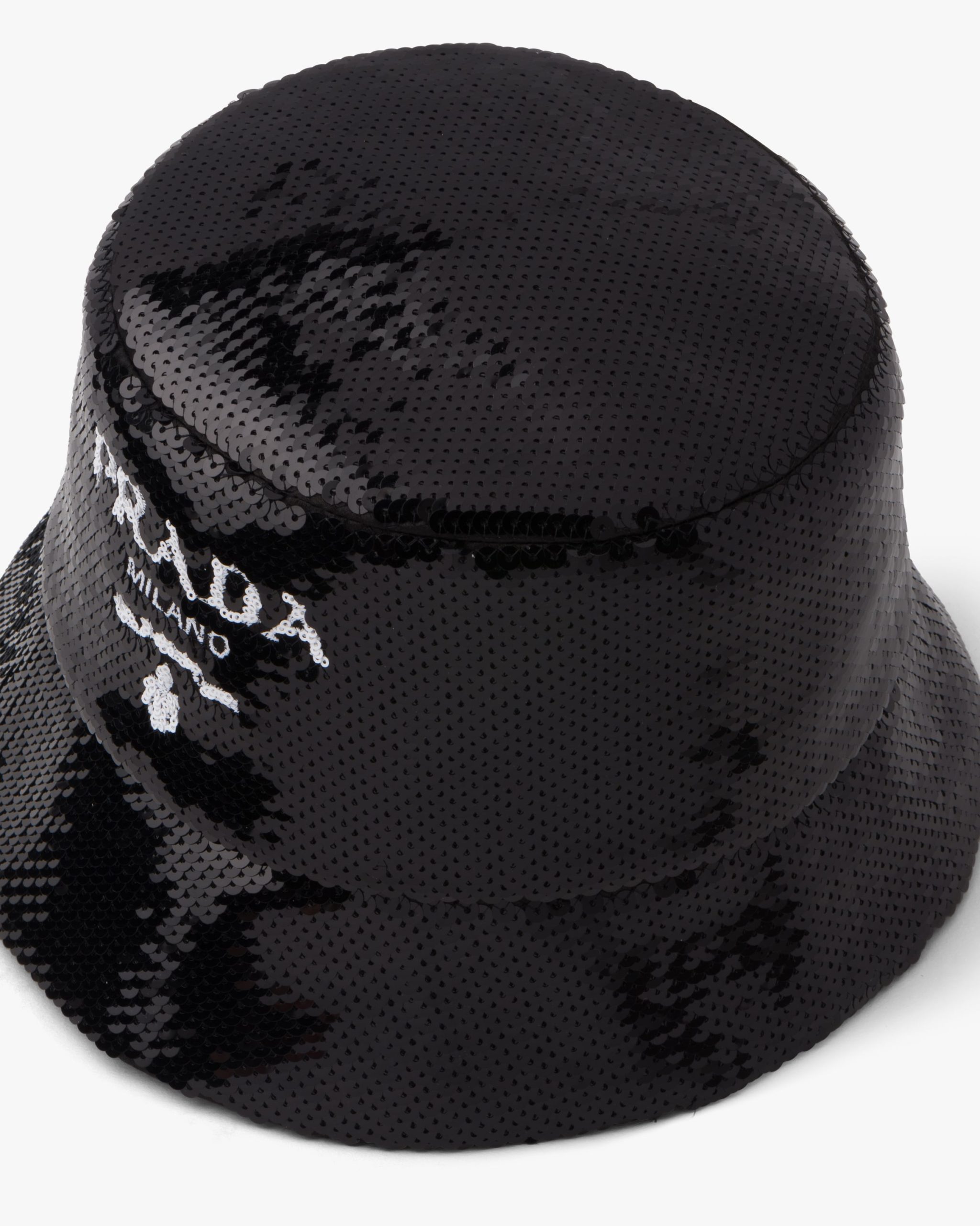 The bucket hat, an iconic accessory of Prada collectsions inspired by the streetwear world, is reimagined in a luxurious version, covered with all-over sequins that create plays of light and iridescent glimmers on the surface. The embroidered Prada lettering logo adds a contemporary touch.