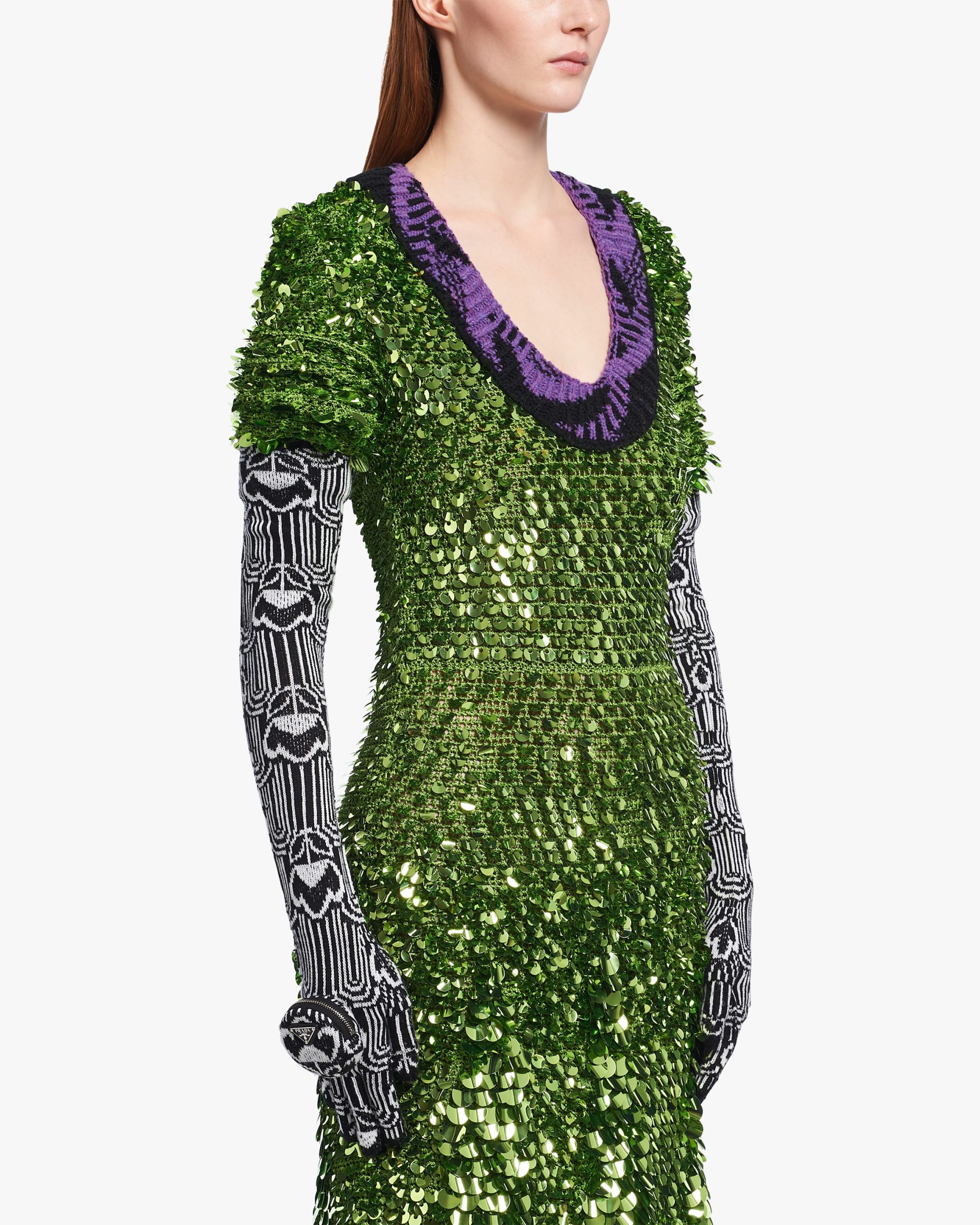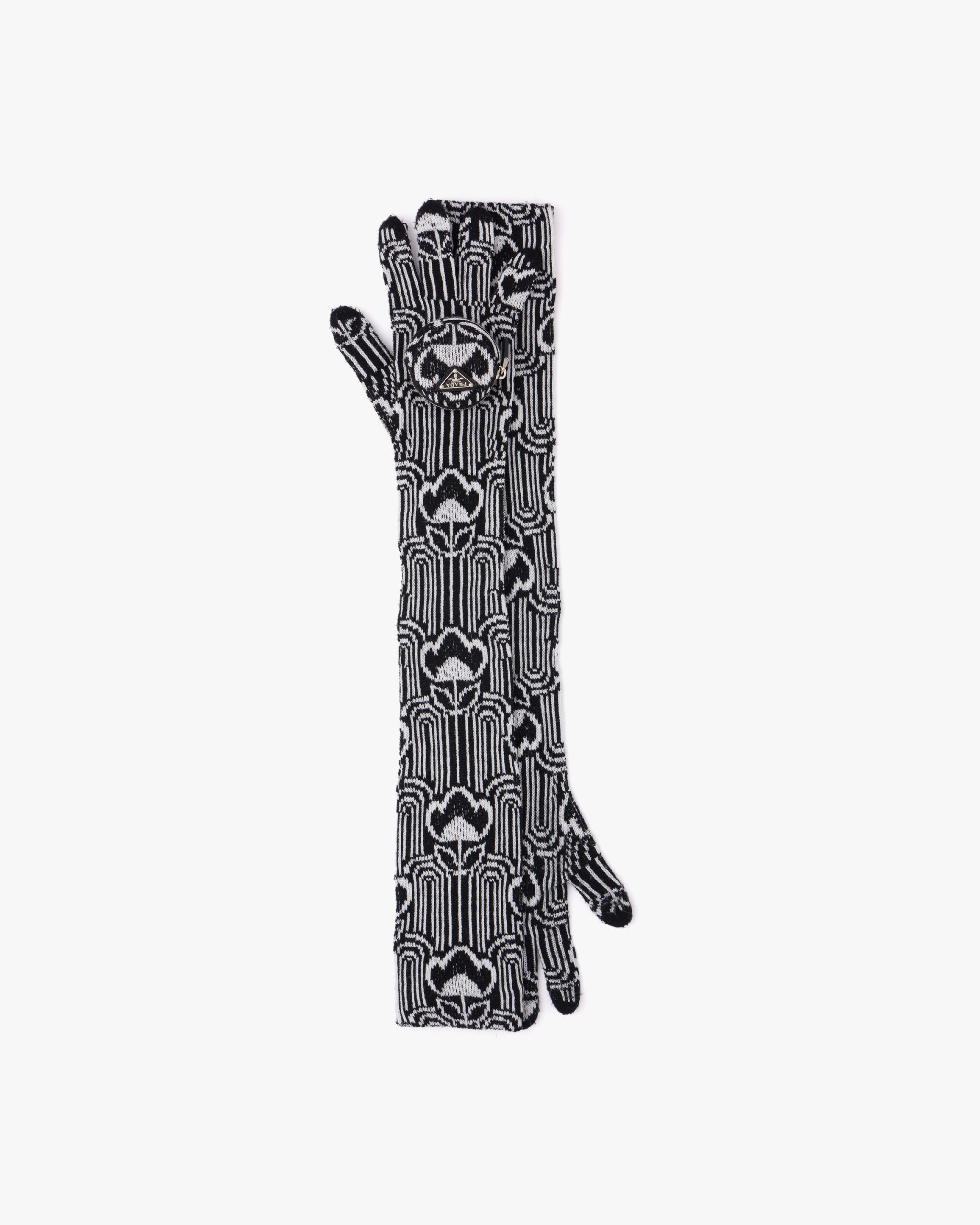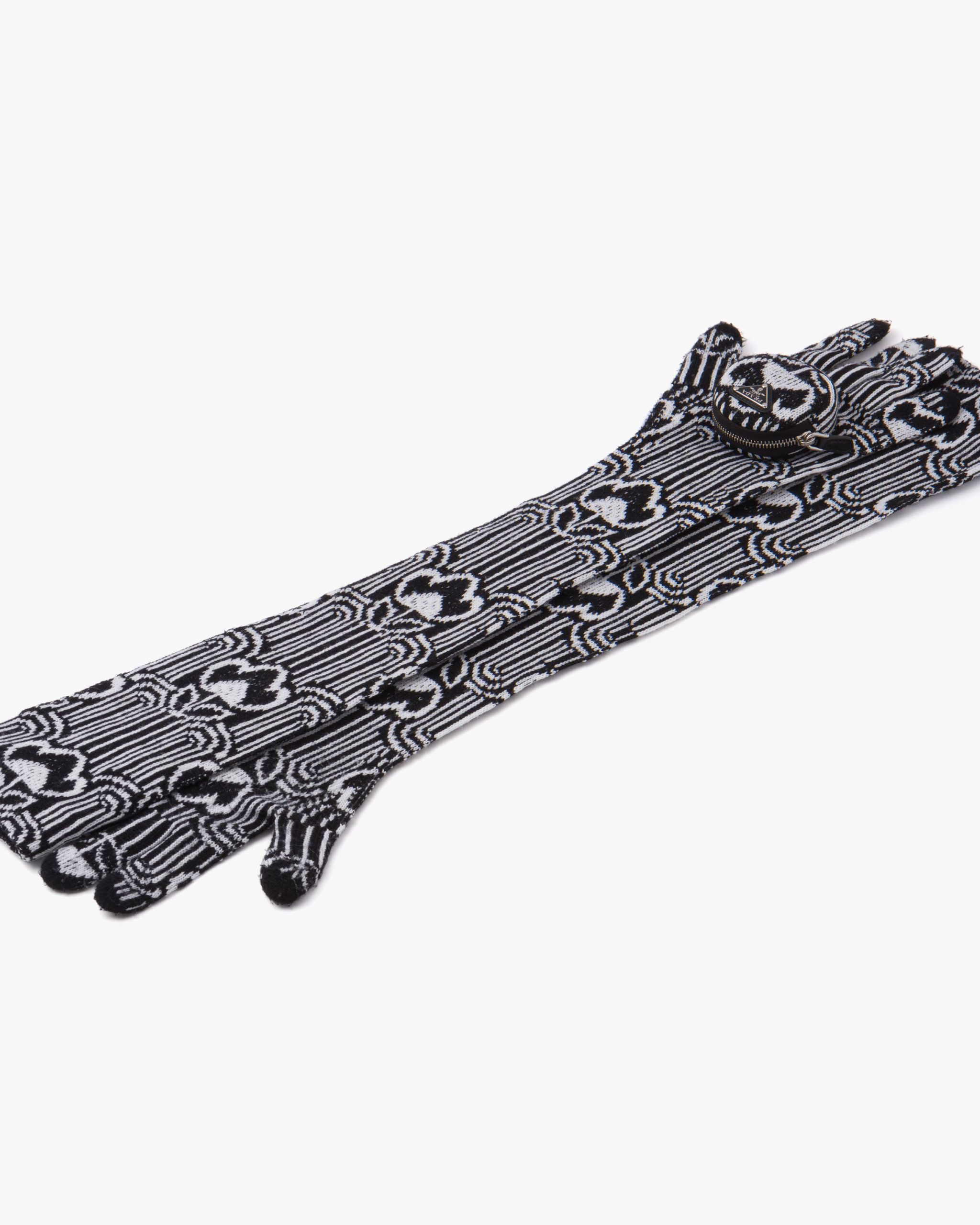 A study of the triangle inspires new geometric details and unique interpretations of the historic Prada logo. The iconic shape is evoked by the pouch decorating these gloves. Geometric jacquard motifs recalling designs of the sixties adorn wool garments with a slim fit that creates a fluid second skin effect, marking a return to physicality by outlining the figure in dynamic movement. Characterized by fine jacquard workmanship, these long gloves are part of a line of knit garments and accessories with a soft, casual look that plays with layering and explores the pleasure of tactility.