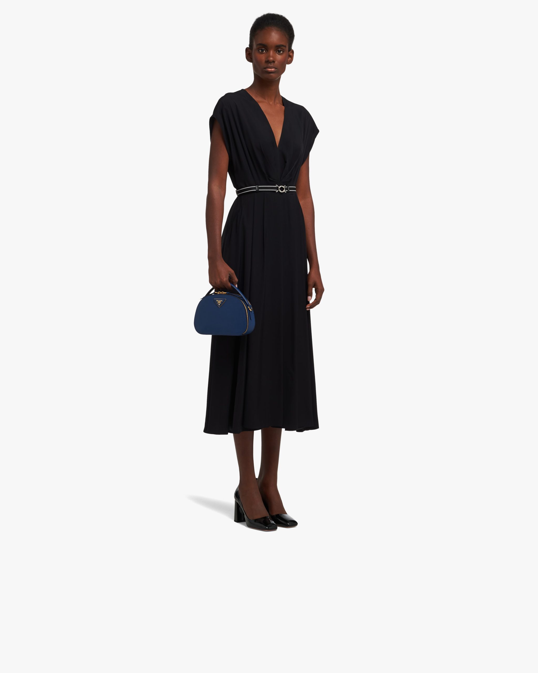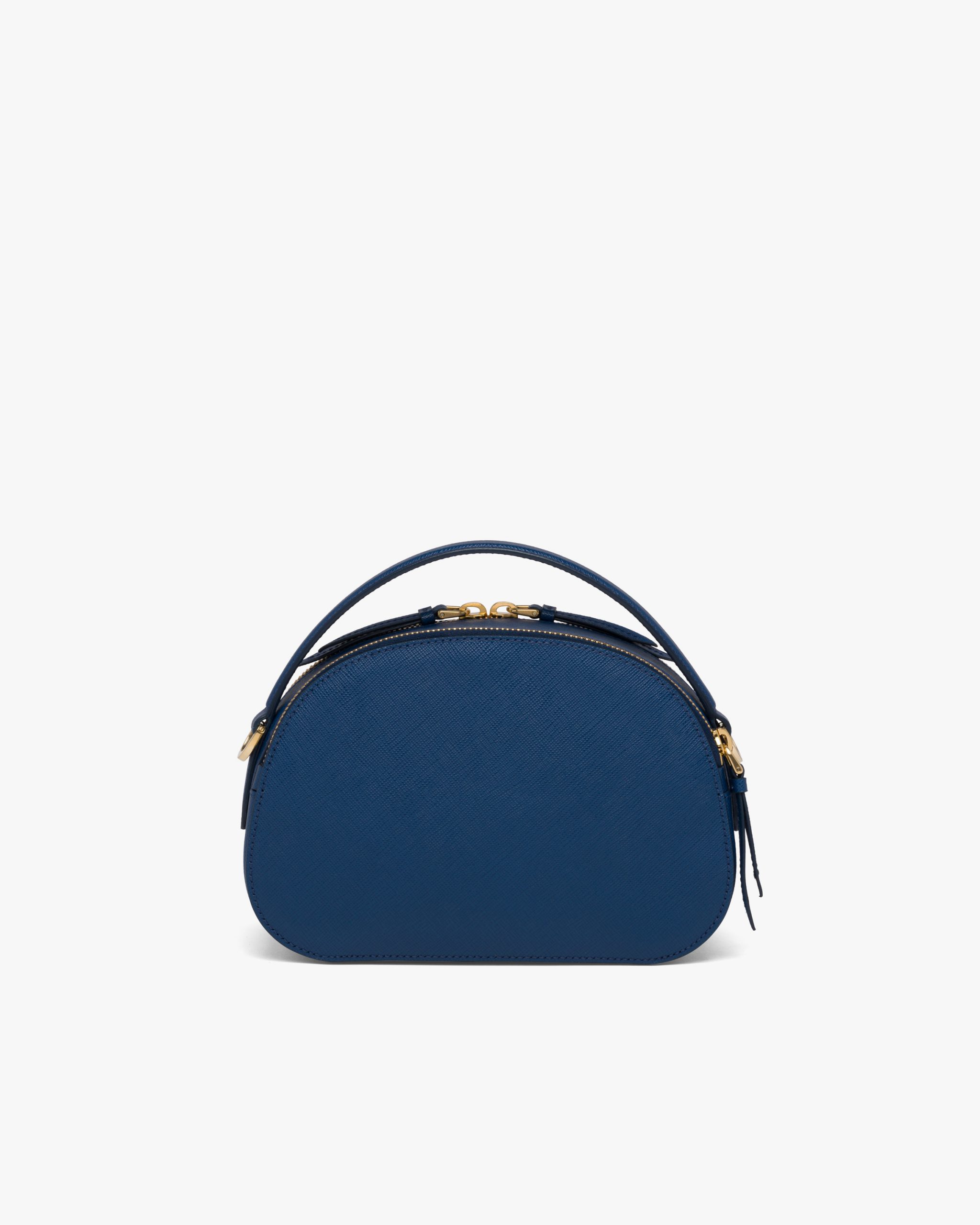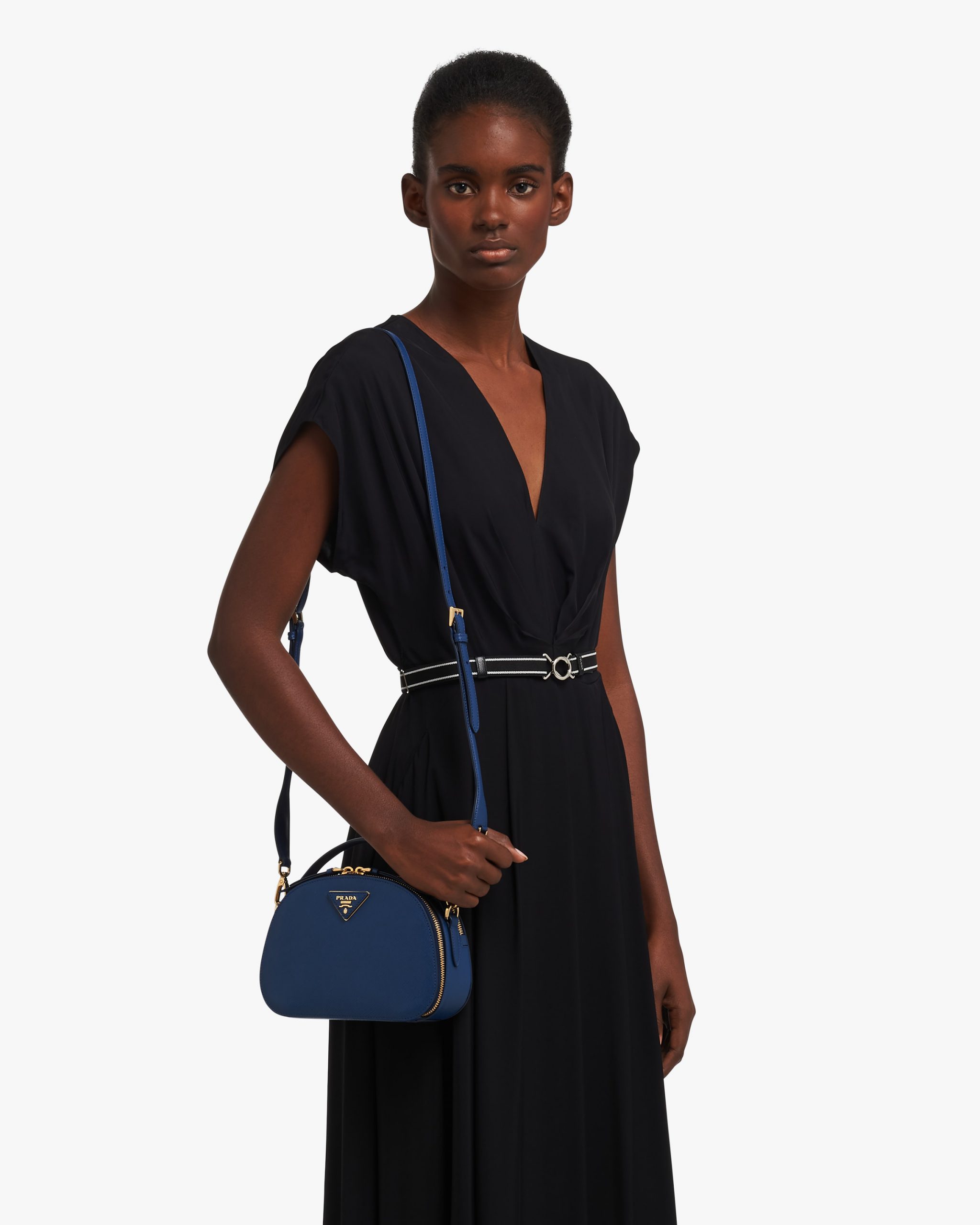 The rounded design of the Prada Odette bag is inspired by photographers’ camera cases. Made of fine Saffiano leather and decorated with the iconic triangle logo, the bag can be carried by hand or worn with a shoulder strap.