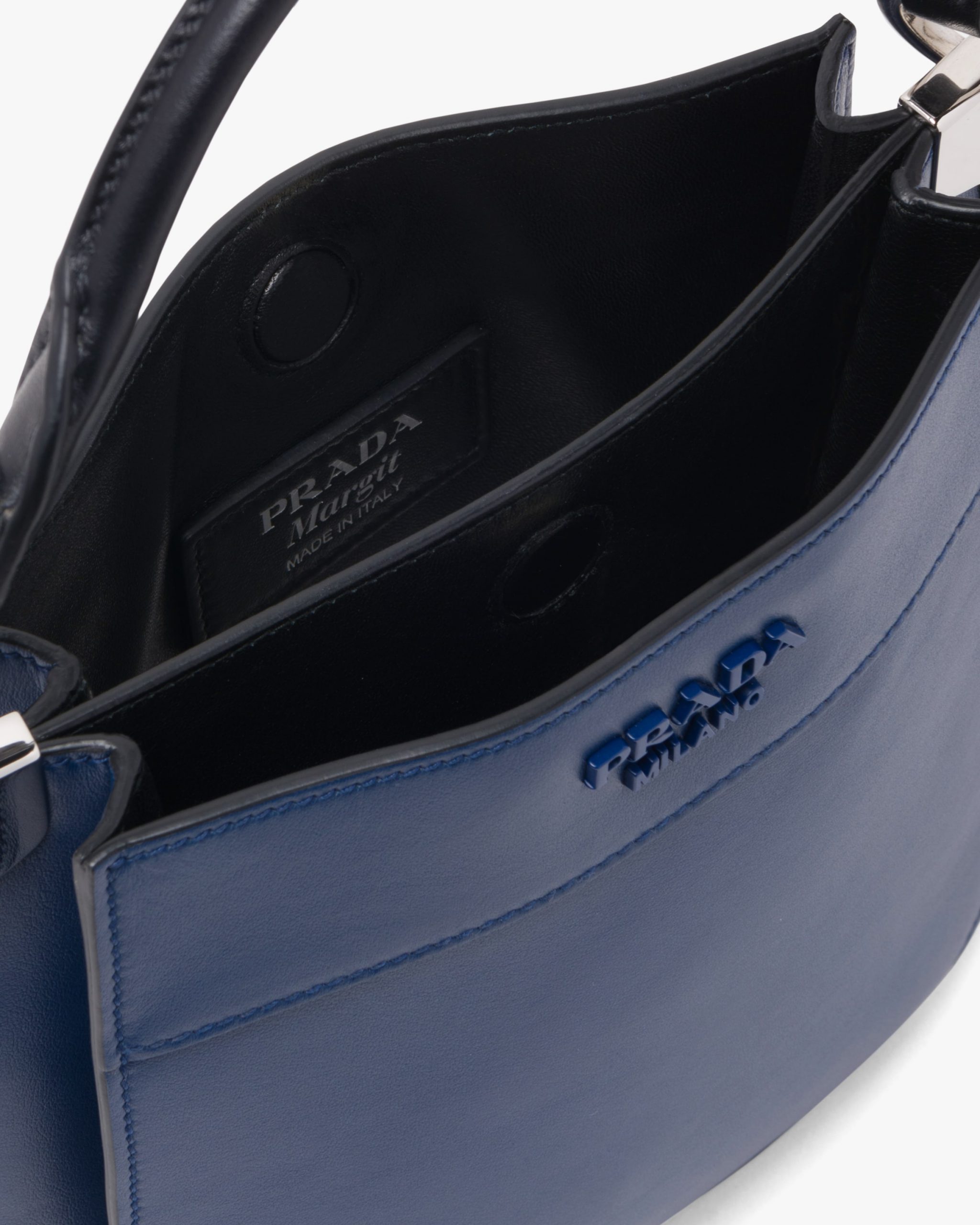 The curvy line of its silhouette distinguishes the Prada Margit handbag. The leather bag has two internal compartments and the metal lettering logo.