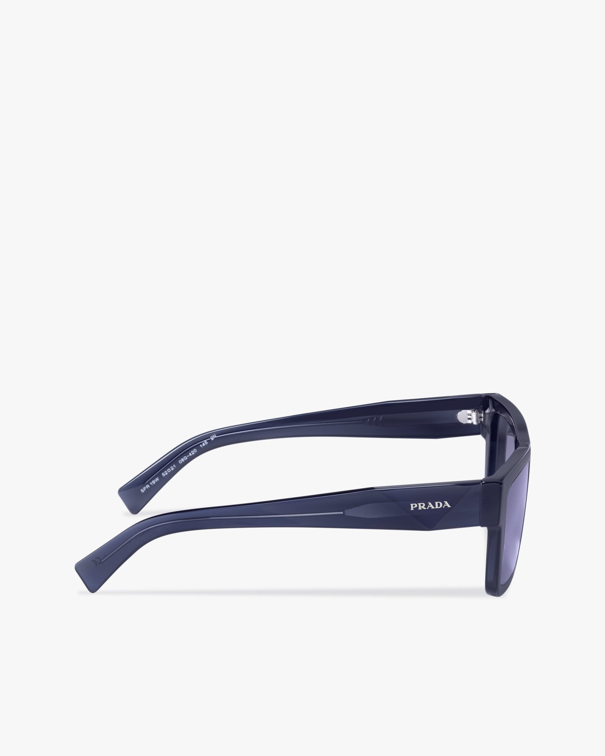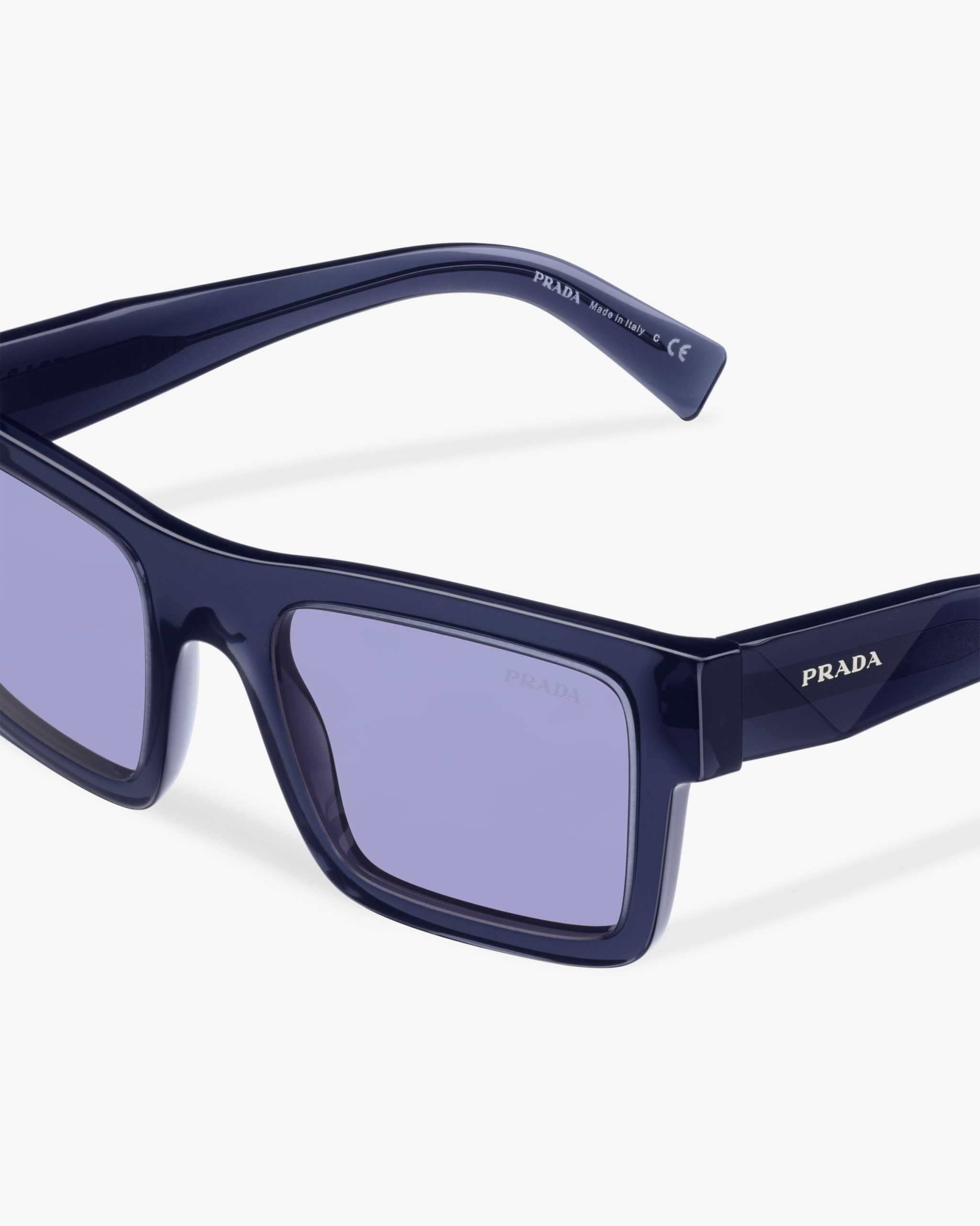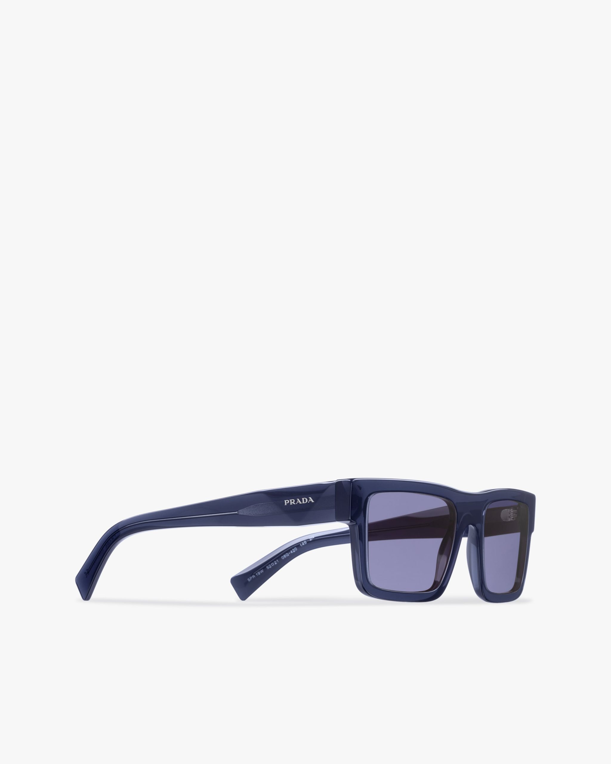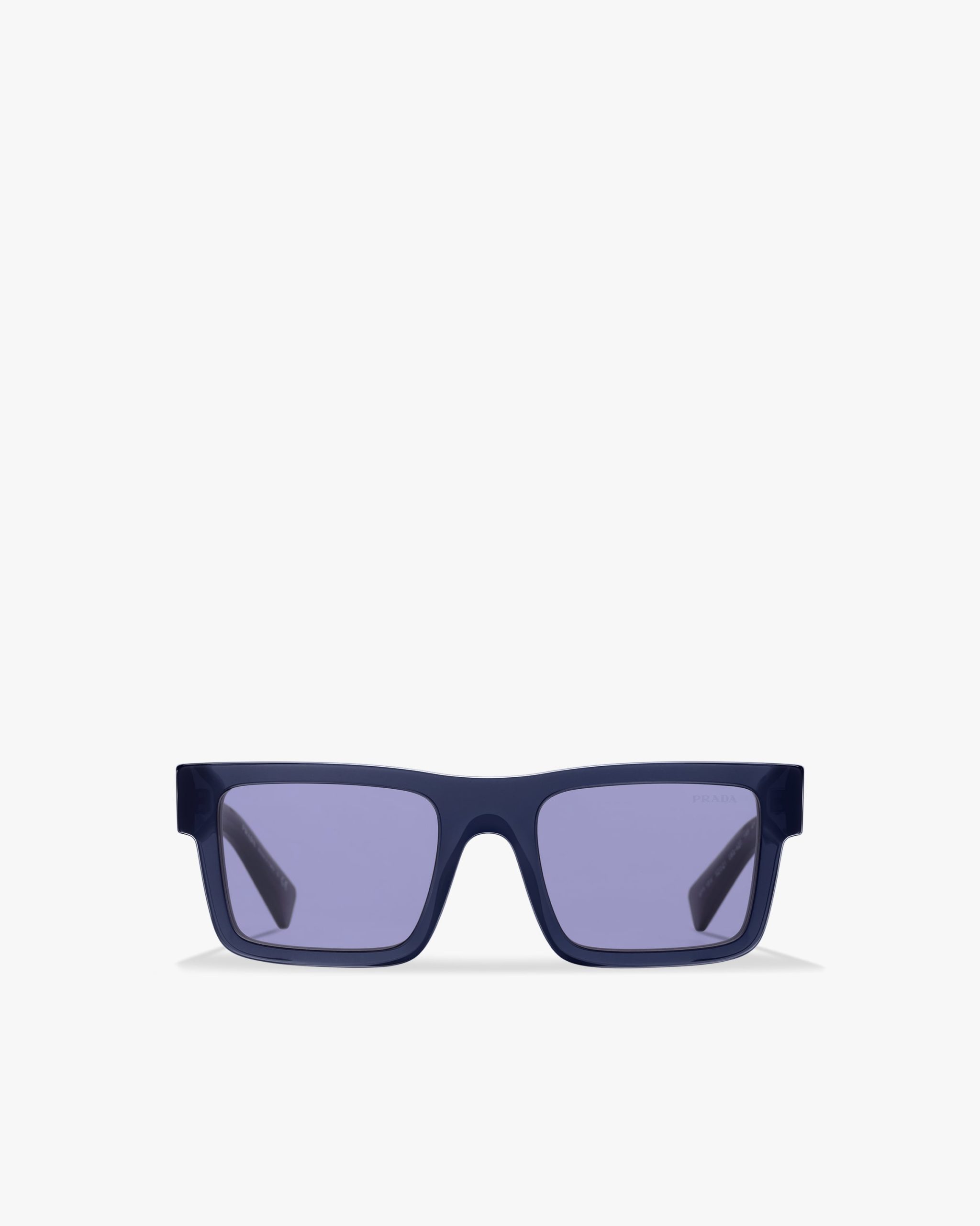 Rectangular acetate sunglasses characterized by strong lines and elegant, contemporary charm. The temples made with a sophisticated three-dimensional process are decorated with the Prada lettering logo.
