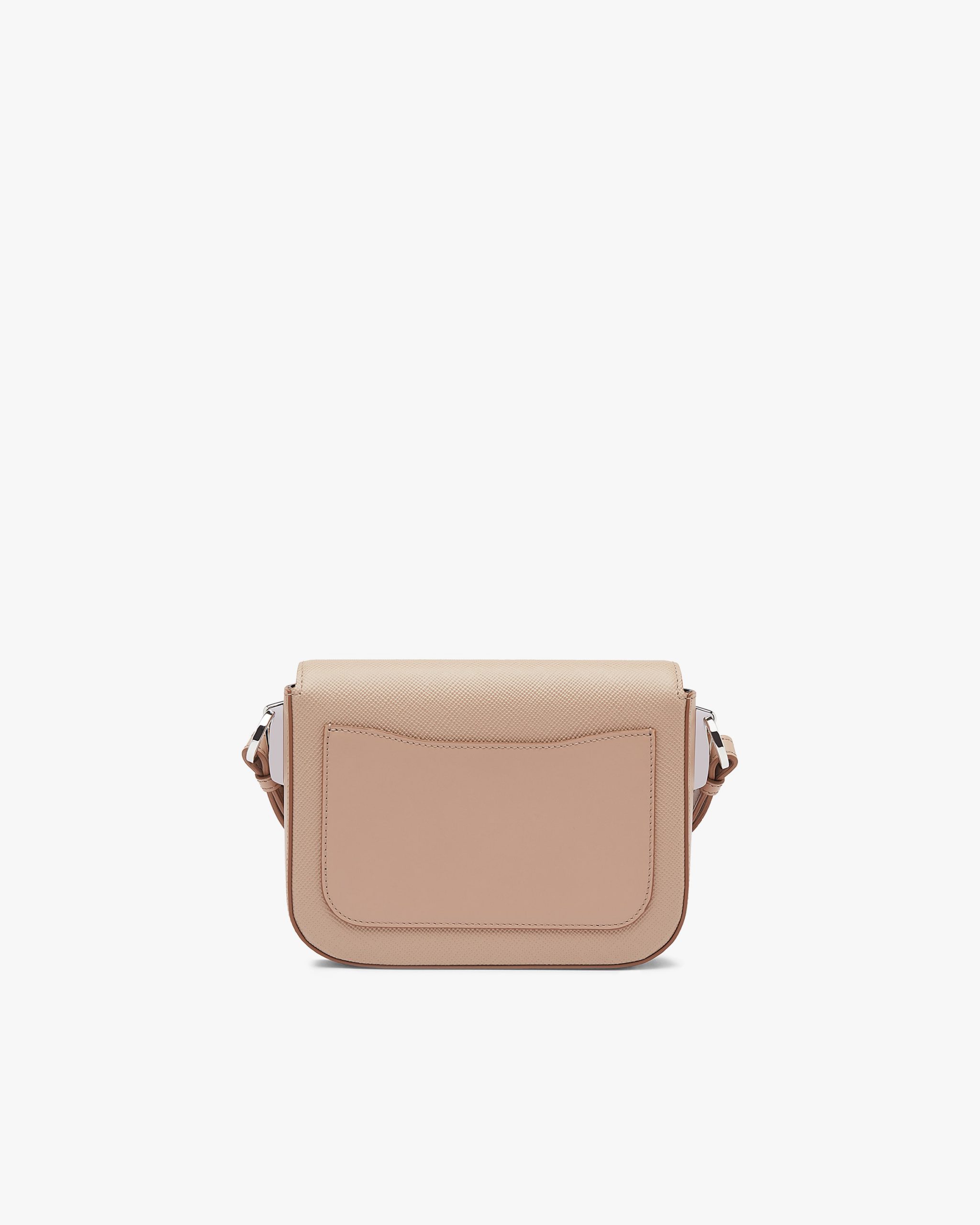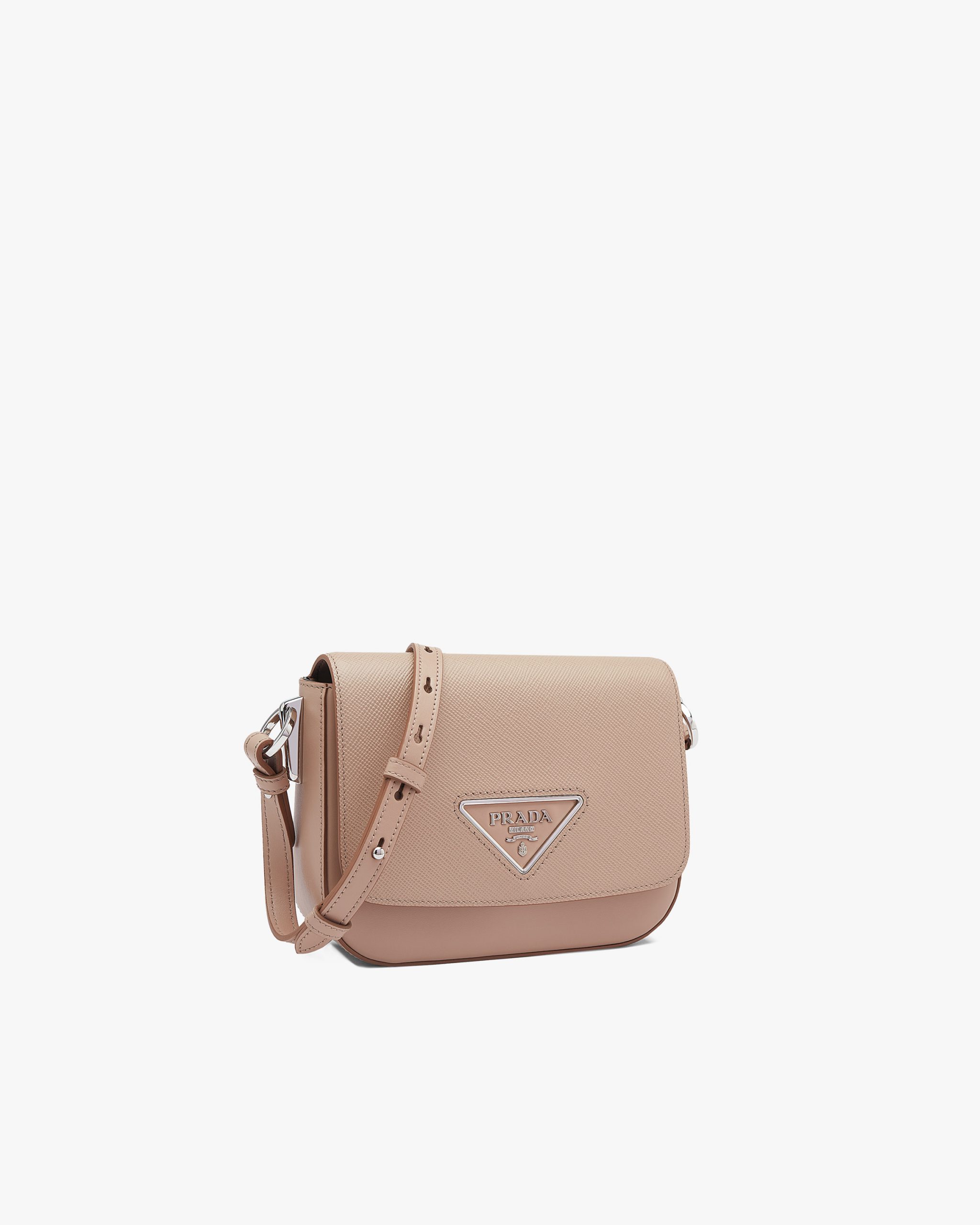 The minimalist design of this shoulder bag in Saffiano leather, a signature material of the brand, is enhanced with sophisticated details such as the triangle logo on the flap.