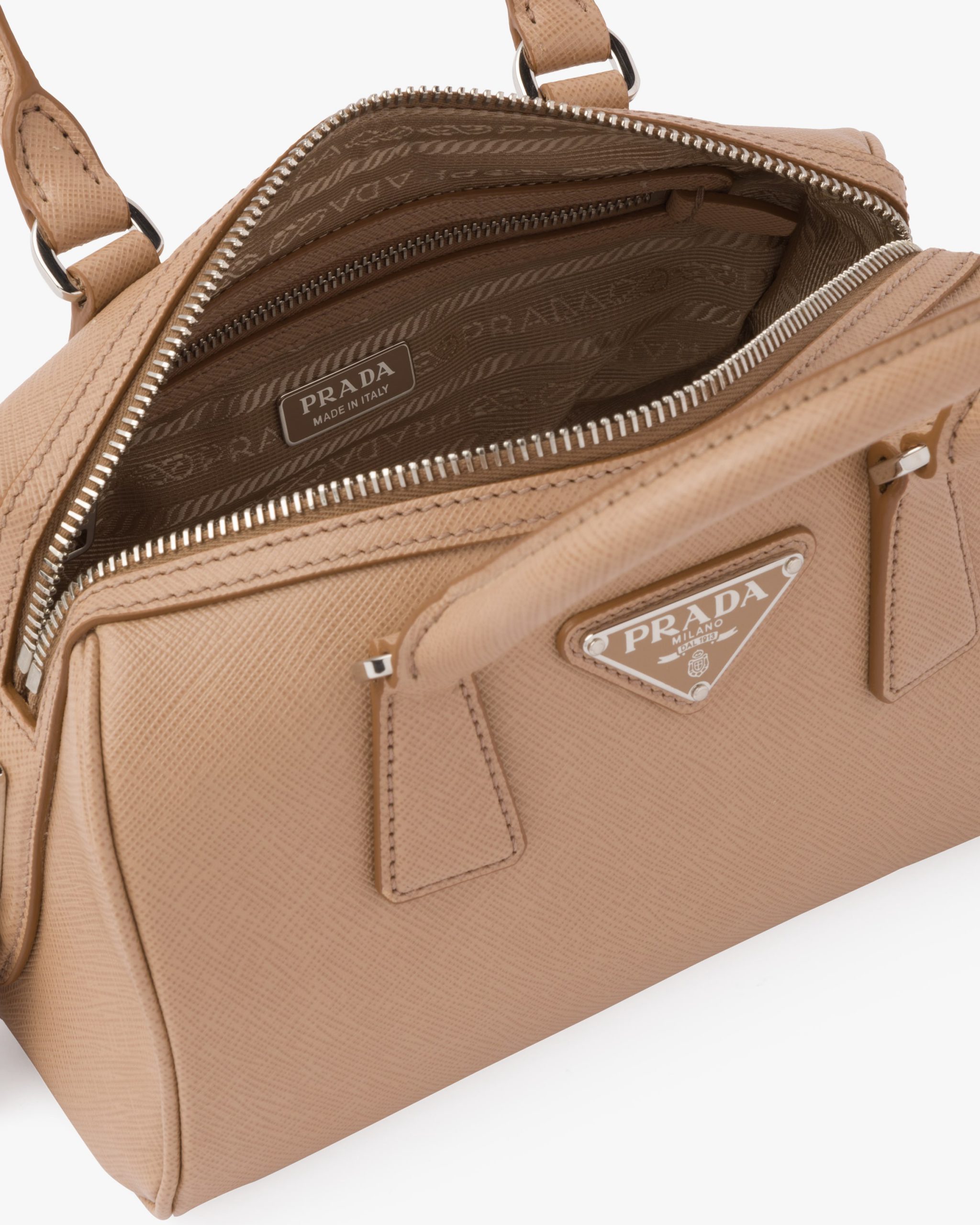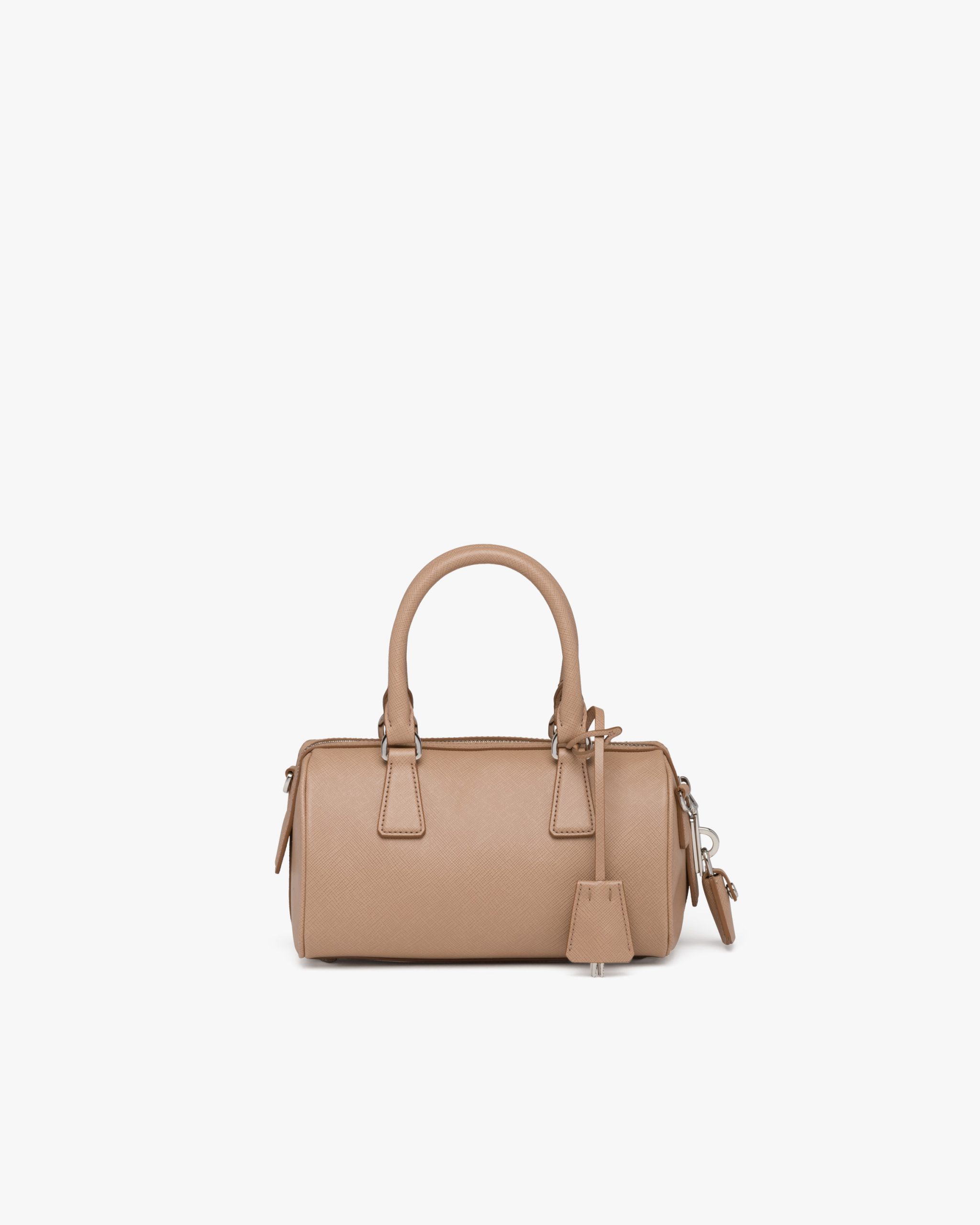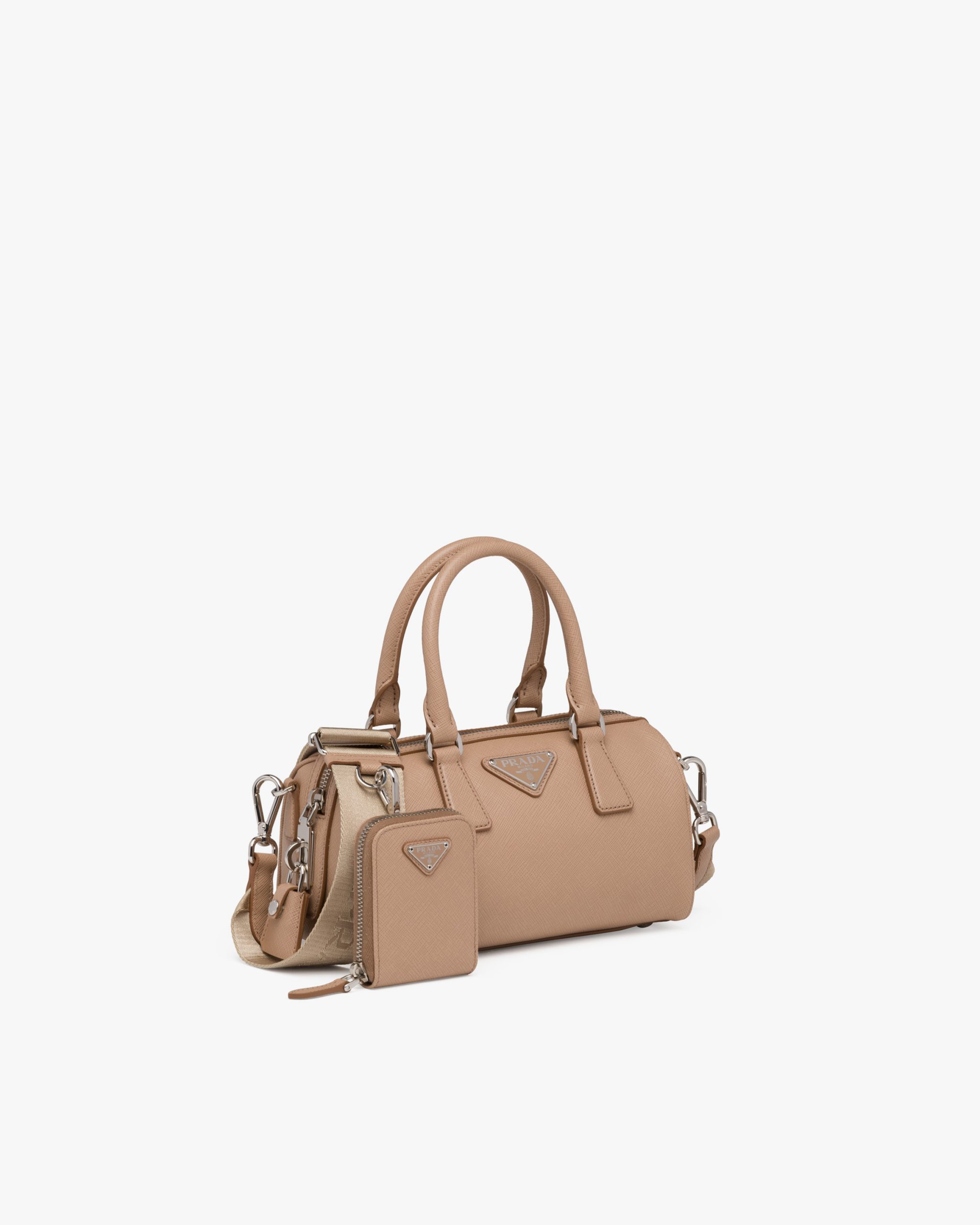 Made of iconic Saffiano leather, a distinctive motif of the brand, this top-handle bag combines a classic silhouette and modern, functional details. Thanks to the detachable nylon shoulder strap and removable nylon pouch, the bag can be transformed and adapted for different occasions.