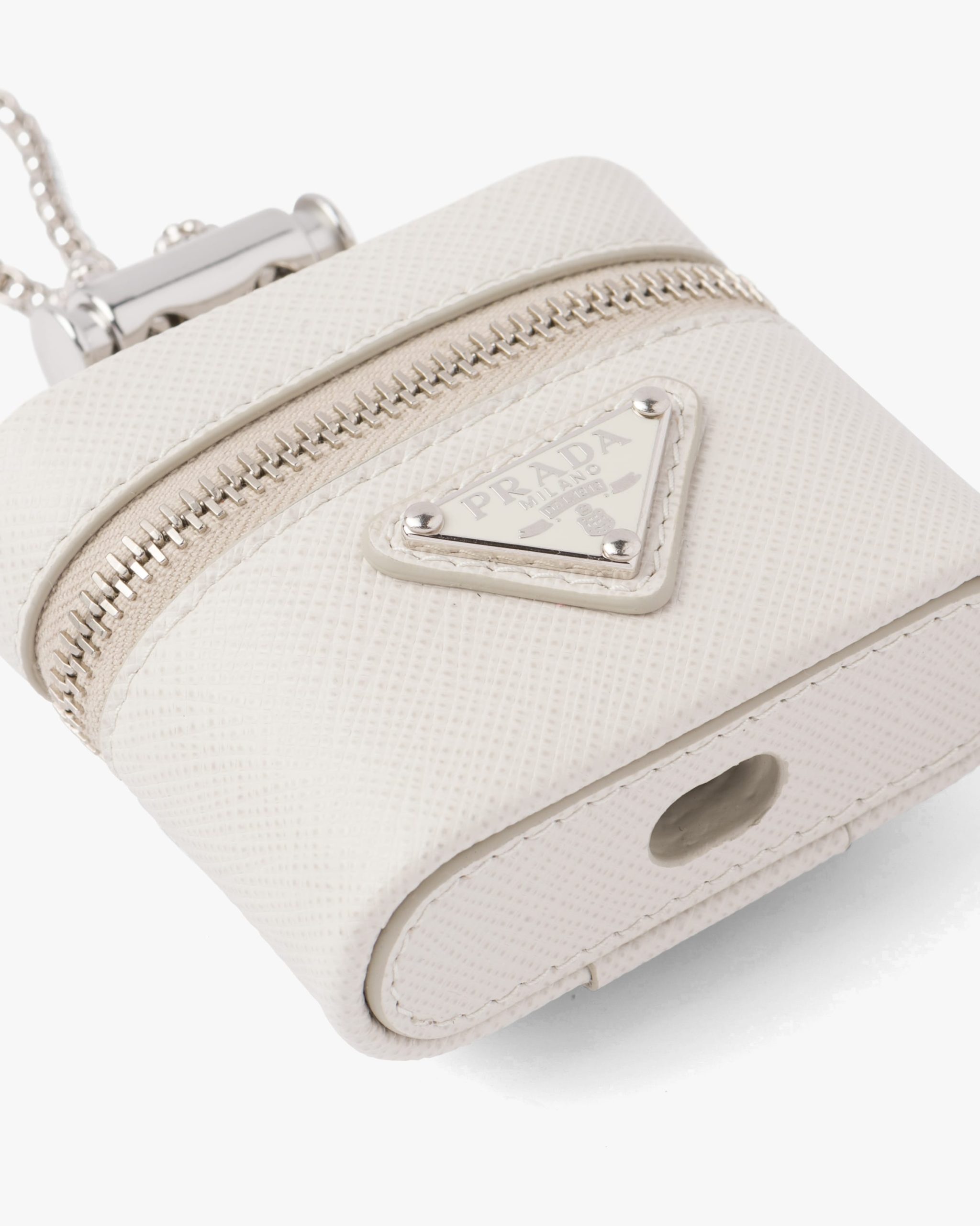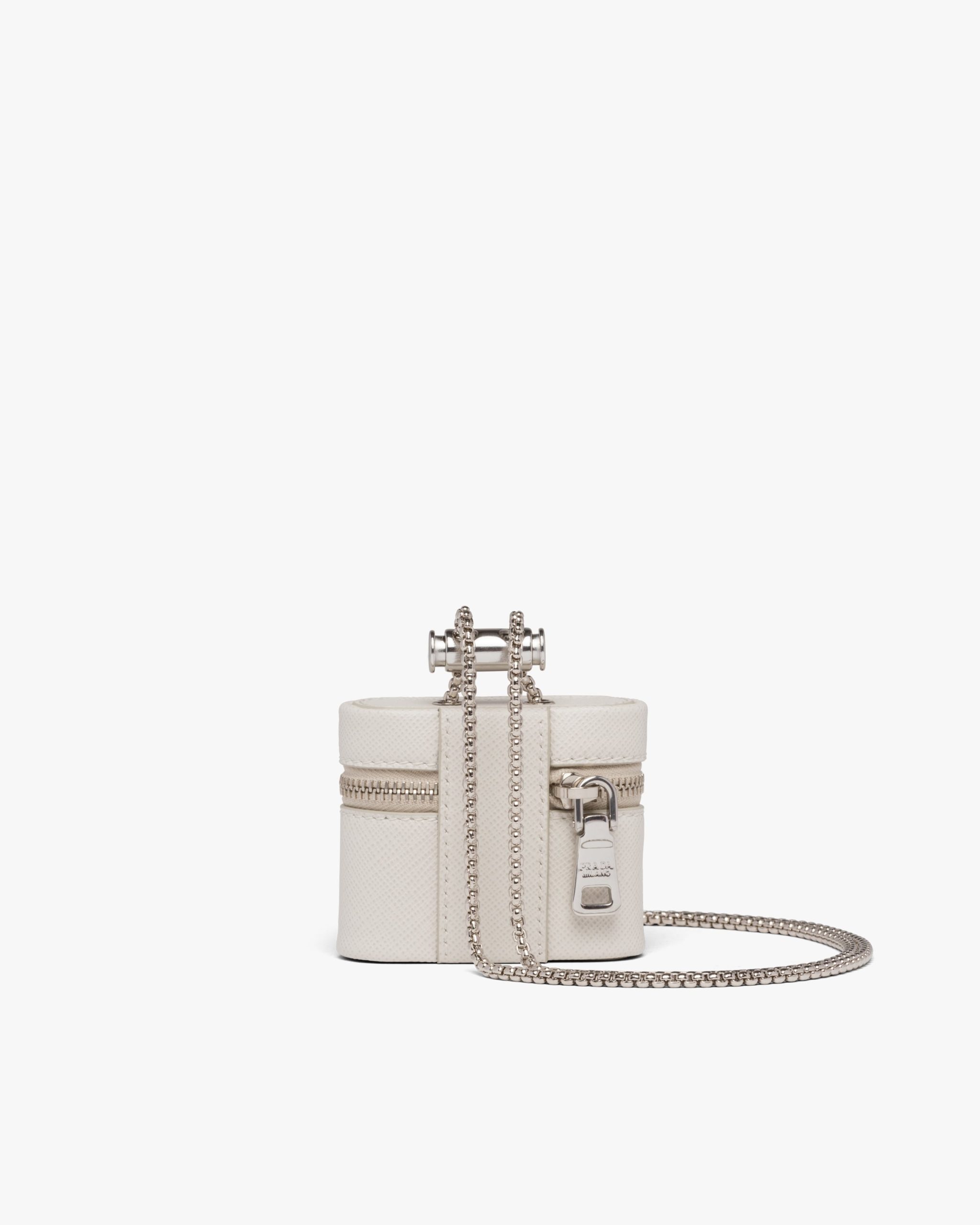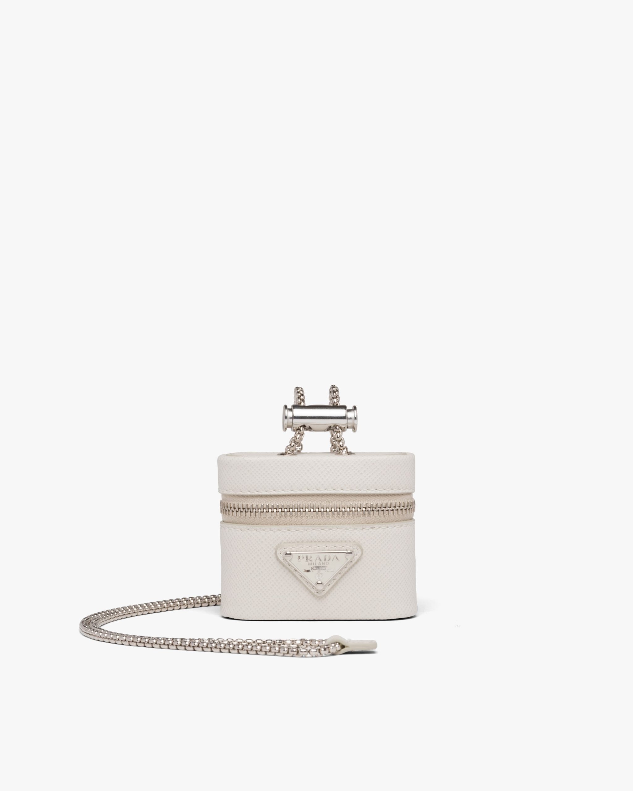 A contemporary and versatile accessory, this mini-pouch is made of Saffiano, an iconic material of Prada: calf leather of the highest quality defined by the crosshatch texture and waxed finish. The enameled metal triangle logo accents the design, completed by an adjustable chain for wearing it different ways.