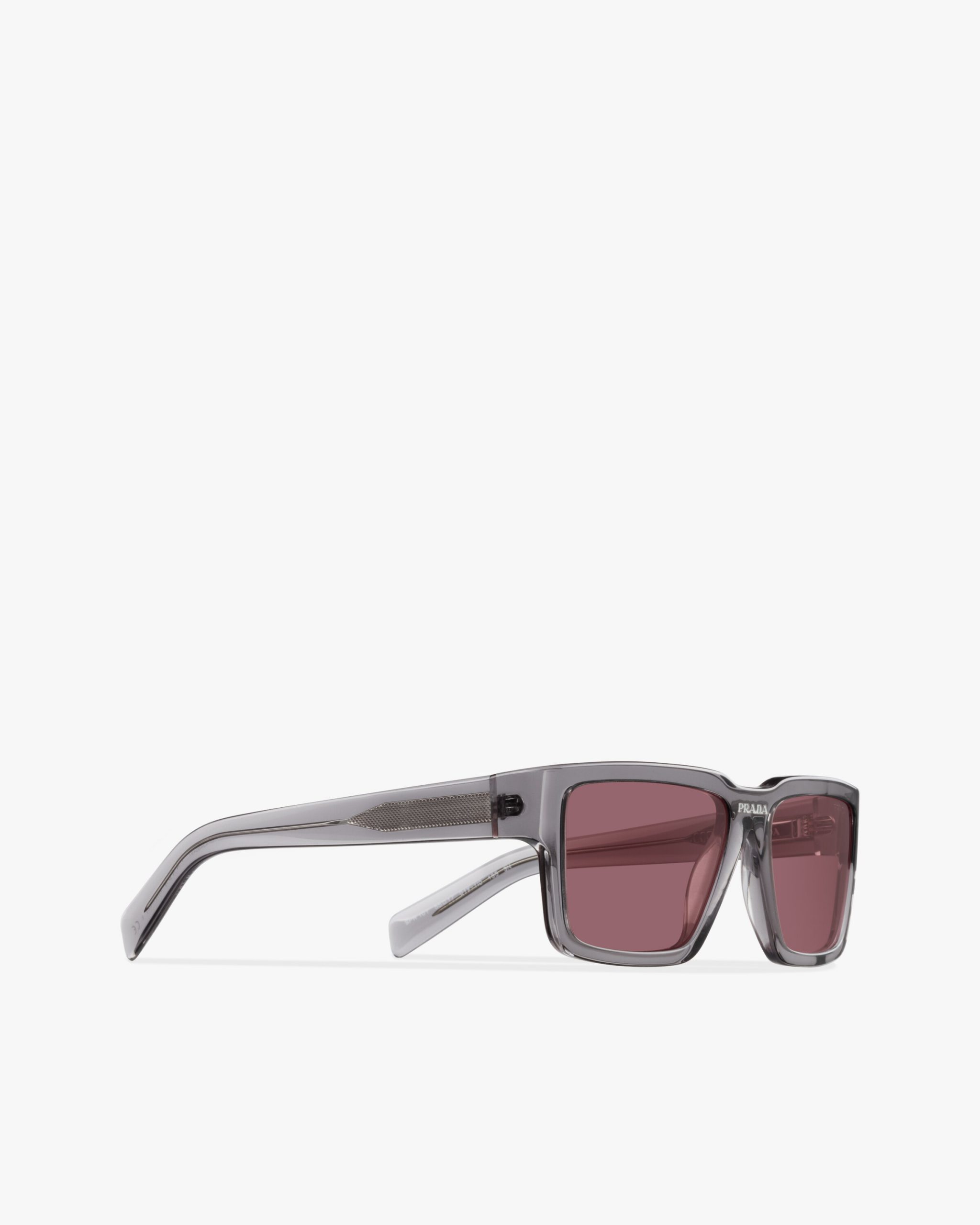Rectangular acetate sunglasses available in exclusive transparent shades. The contemporary, slightly curved frame front is paired with wide temples that reveal metal details. The bridge area features the Prada lettering logo and was redesigned to iconographically reinterpret the maison’s historic triangle logo.