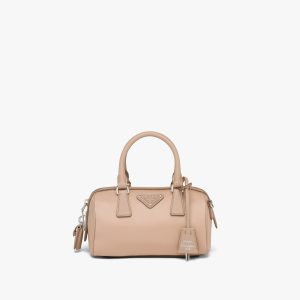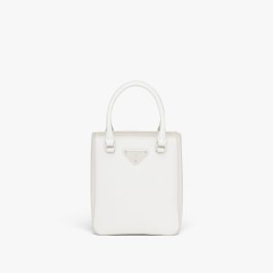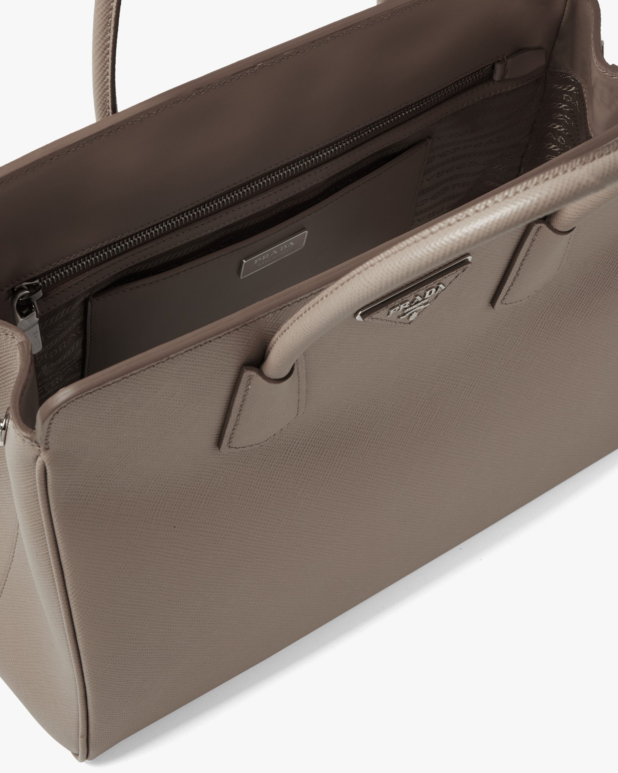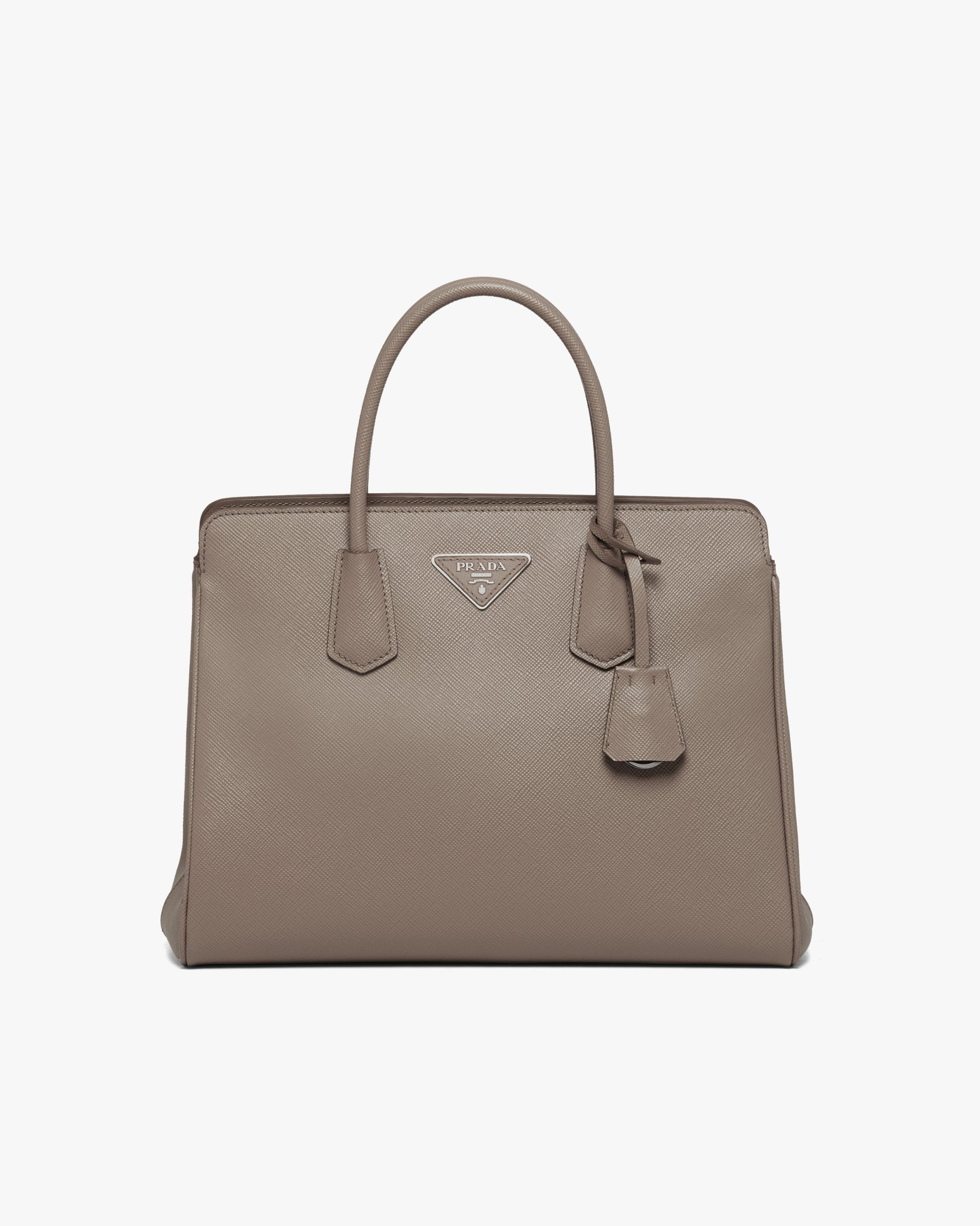 This handbag with a classic, structured design is made of Saffiano leather, an iconic material of the brand characterized by the crosshatch motif and waxed finish. The triangle logo, first introduced on the trunks designed by Mario Prada, decorates the front. The accessory equipped with a double handle and detachable leather shoulder strap can be worn in several ways.