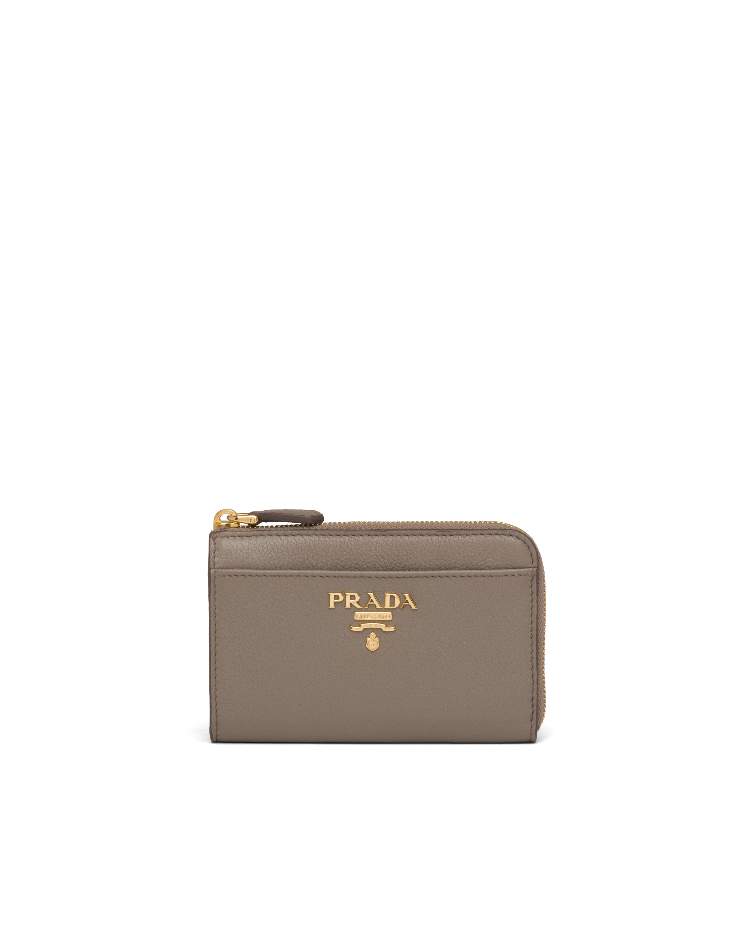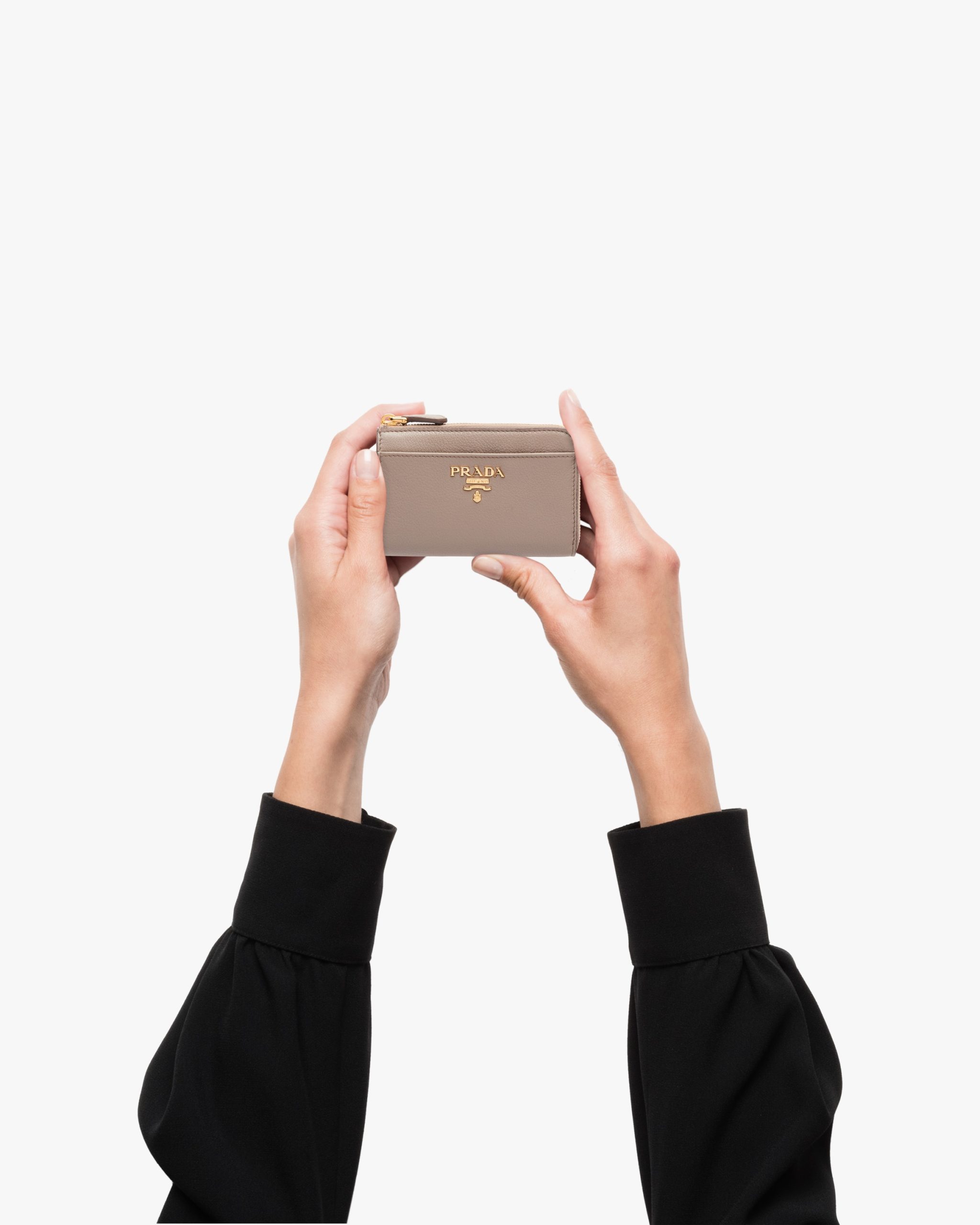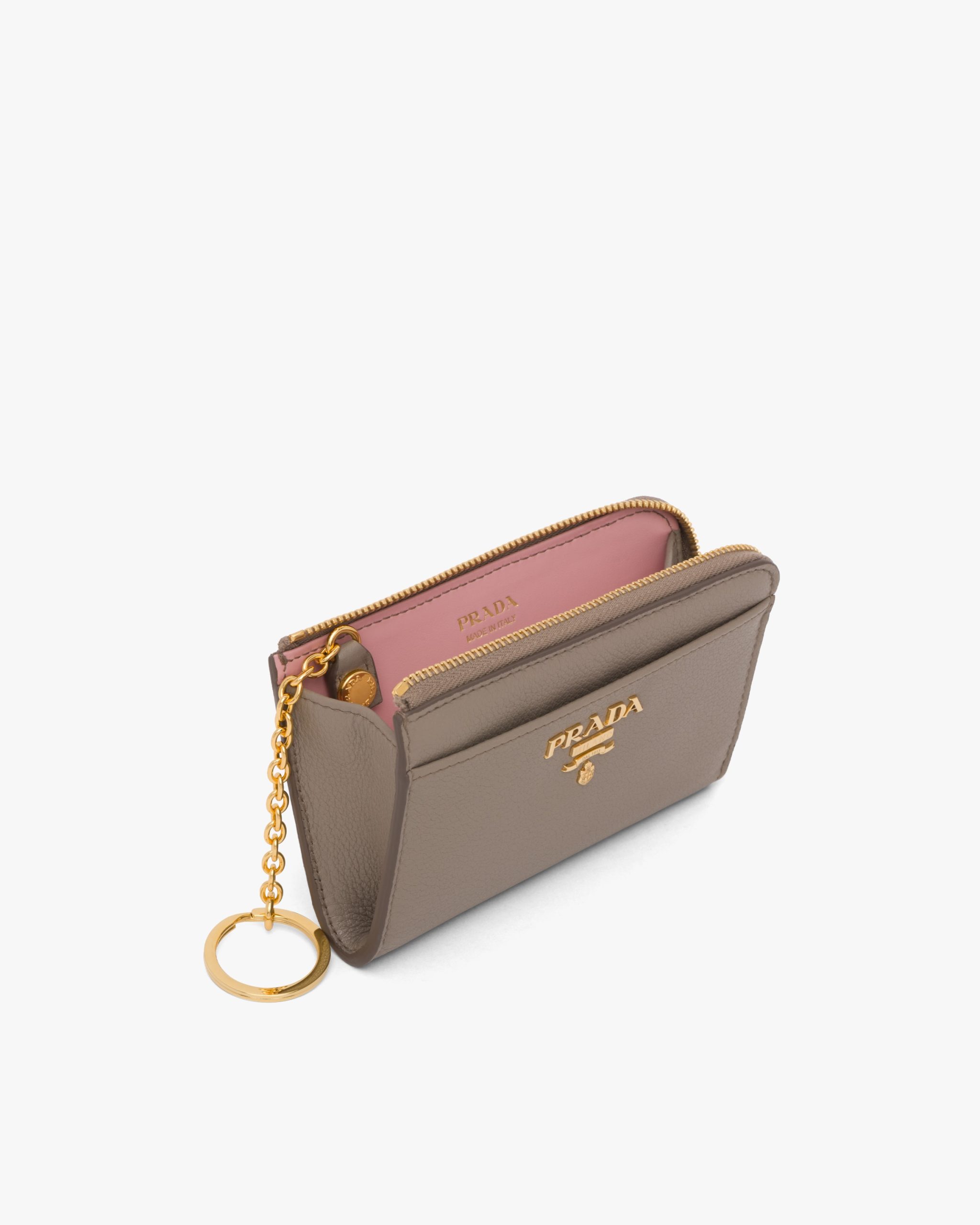 This elegant, compact leather keychain with zipper is brightened with metal hardware. Pockets and internal card slots emphasize its functionality. A metal logo decorates the accessory.