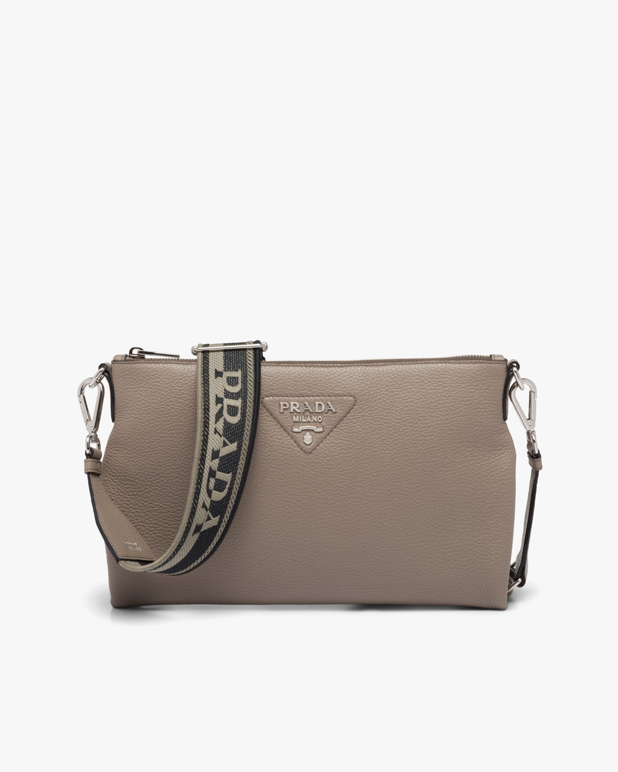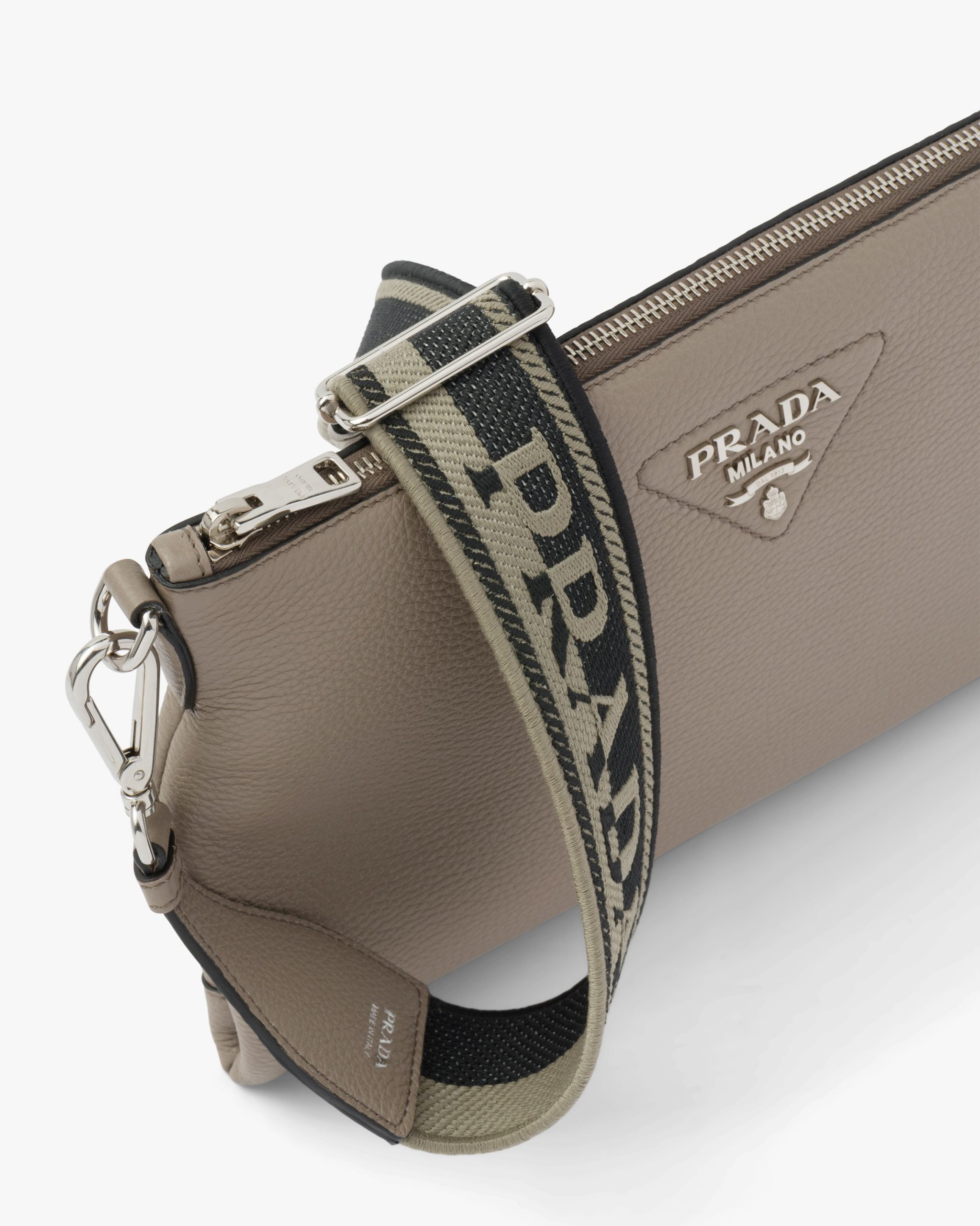 A geometric minimalist shape characterizes this Prada Flou small leather bag illuminated with the metal lettering logo on the front. The accessory is completed by the detachable woven tape shoulder strap embroidered with the logo in a contrasting color, that makes it wearable as a crossbody or shoulder bag.