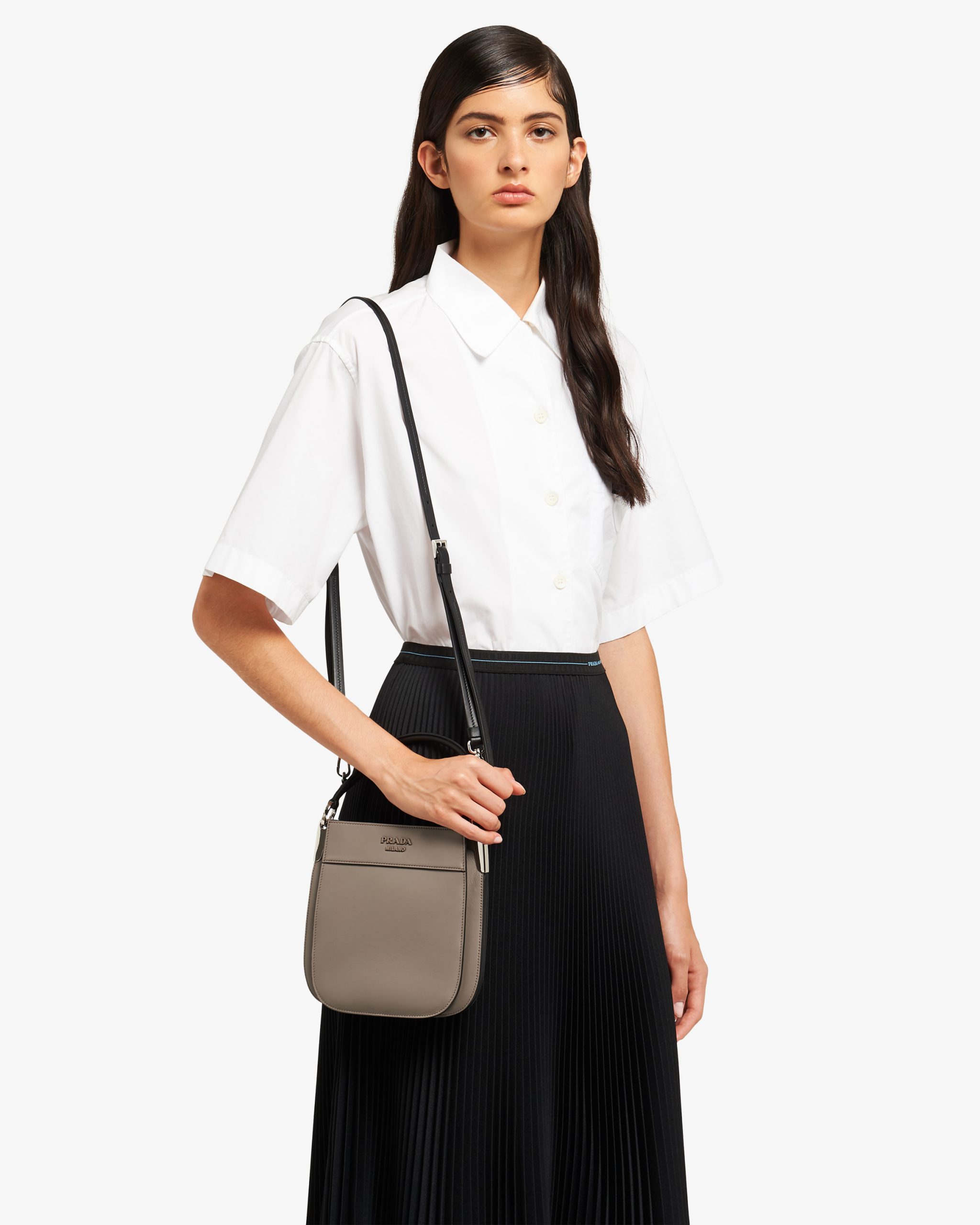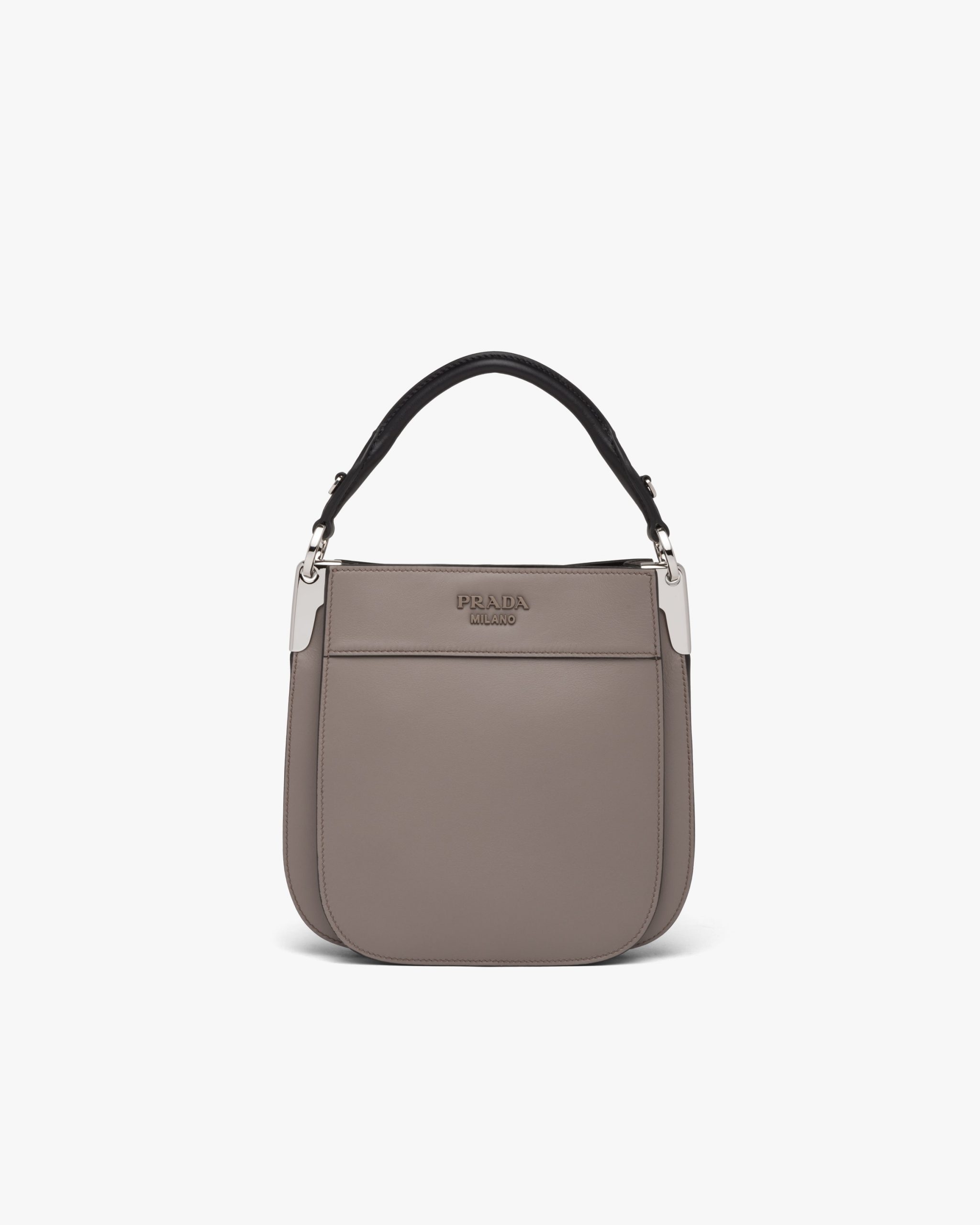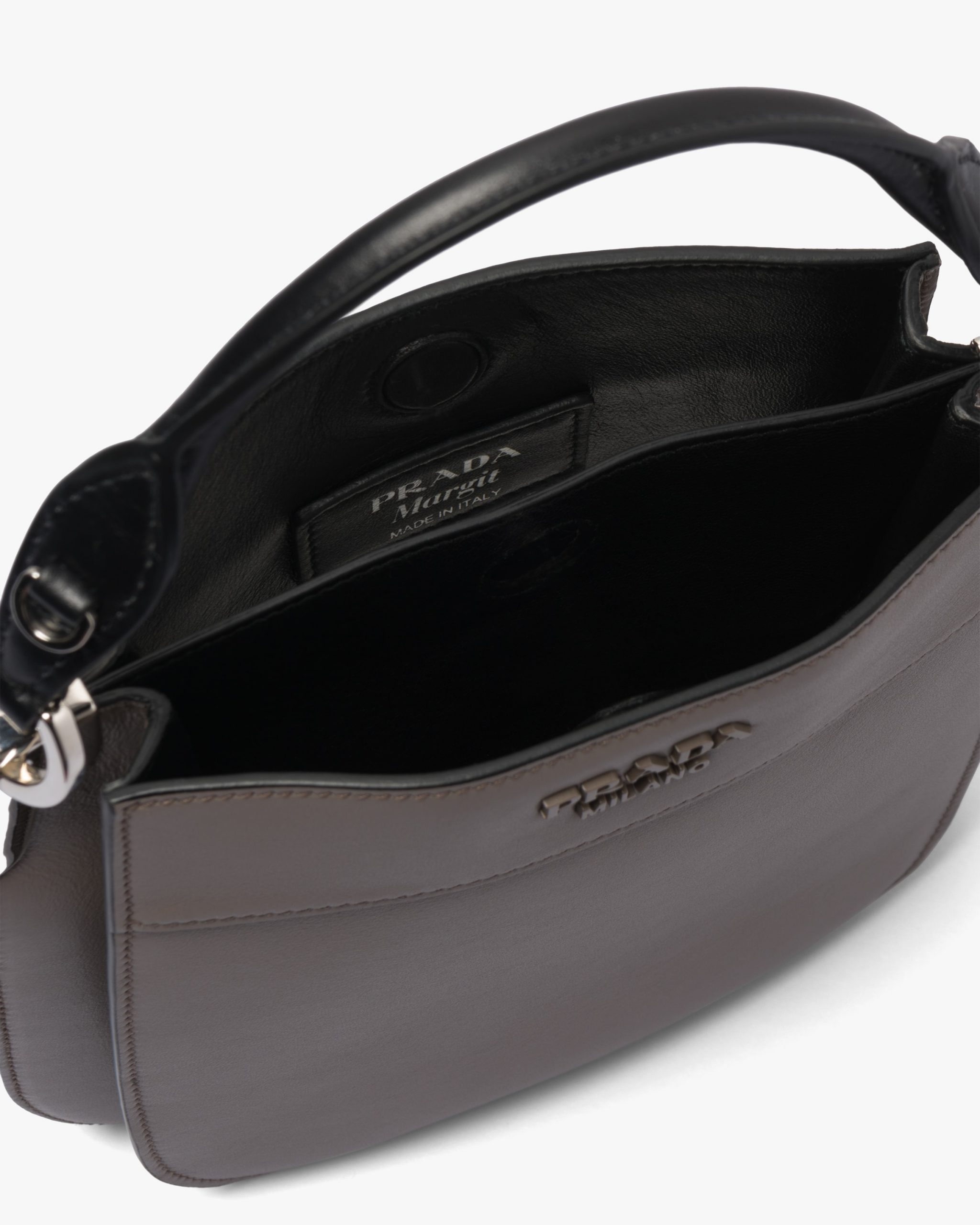 The curvy line of its silhouette distinguishes the Prada Margit handbag. The leather bag has two internal compartments and the metal lettering logo.