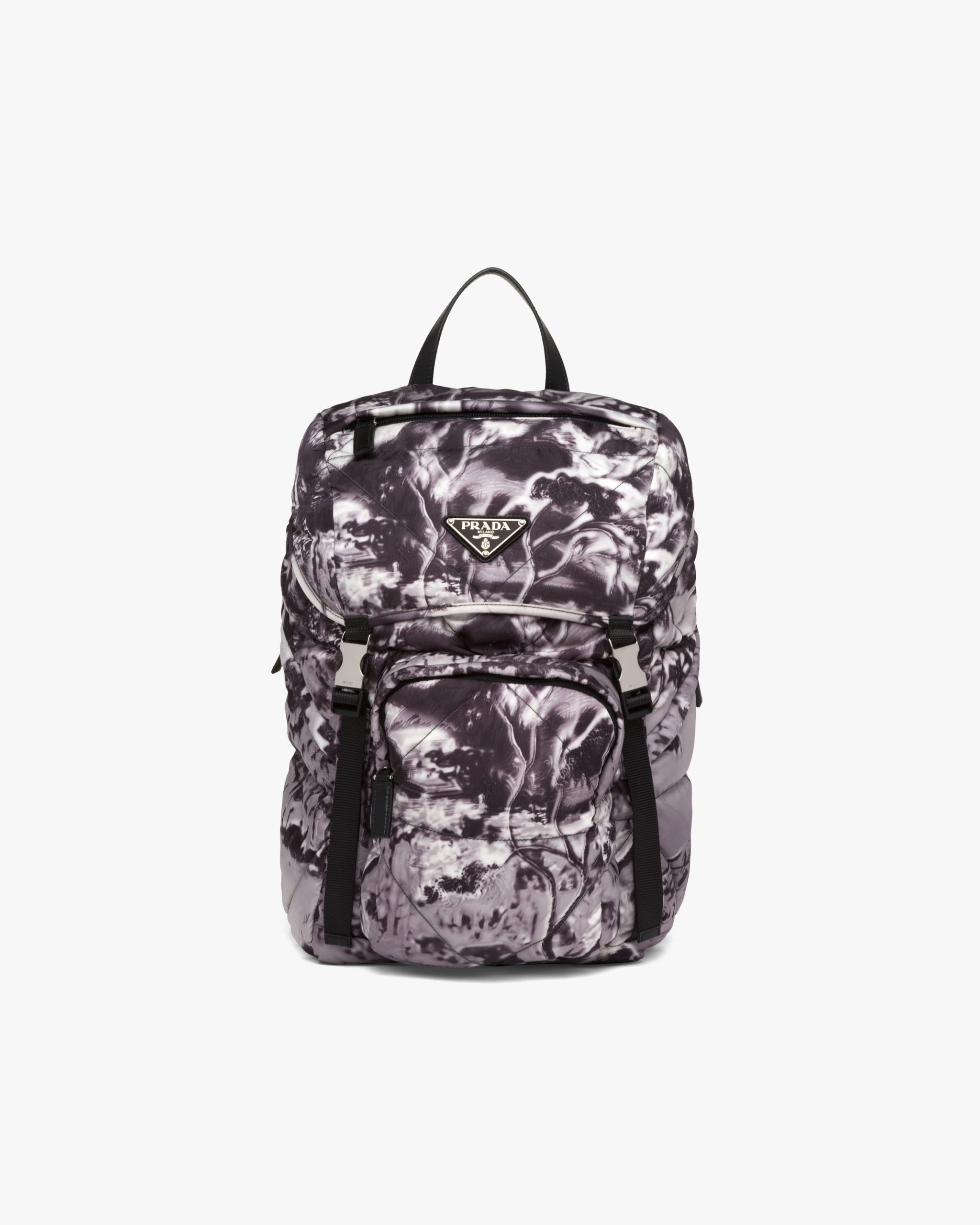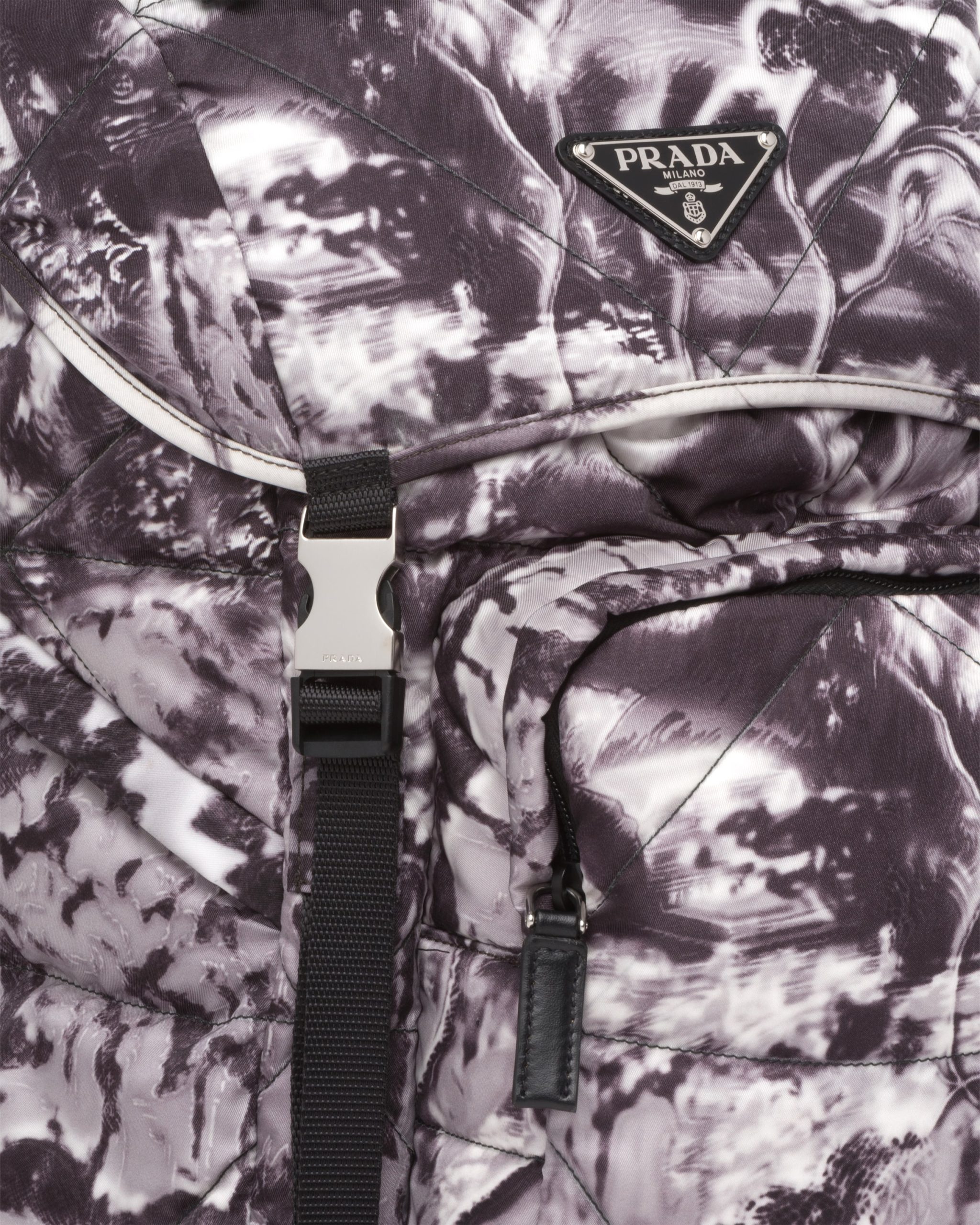 The ?Temples? print, one of the brand’s archive patterns, decorates this backpack made of Re-Nylon, an innovative regenerated material enhanced by the quilted motif inspired by the iconic triangle logo. Part of Prada’s genetic code, recognizable and timeless prints have identified the collectsions of the brand since the ’90s, creating bold combinations or emphasizing designs with traditional allure.