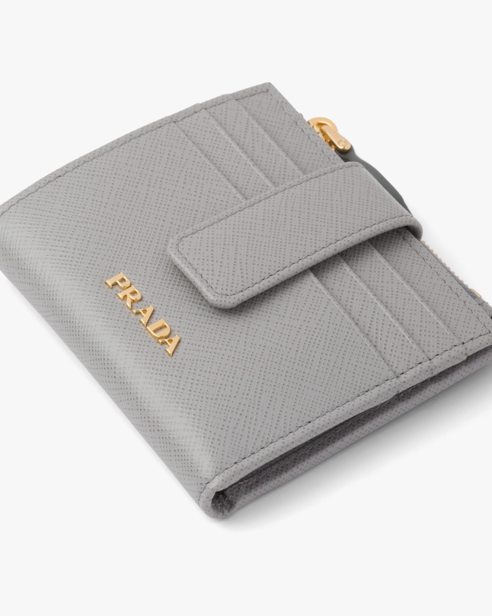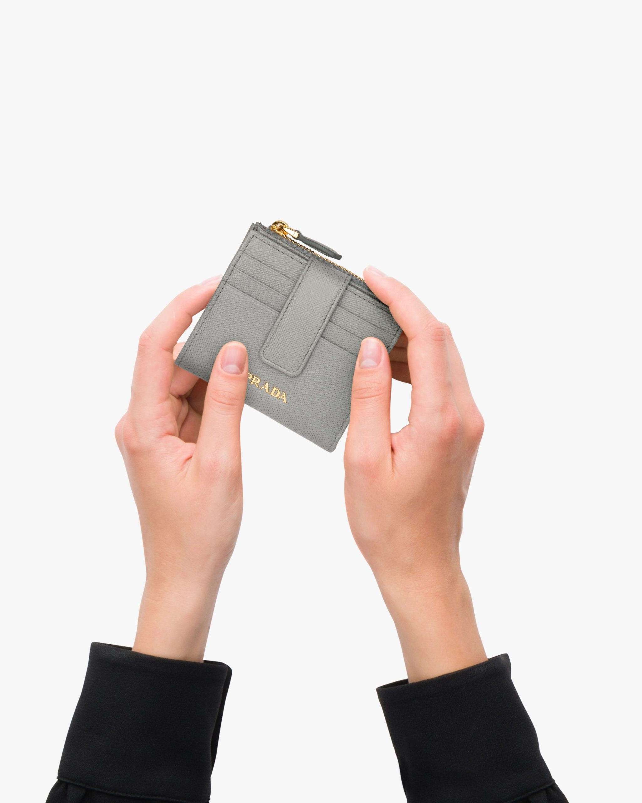 This small wallet is made of Saffiano, an iconic Prada material: calf leather of the highest quality, defined by a crosshatch texture and a waxed finish. The lettering logo decorates the accessory.