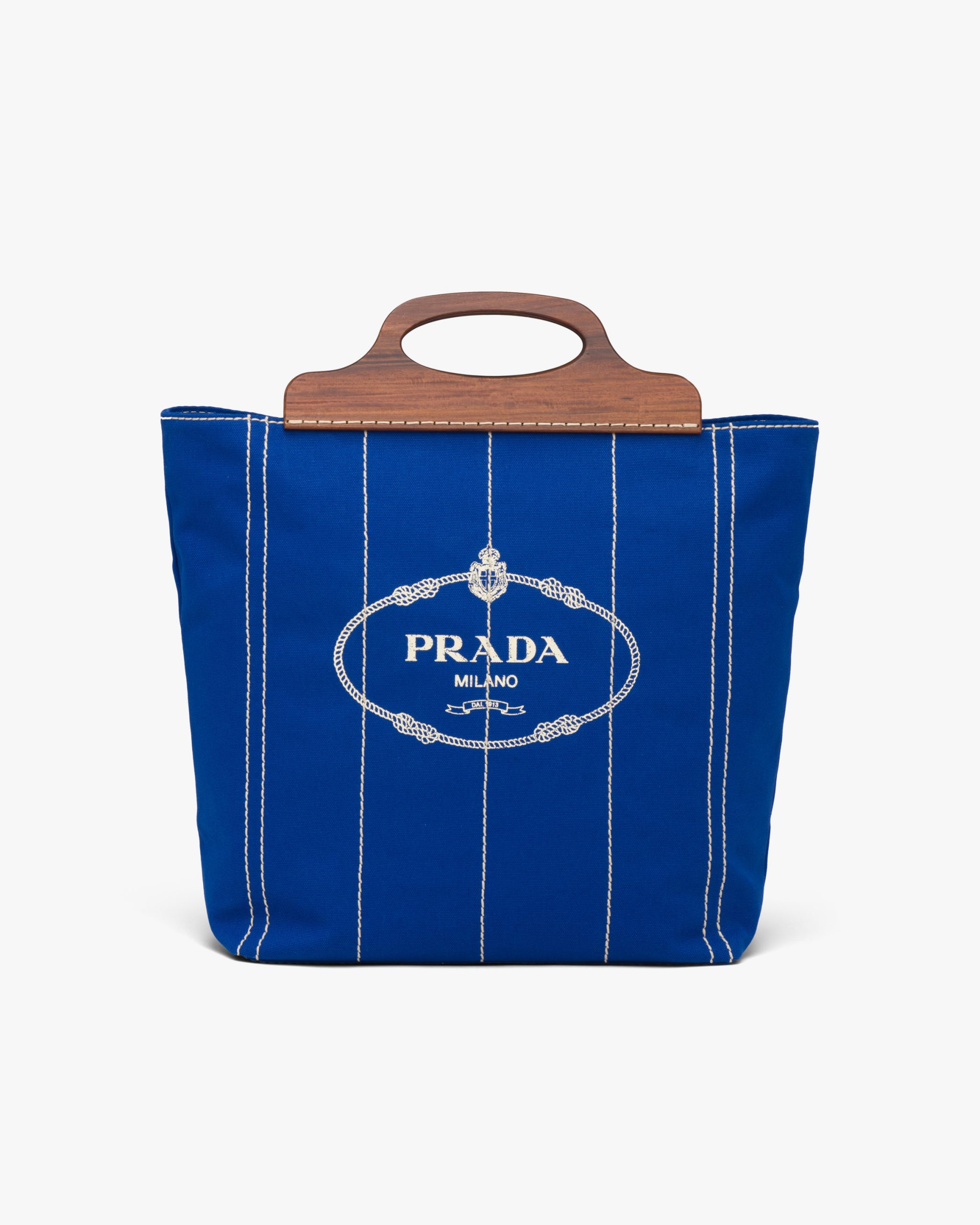 Contrasting materials characterize this cotton canvas bag. The wooden handle distinguishes the accessory with a shoulder strap and screen-printed logo.