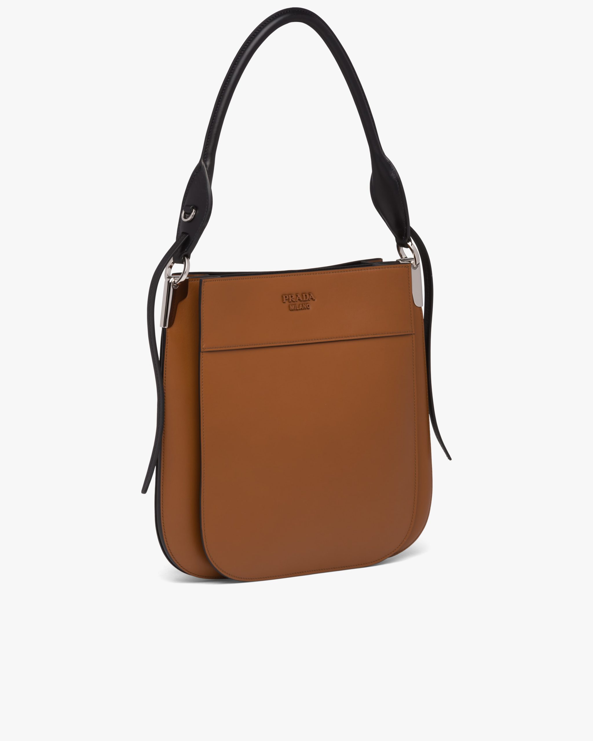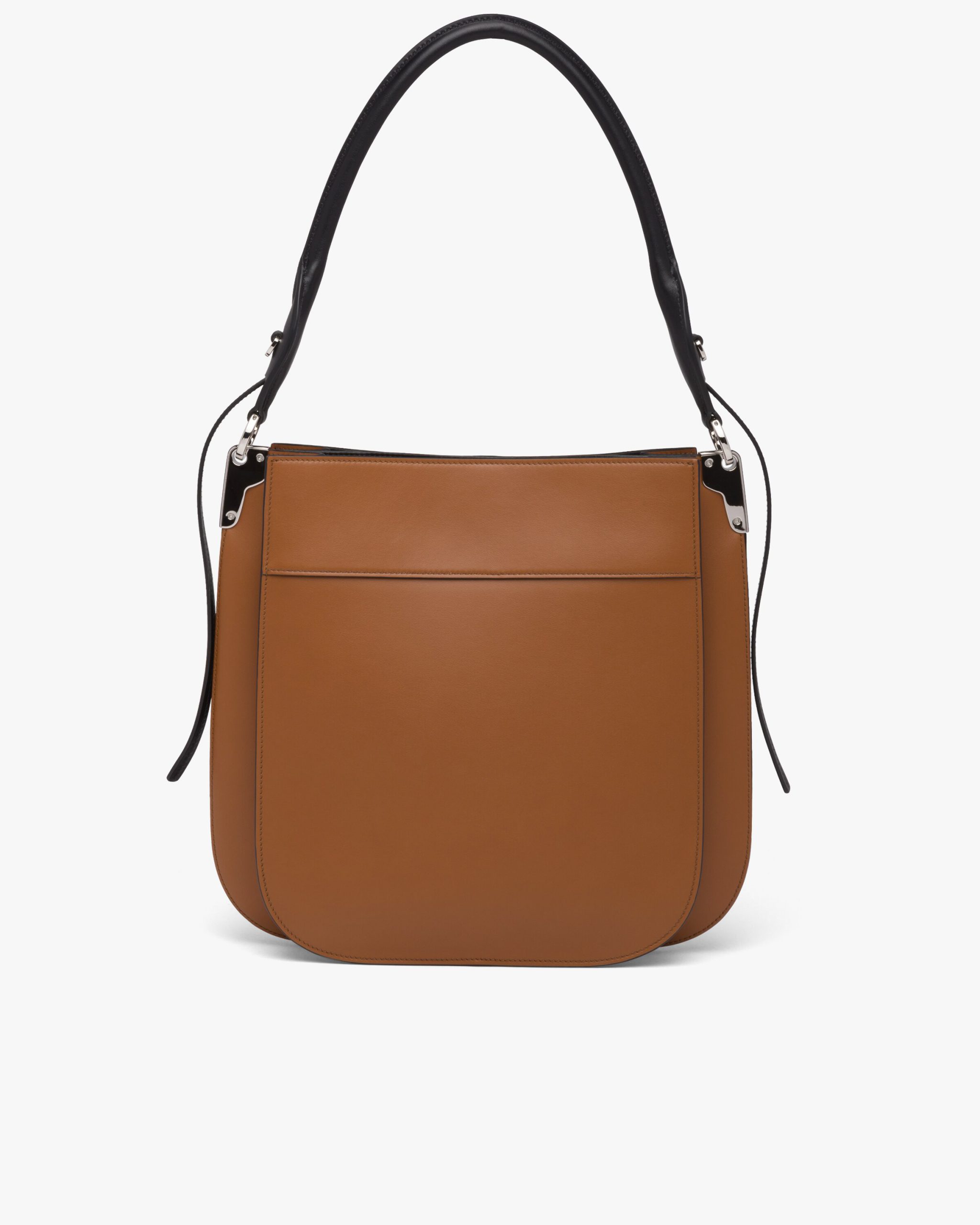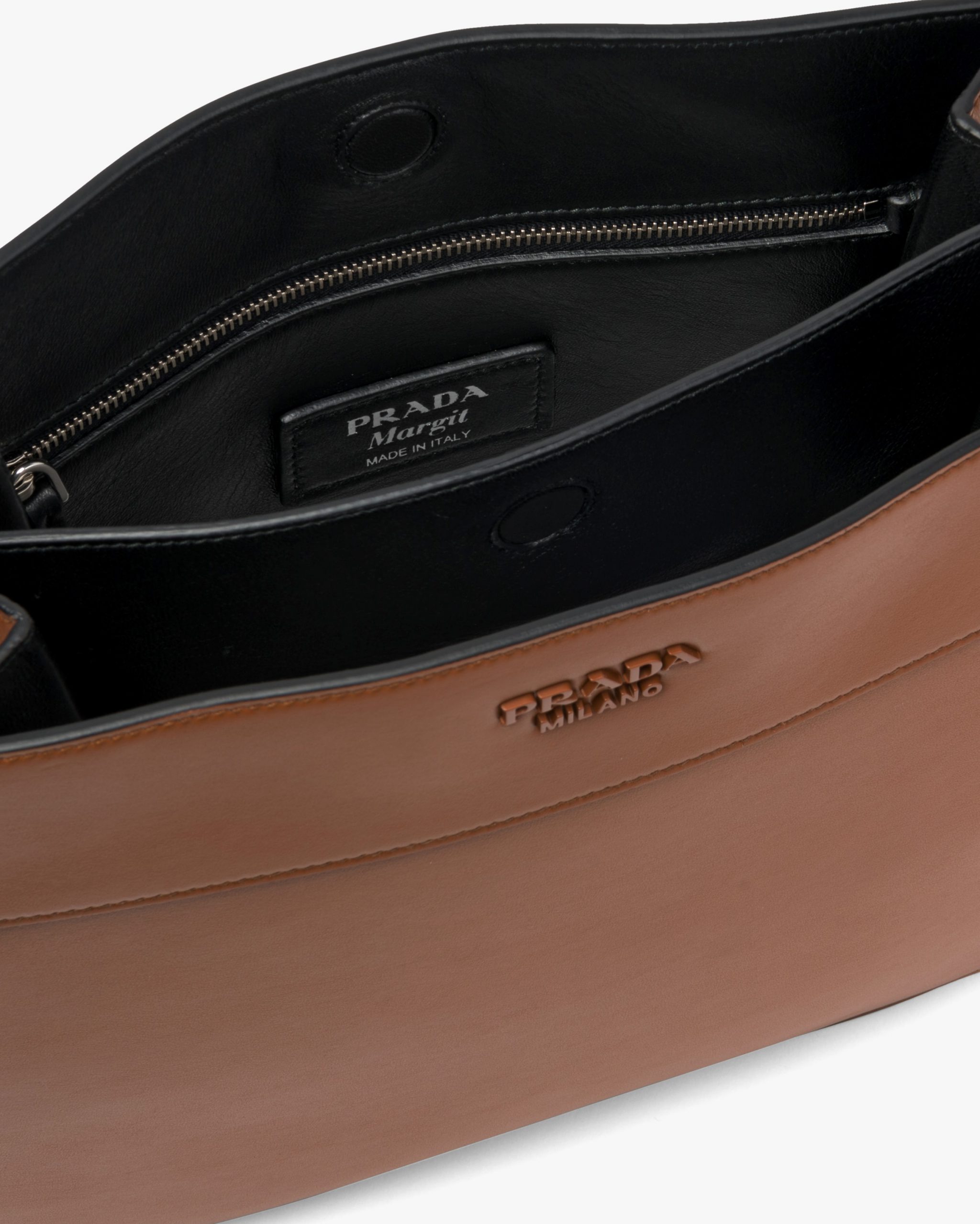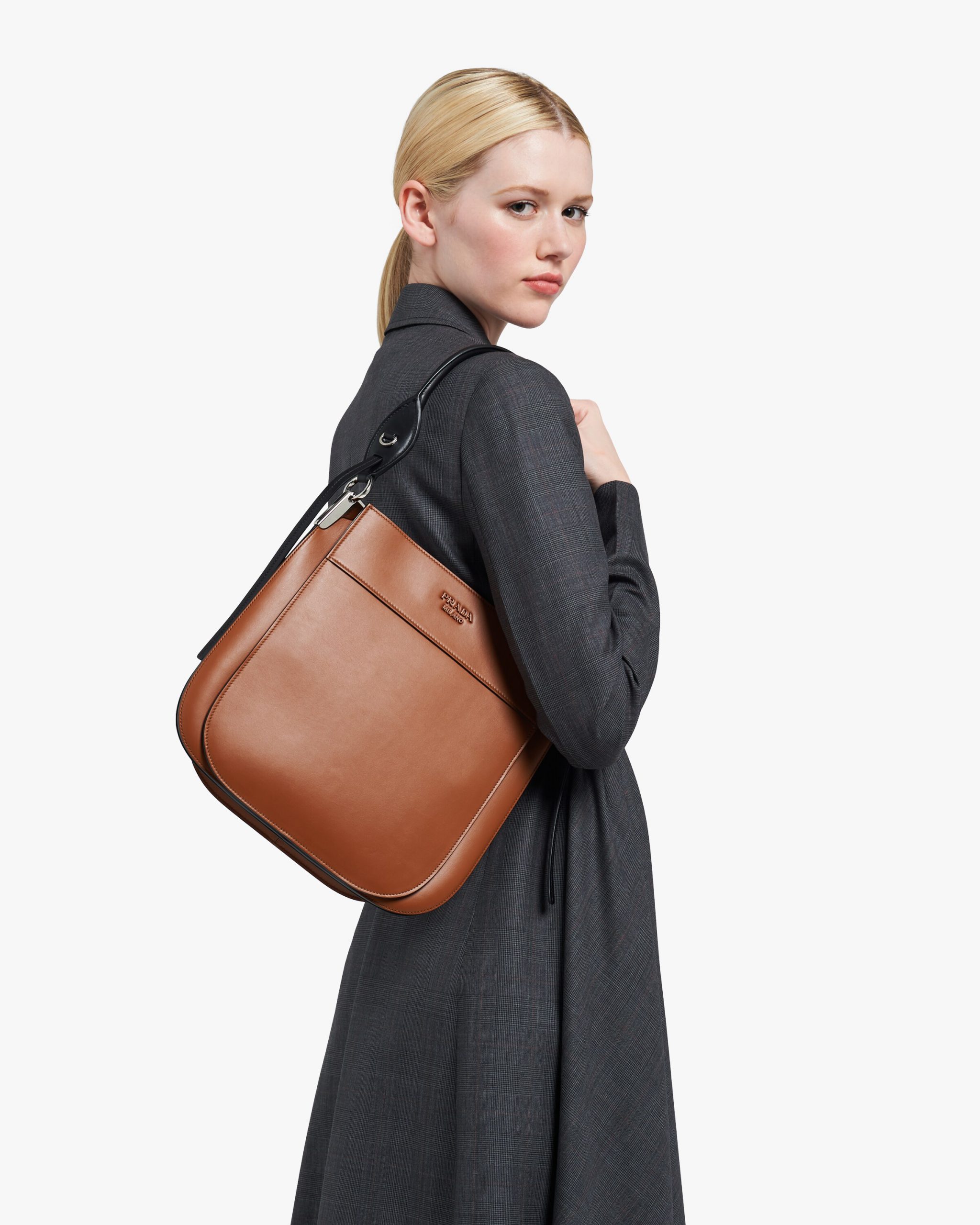 This leather bag with metal lettering logo has a modern design and rounded silhouette.