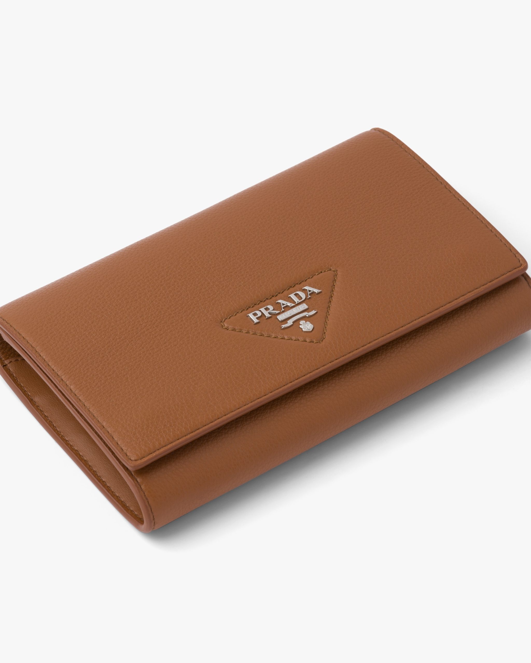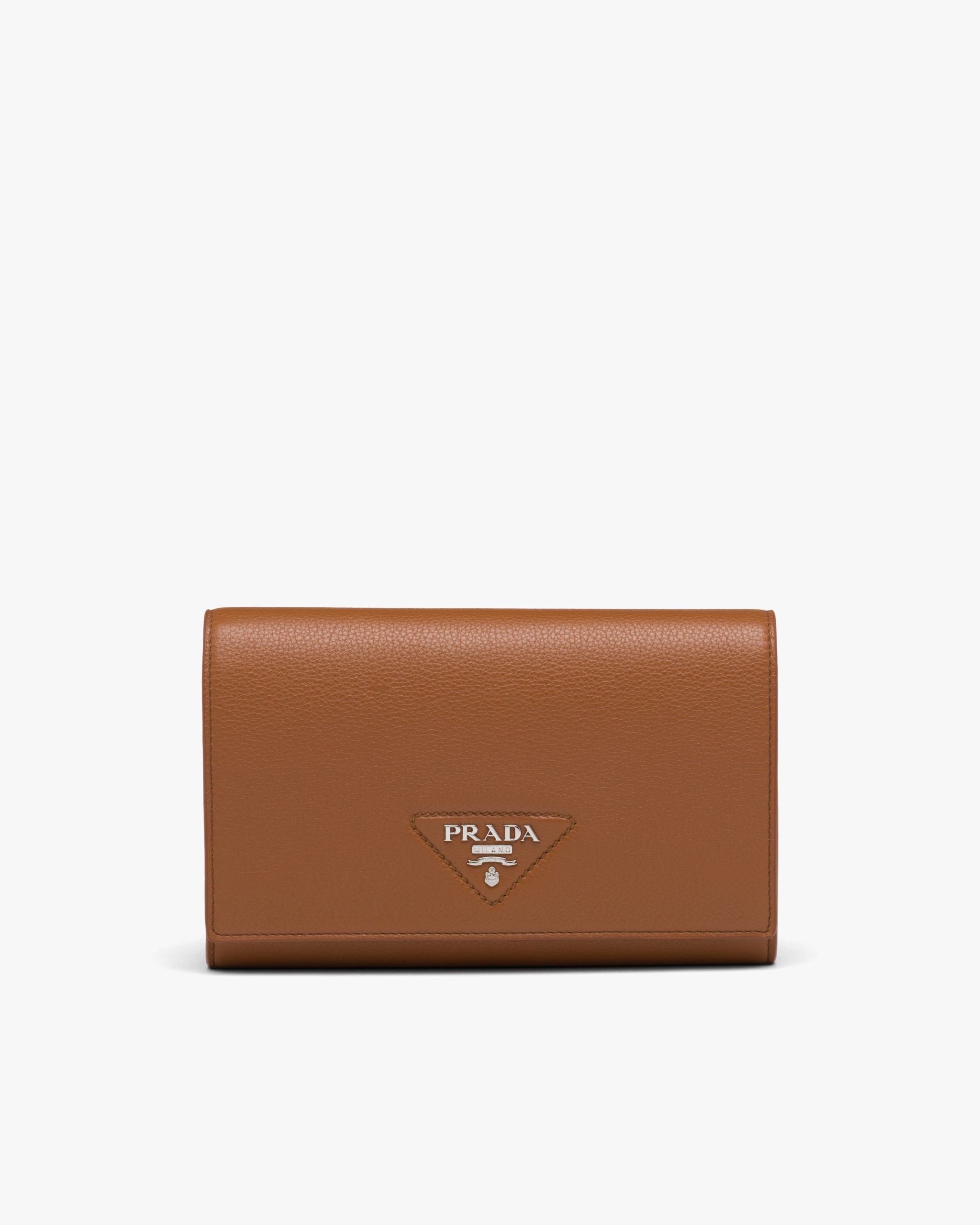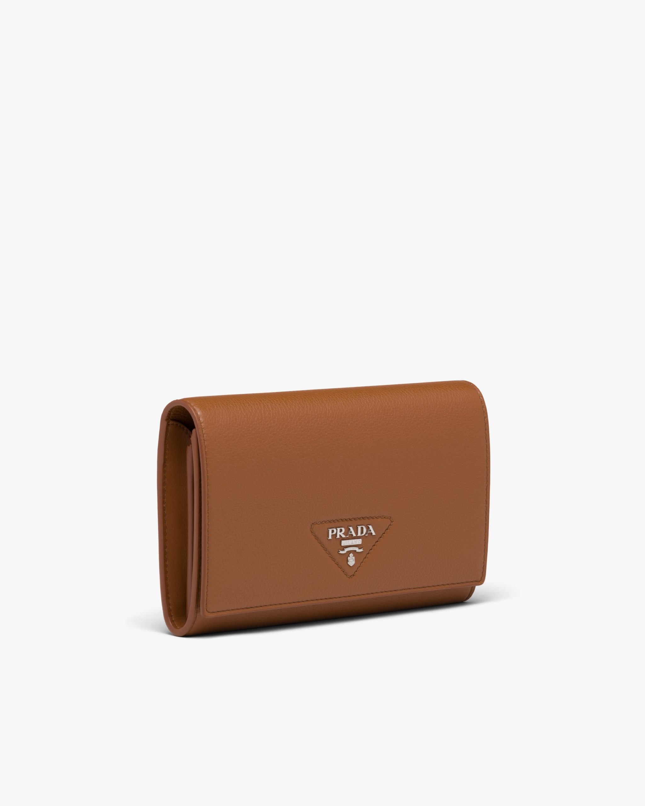 The magnet closure completes the design of this large leather wallet. This accessory with internal compartments and slots for bills, coins and cards is decorated with the iconic metal lettering logo.