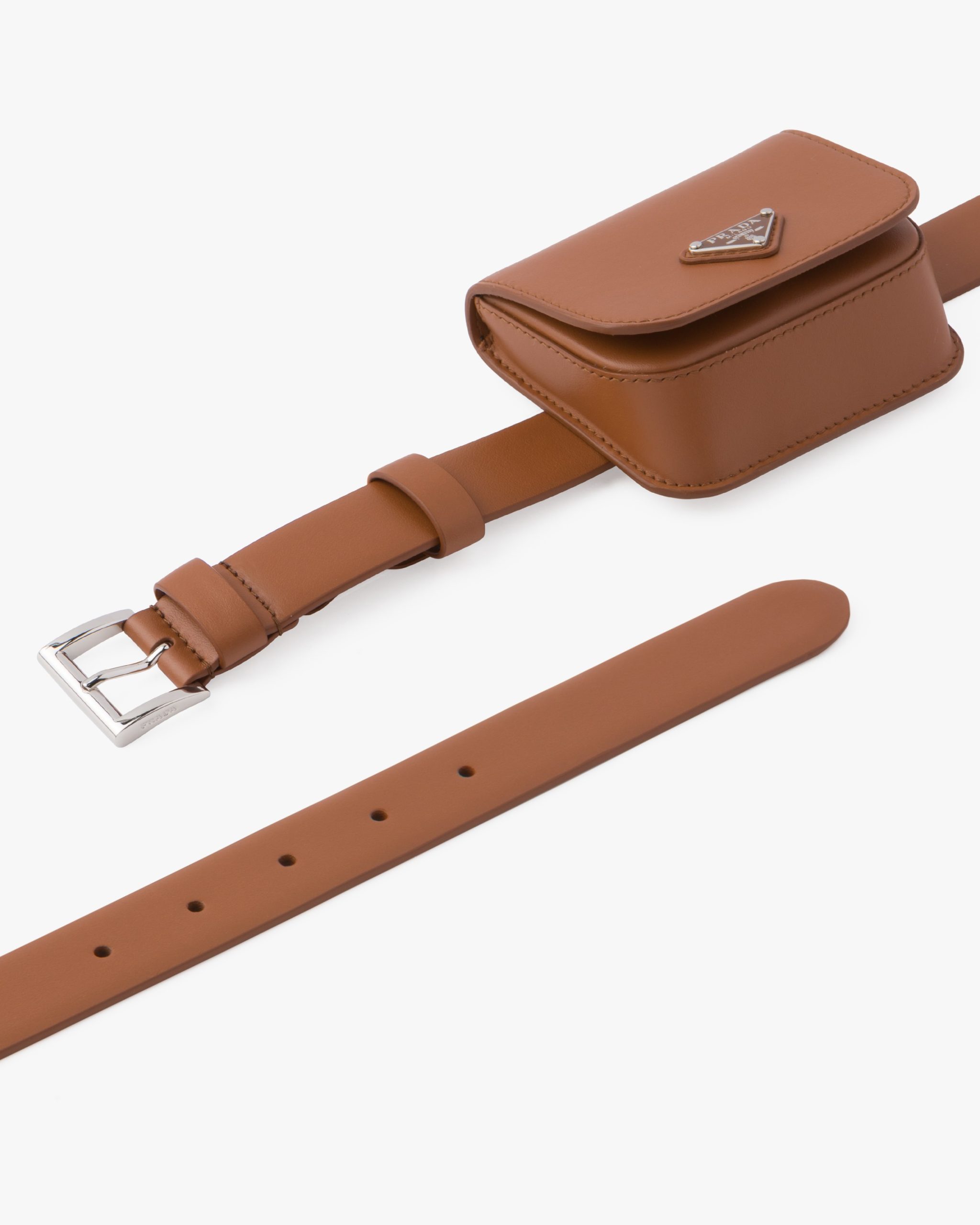 With a hybrid, multifunctional design, this multi-accessorized leather belt is enhanced by a leather pouch. The enameled metal triangle, the brand?? iconic logo created in 1913, adorns this accessory.