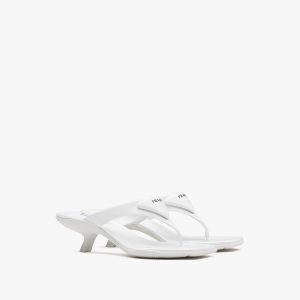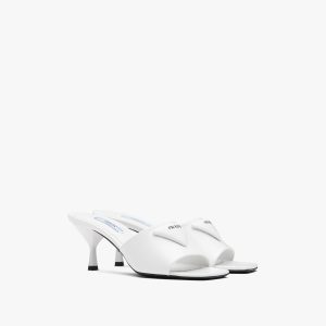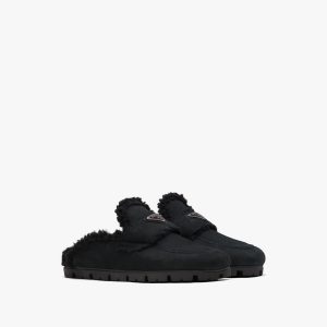 These shearling slippers embody an aesthetic and stylistic duality, combining a contemporary, urban design and alpine-inspired materials. The iconic enameled triangle logo decorates the footwear.