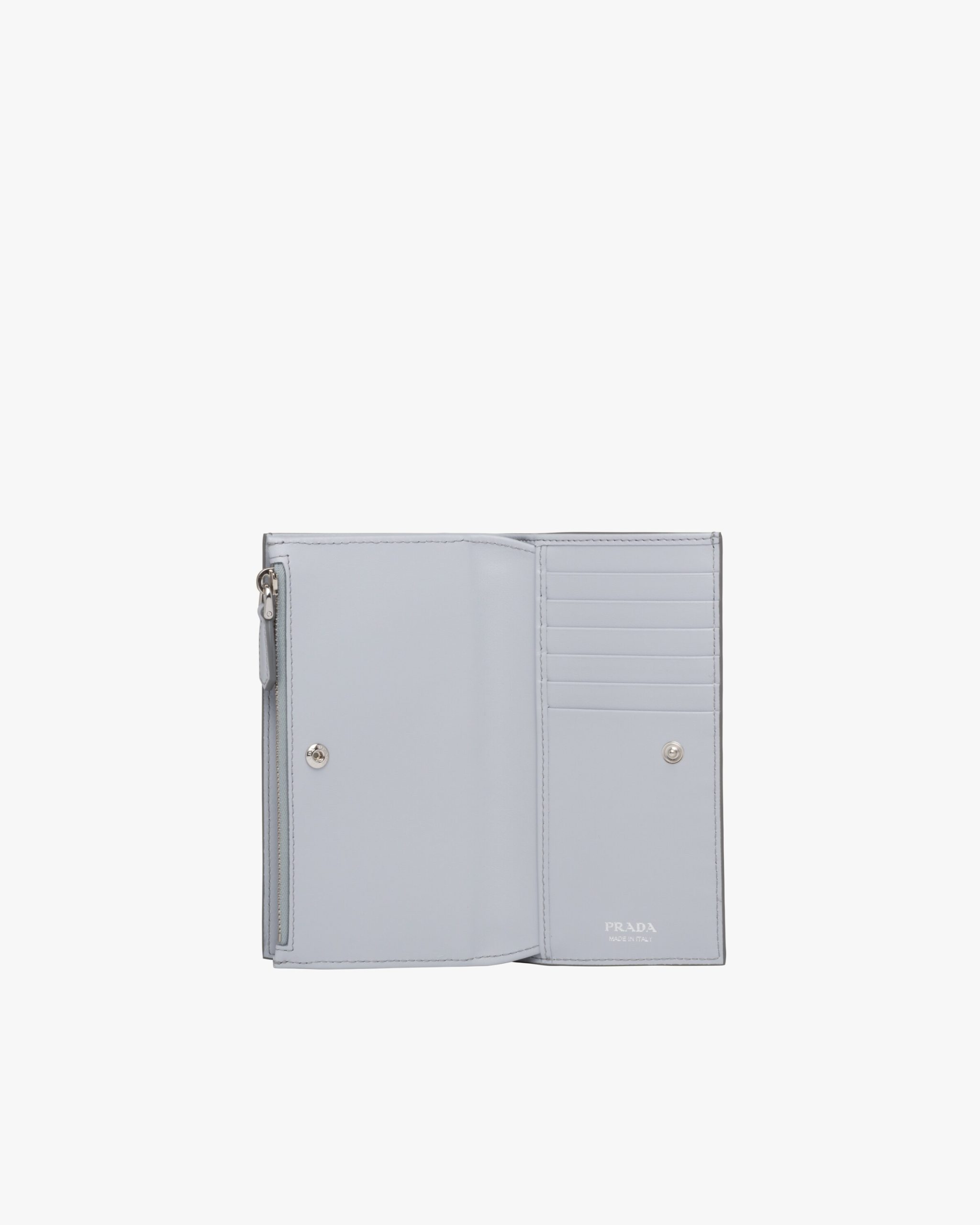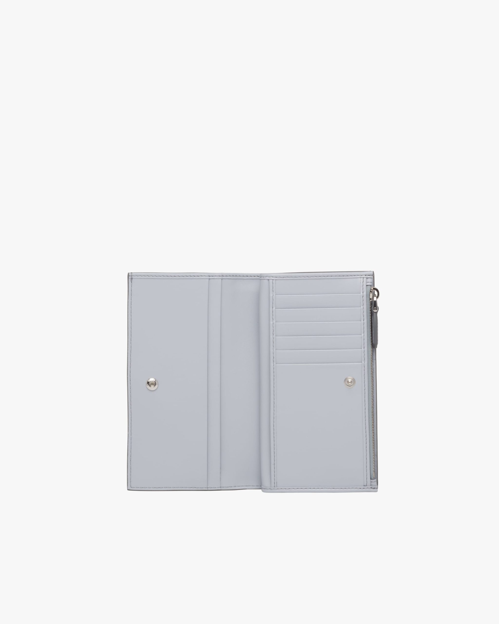 This large leather wallet has several internal pockets and card slots. The accessory is decorated with the metal lettering logo.
