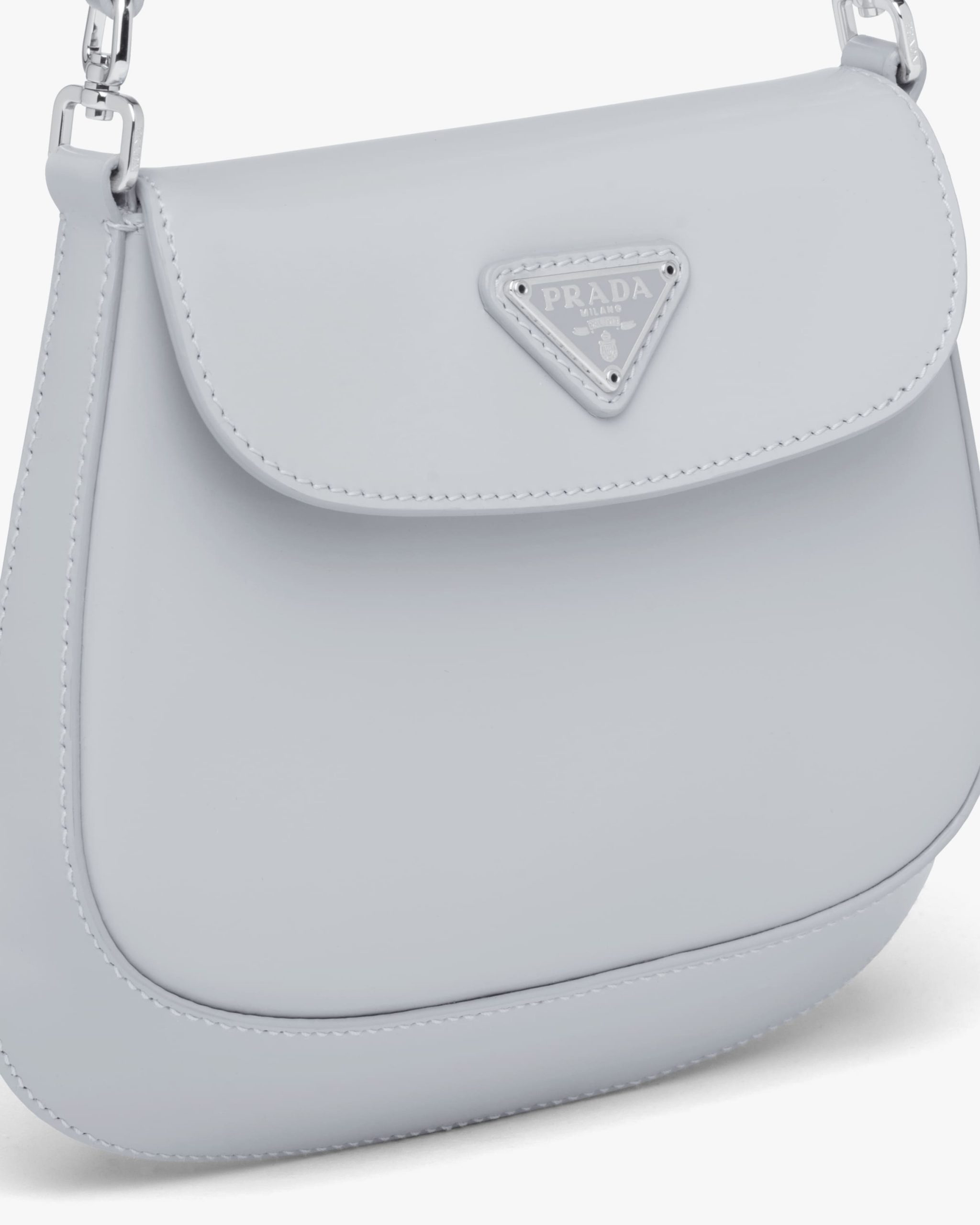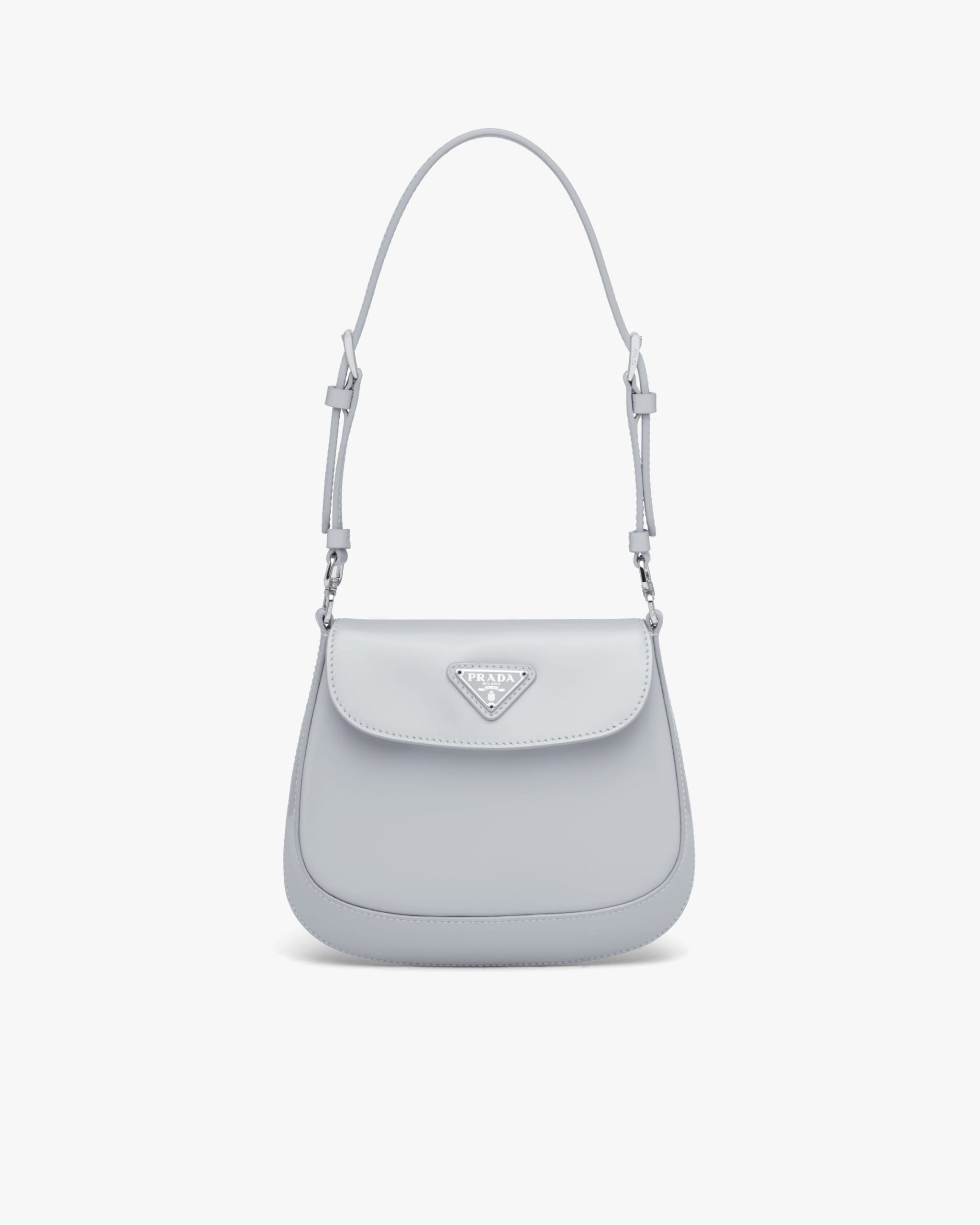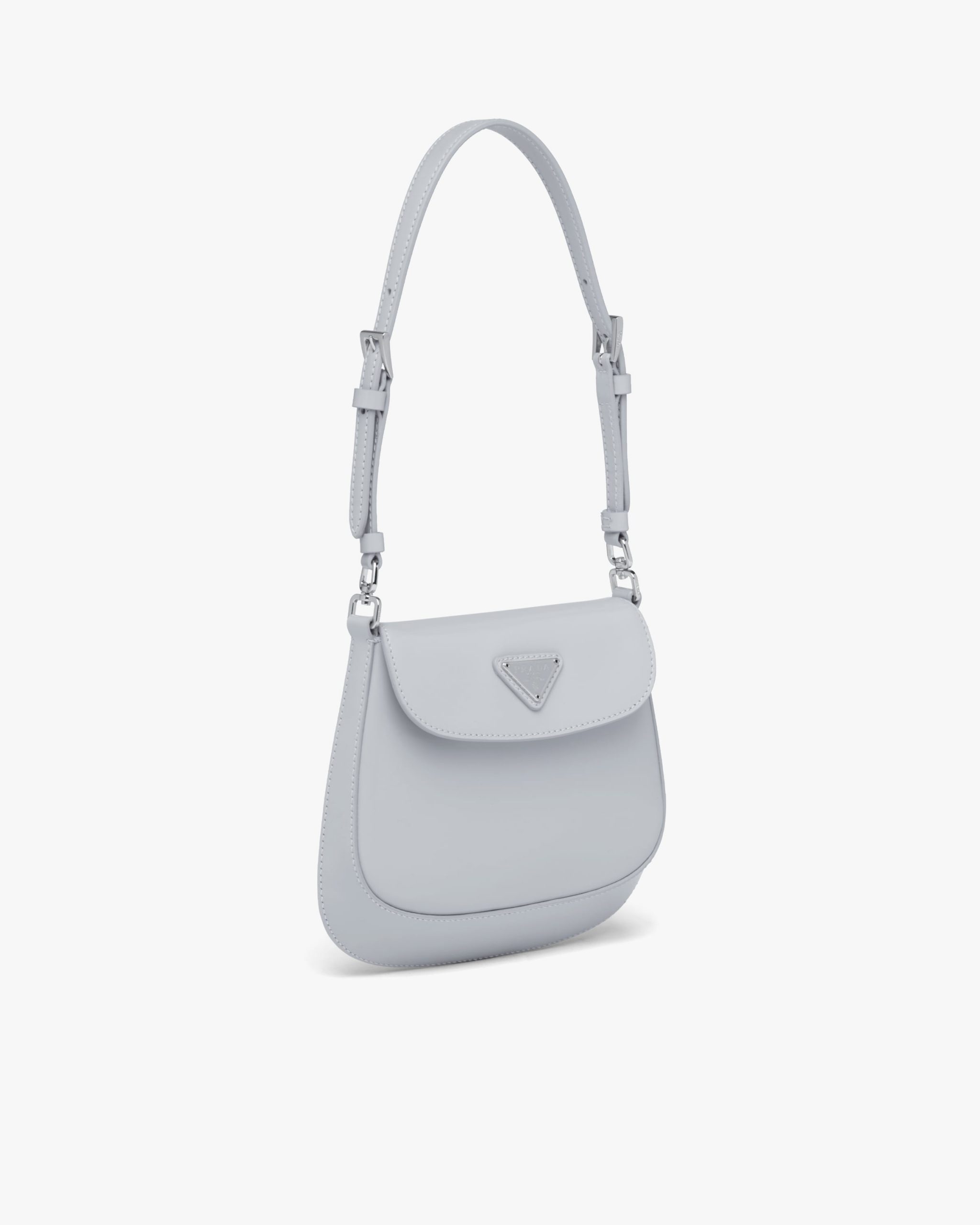 A perfect synthesis of classicism and futurism, the Prada Cleo bag reinterprets an iconic design from the brand’s archives. Sleek, curved lines emphasized by the particular sloping construction on the bottom and sides give this flap bag sophisticated allure, while the handle with extension makes the accessory functional and allows it to be worn as a shoulder bag or handbag. Brushed leather, a distinctive material of Prada collectsions, is a modern, chameleonic material that is perfect for always new combinations and contrasts. The enameled triangle logo completes the silhouette.