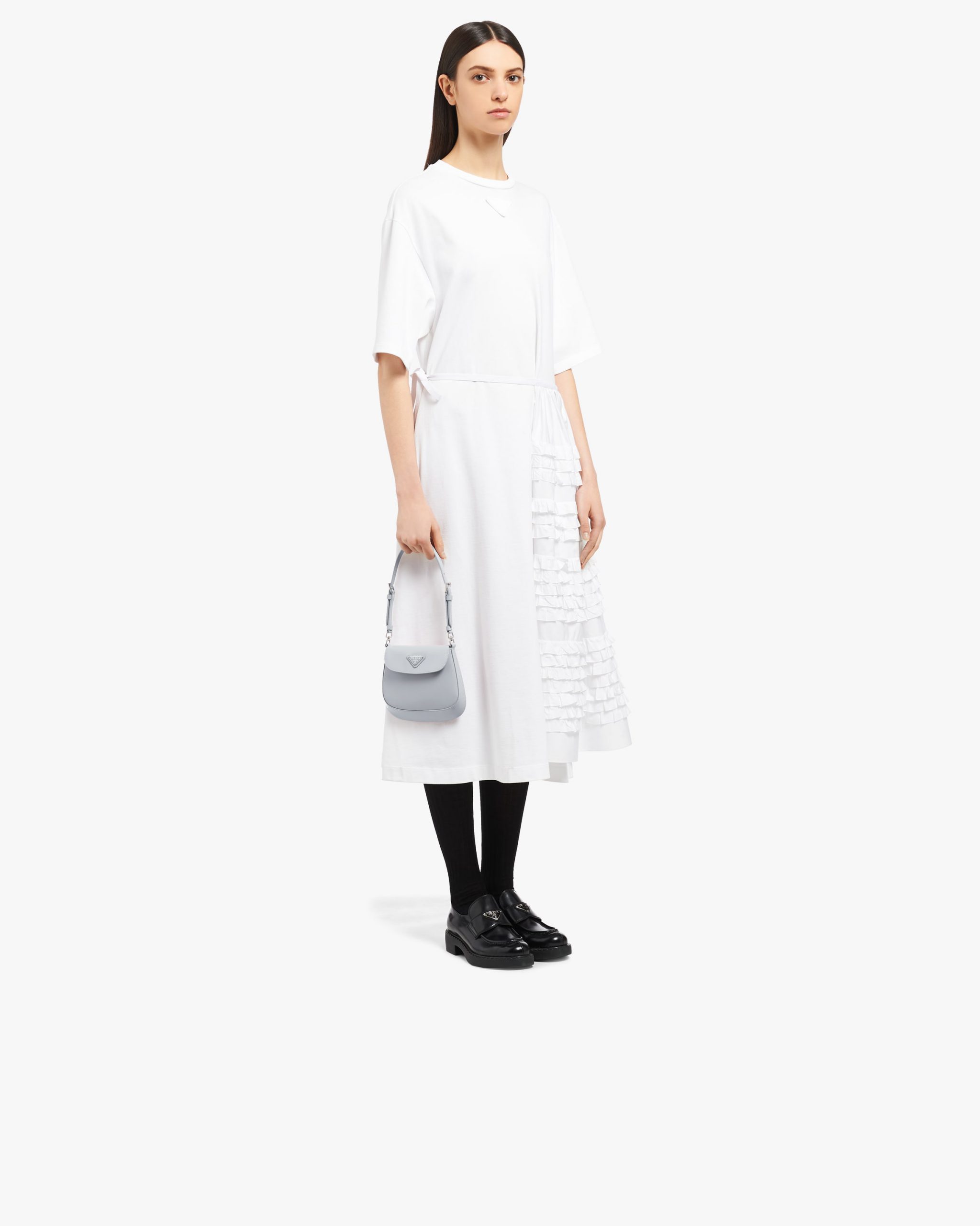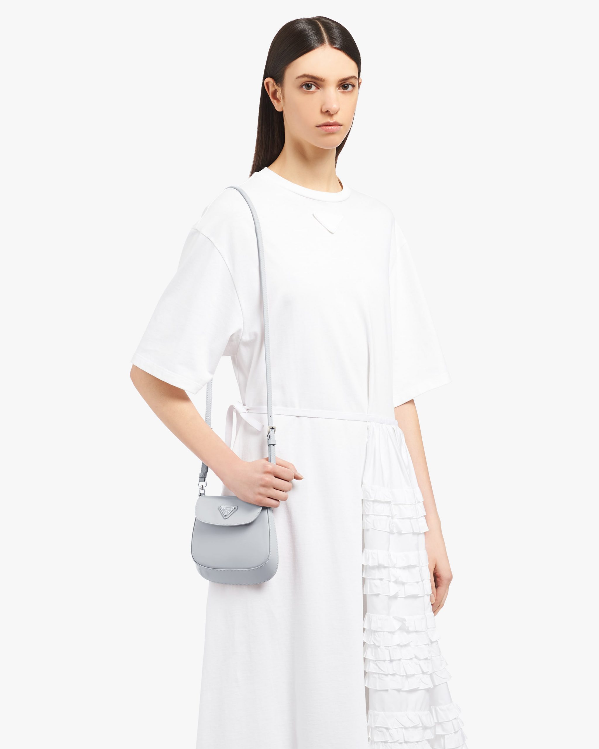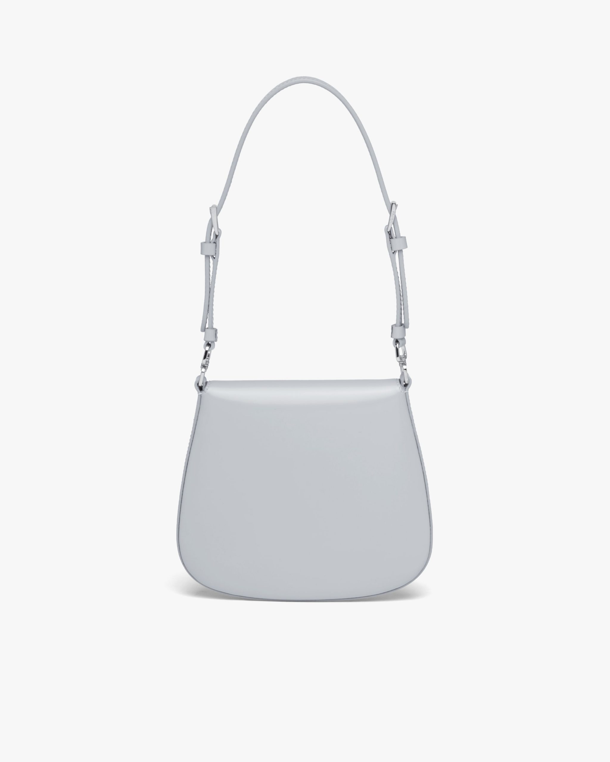A perfect synthesis of classicism and futurism, the Prada Cleo bag reinterprets an iconic design from the brand’s archives. Sleek, curved lines emphasized by the particular sloping construction on the bottom and sides give this flap bag sophisticated allure, while the handle with extension makes the accessory functional and allows it to be worn as a shoulder bag or handbag. Brushed leather, a distinctive material of Prada collectsions, is a modern, chameleonic material that is perfect for always new combinations and contrasts. The enameled triangle logo completes the silhouette.