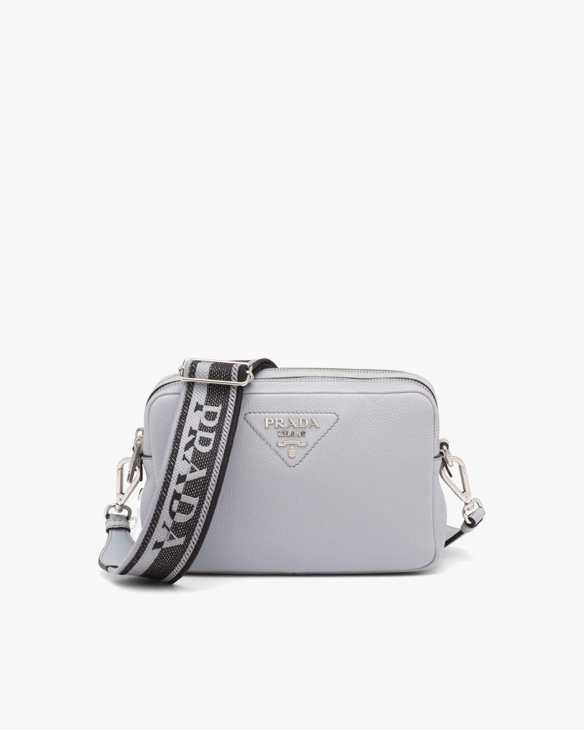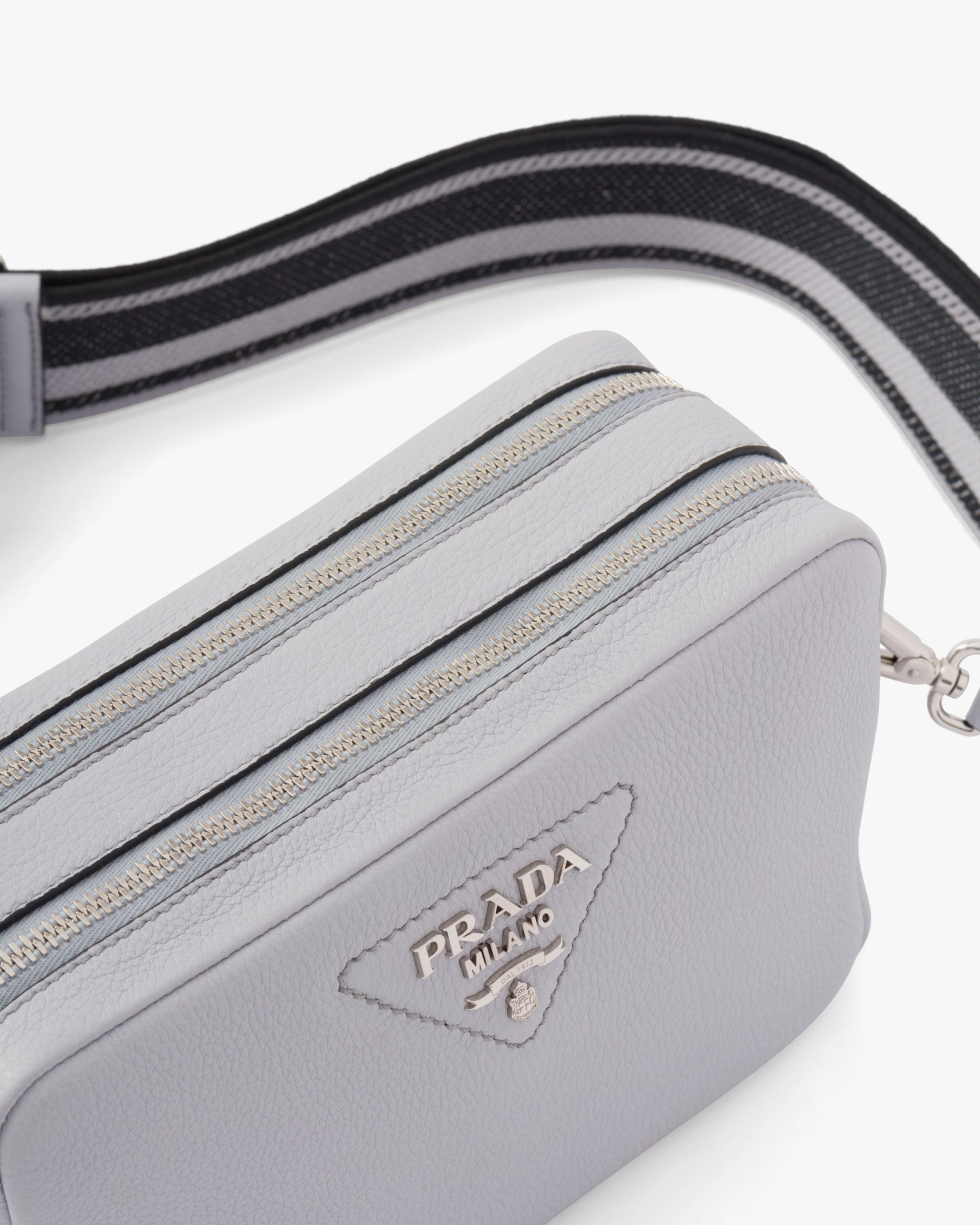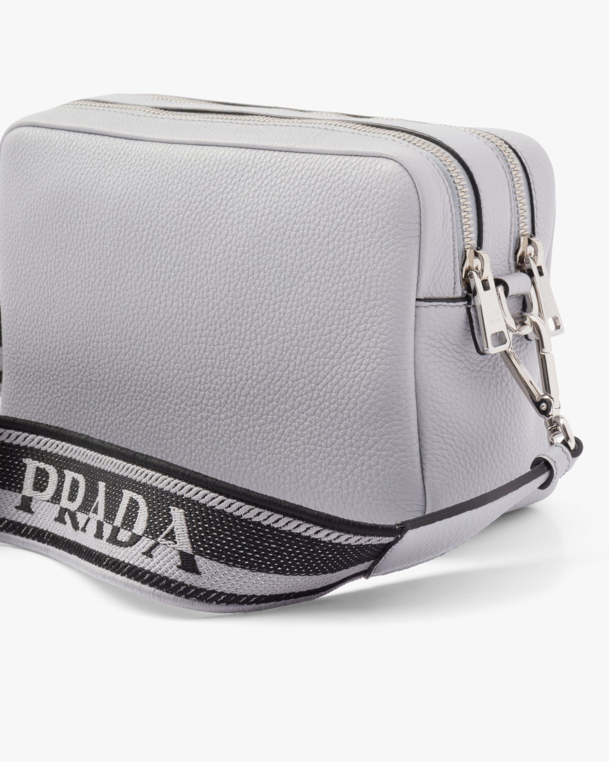 This Prada Flou leather shoulder bag with a double zipper is made of soft leather and illuminated by metal hardware for a modern accent. The accessory is completed by the detachable woven tape shoulder strap embroidered with the logo in a contrasting color, that makes it wearable as a crossbody or shoulder bag.