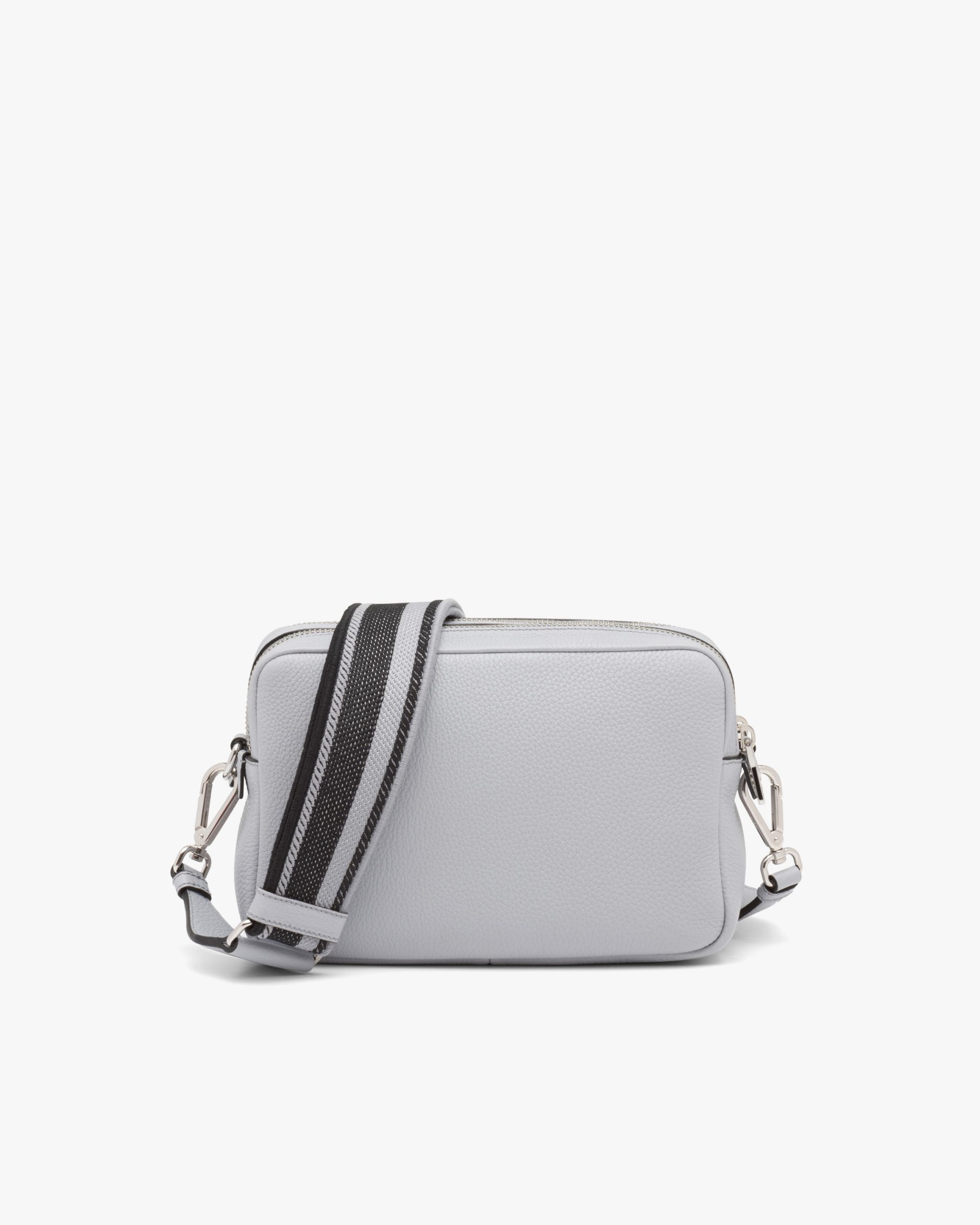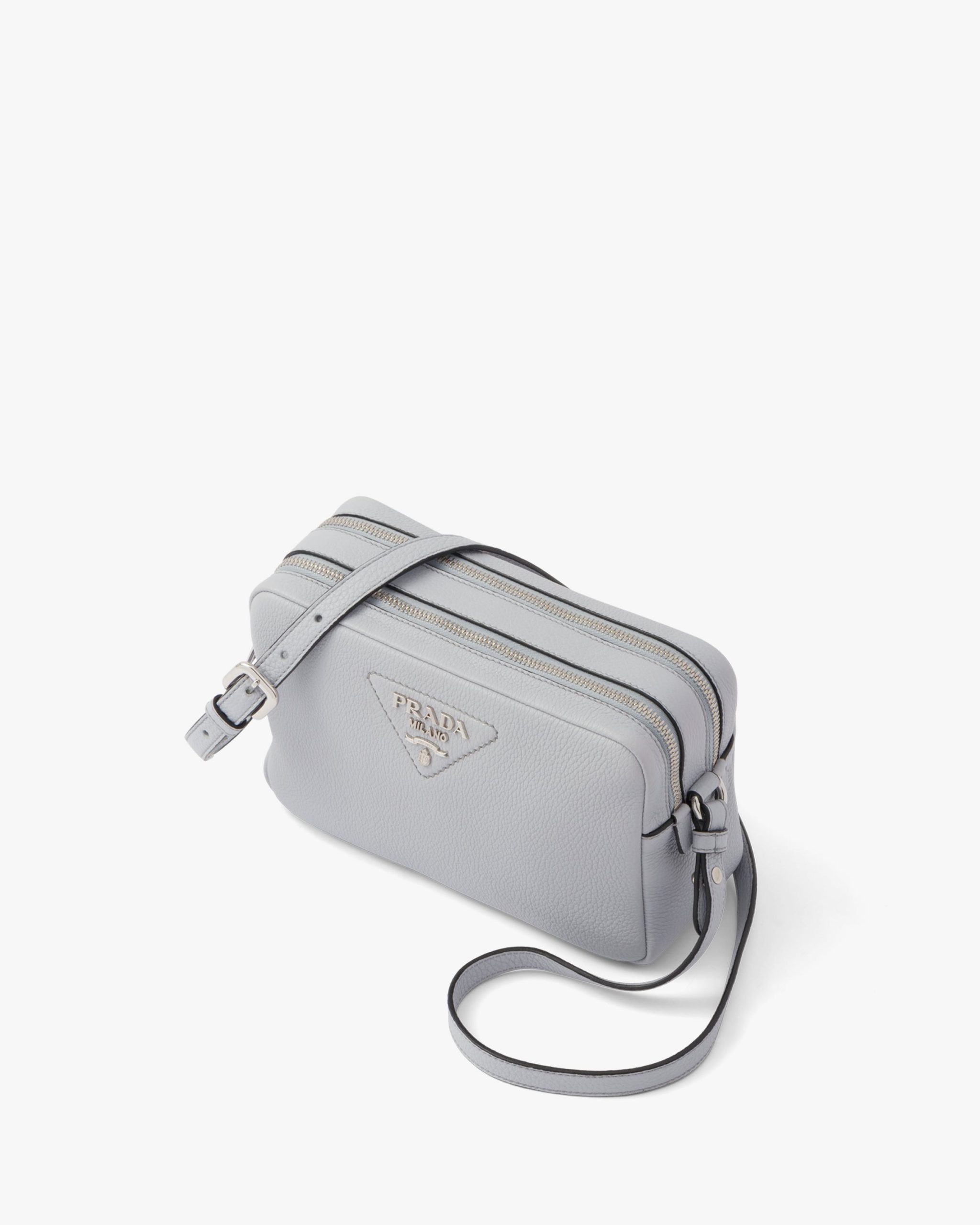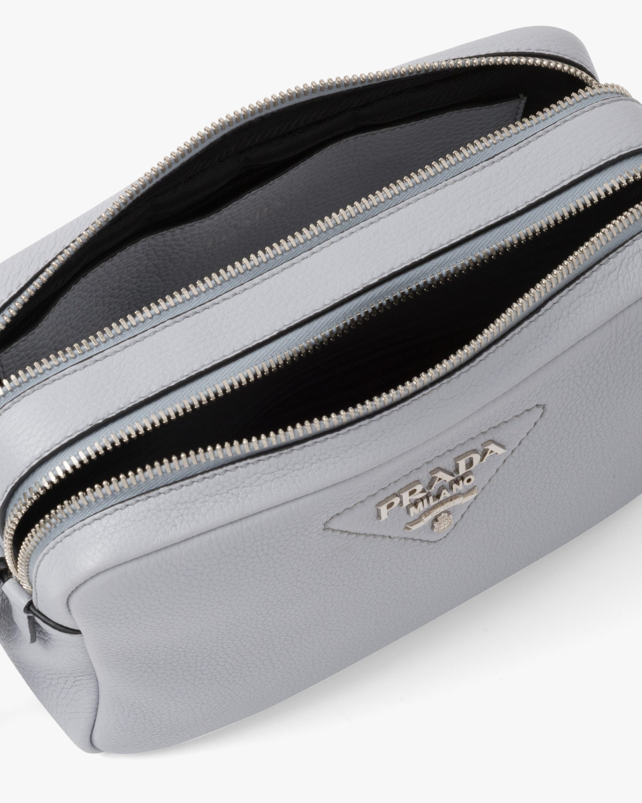This Prada Flou leather shoulder bag with a double zipper is made of soft leather and illuminated by metal hardware for a modern accent. The accessory is completed by the detachable woven tape shoulder strap embroidered with the logo in a contrasting color, that makes it wearable as a crossbody or shoulder bag.