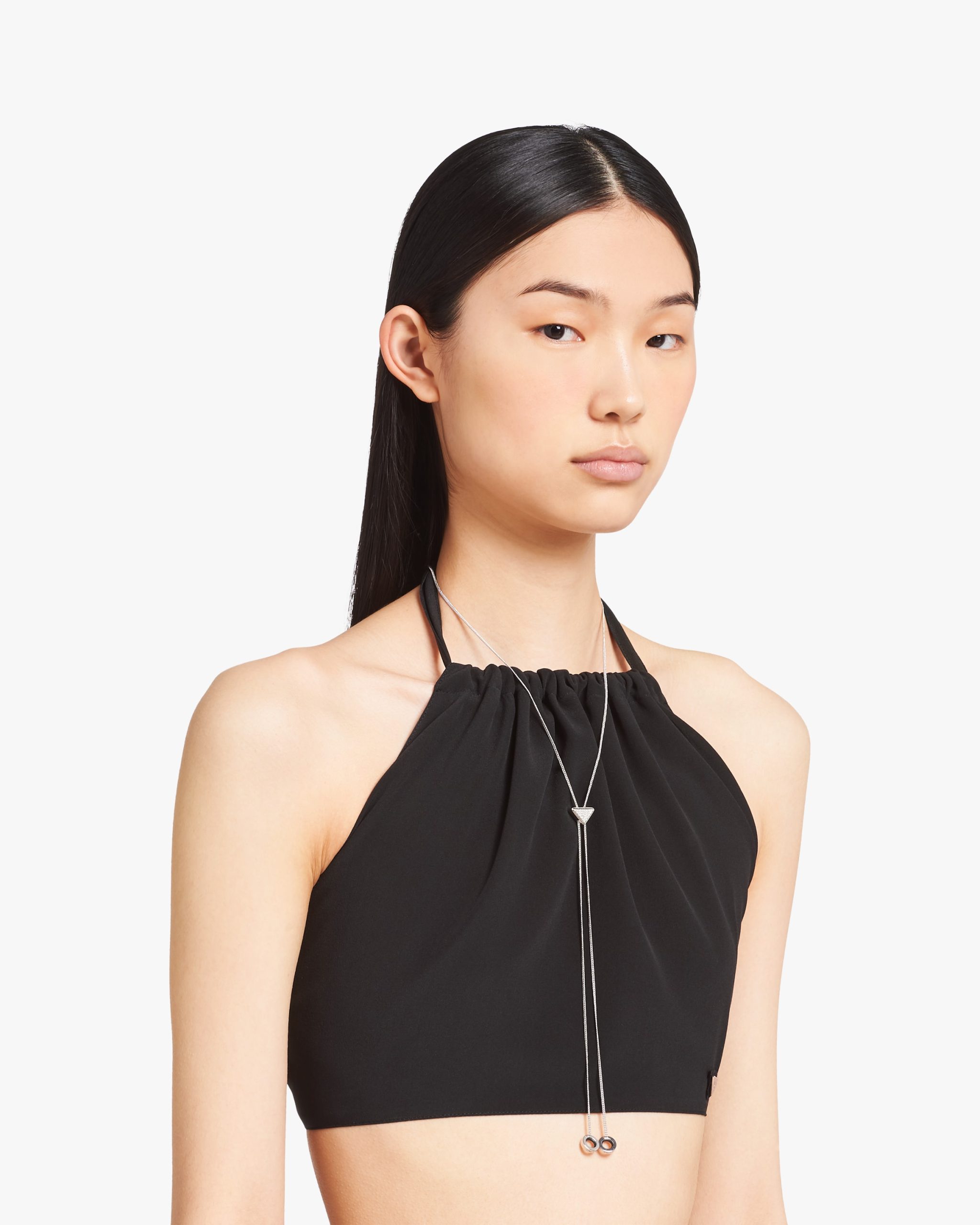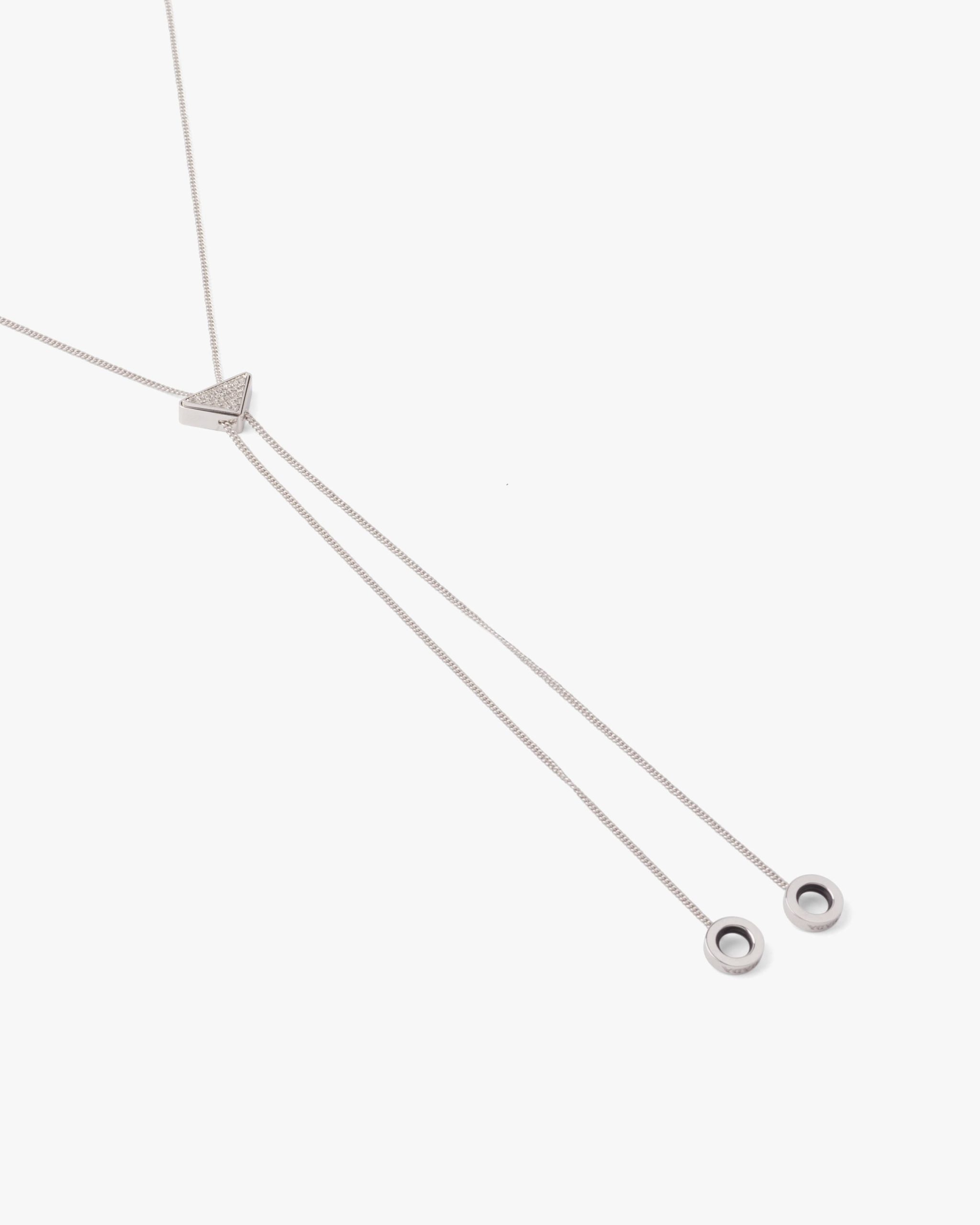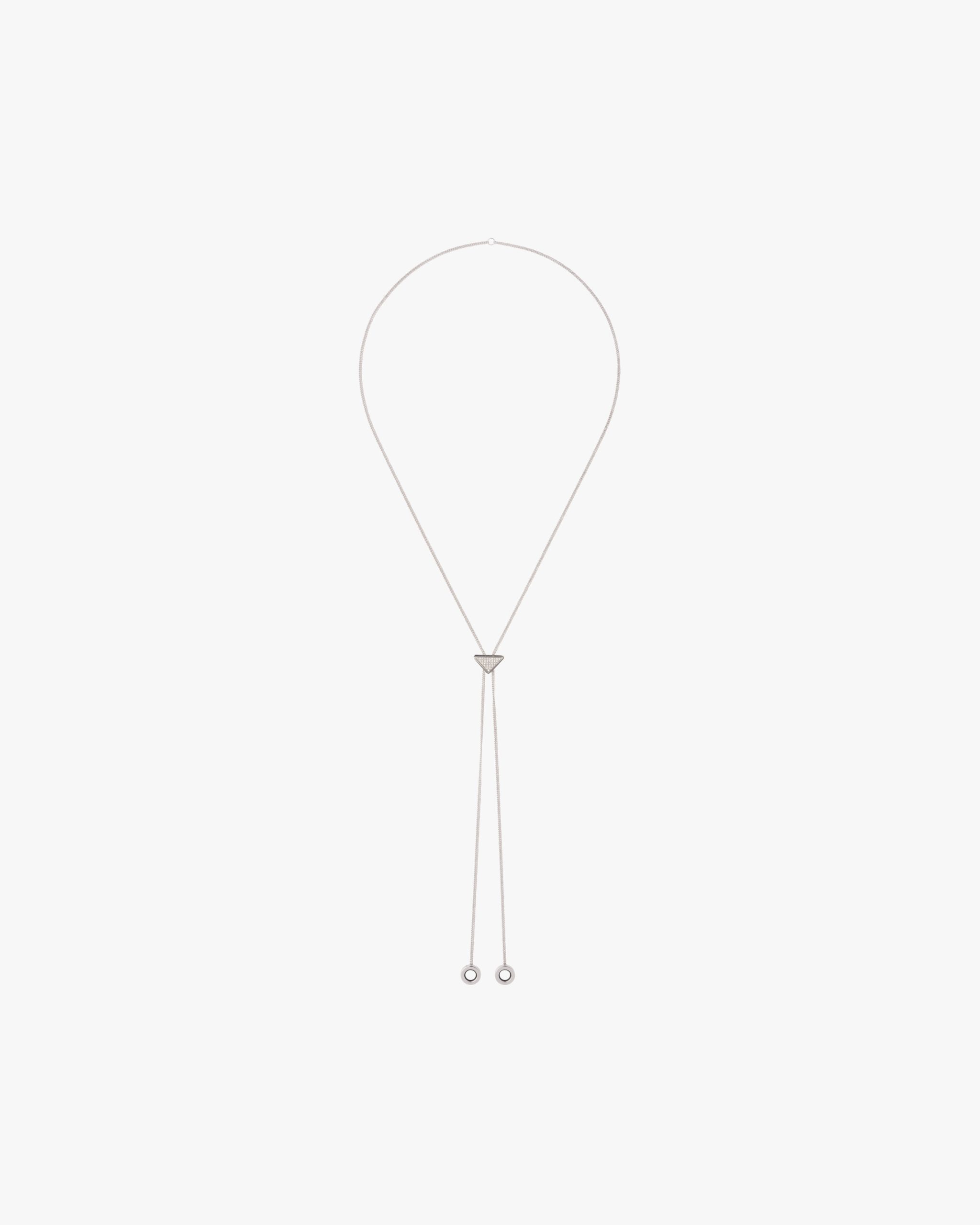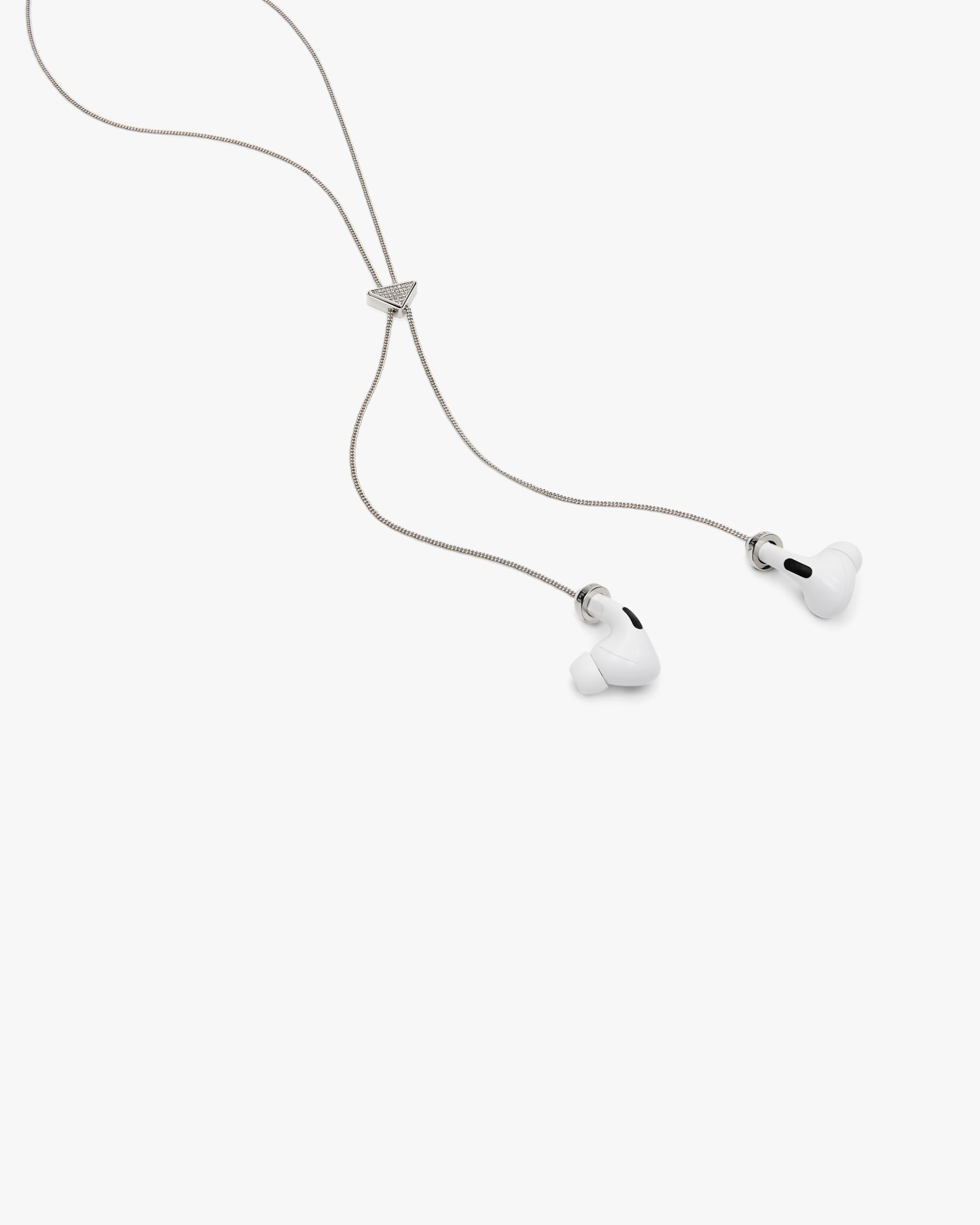 The triangle logo illuminated by zircons enhances this brass necklace with palladium finish further embellished with AirPods holders. Prada plays with its most iconic shape, which results in precious new details decoraring high-tech accessories.