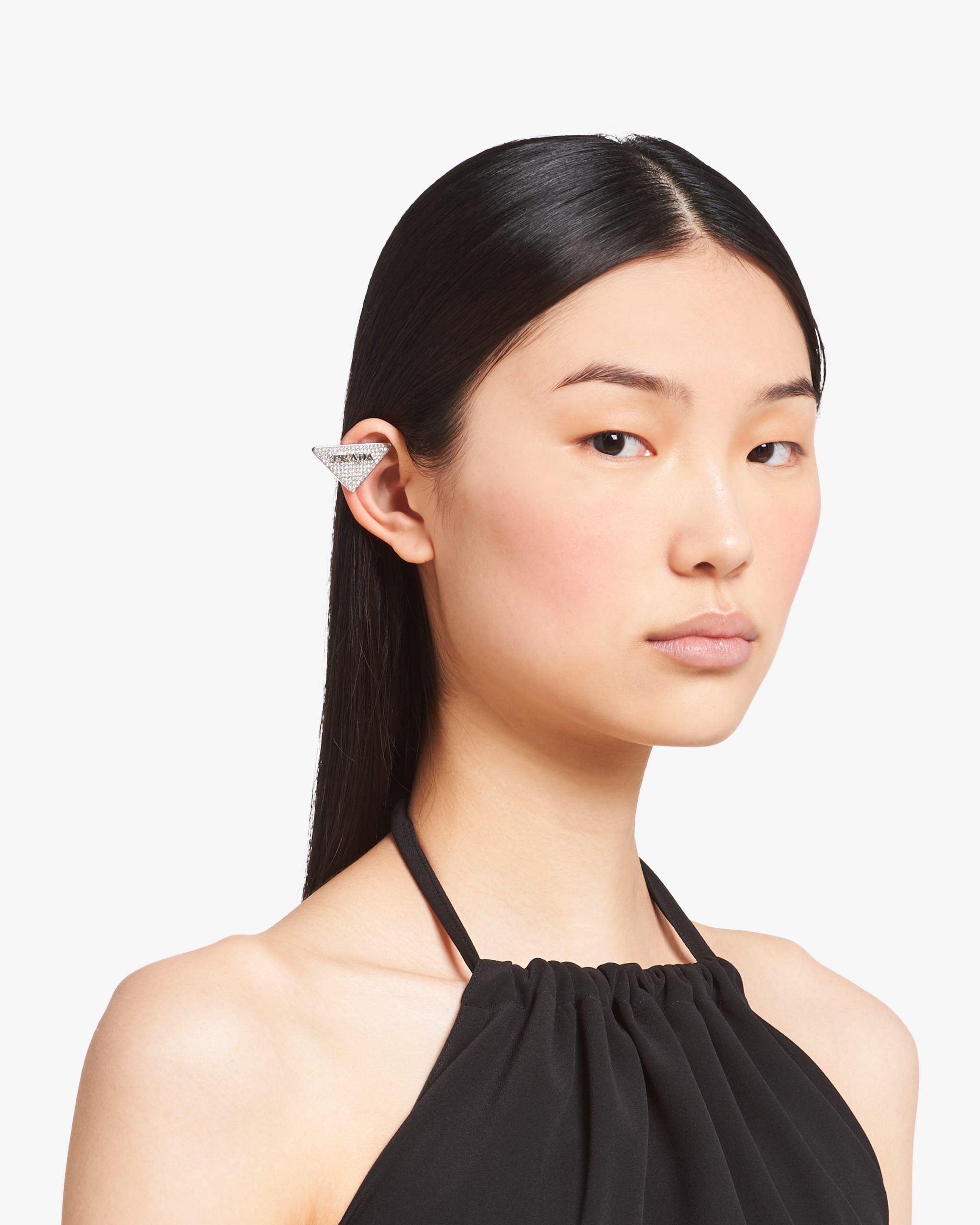 The sleek, iconic triangle is the protagonist of a jewelry line made of 925 sterling silver. The geometric logo illuminated with zircons defines these clip earrings and is combined with the refined lettering logo.