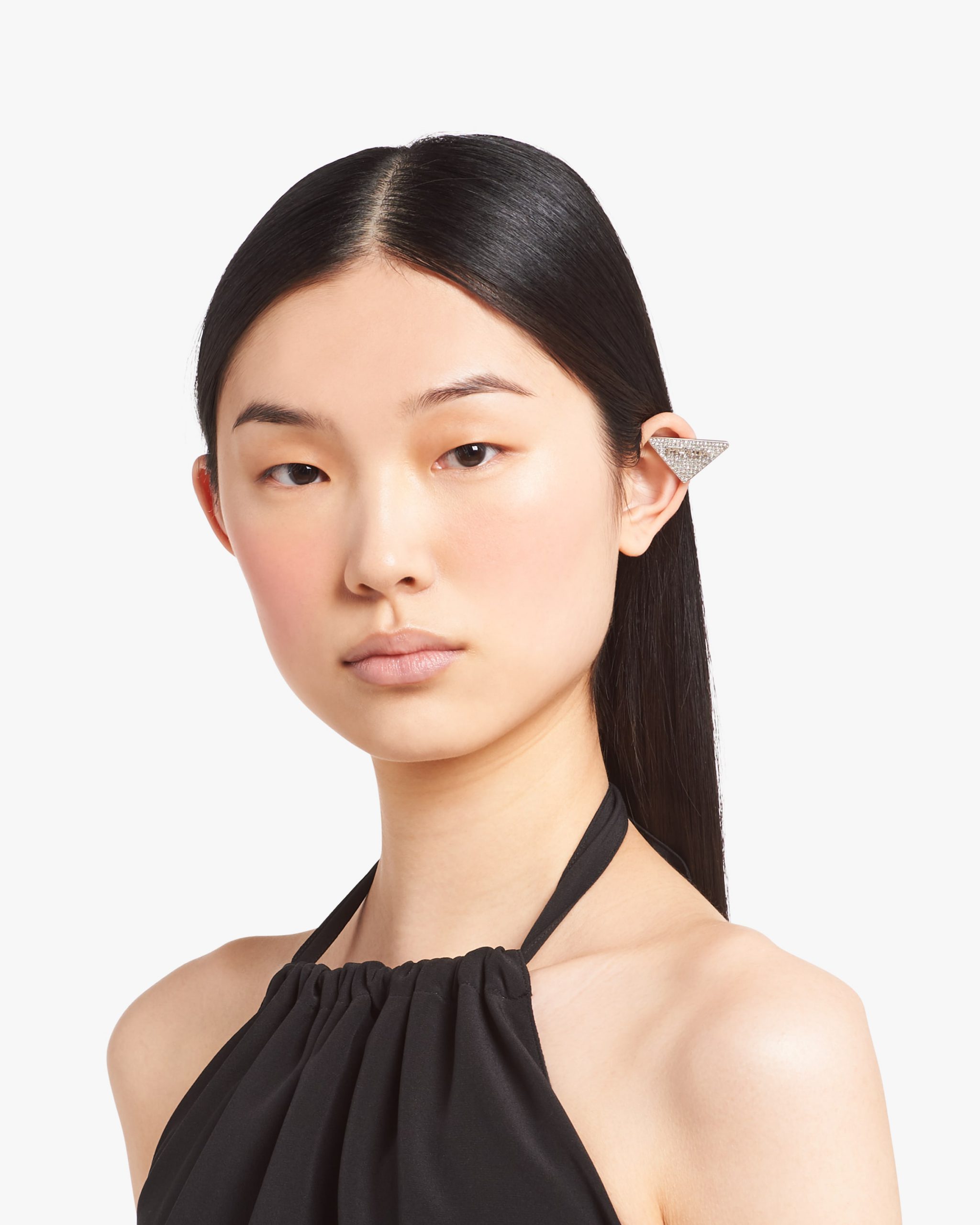 The triangle illuminated with zircons defines this clip earring and is combined with the refined lettering logo. The iconic and sleek geometric detail is the protagonist of a jewelry line made of 925 sterling silver.