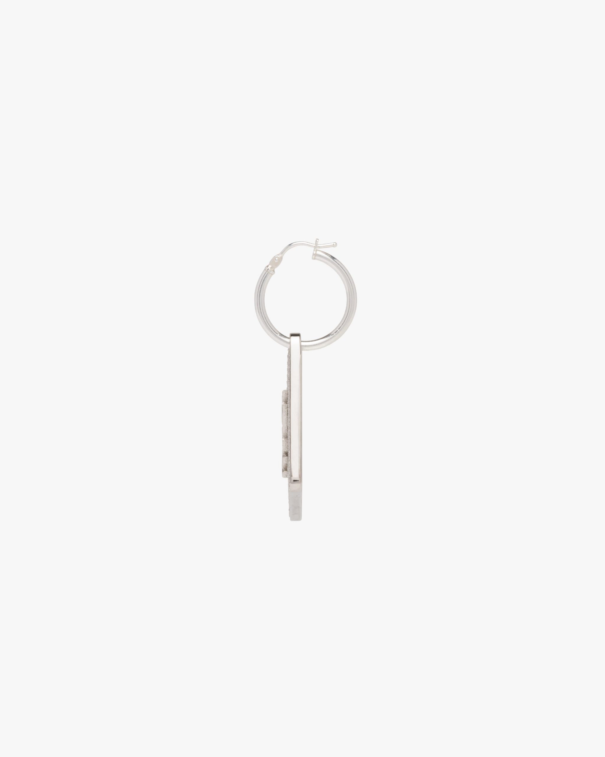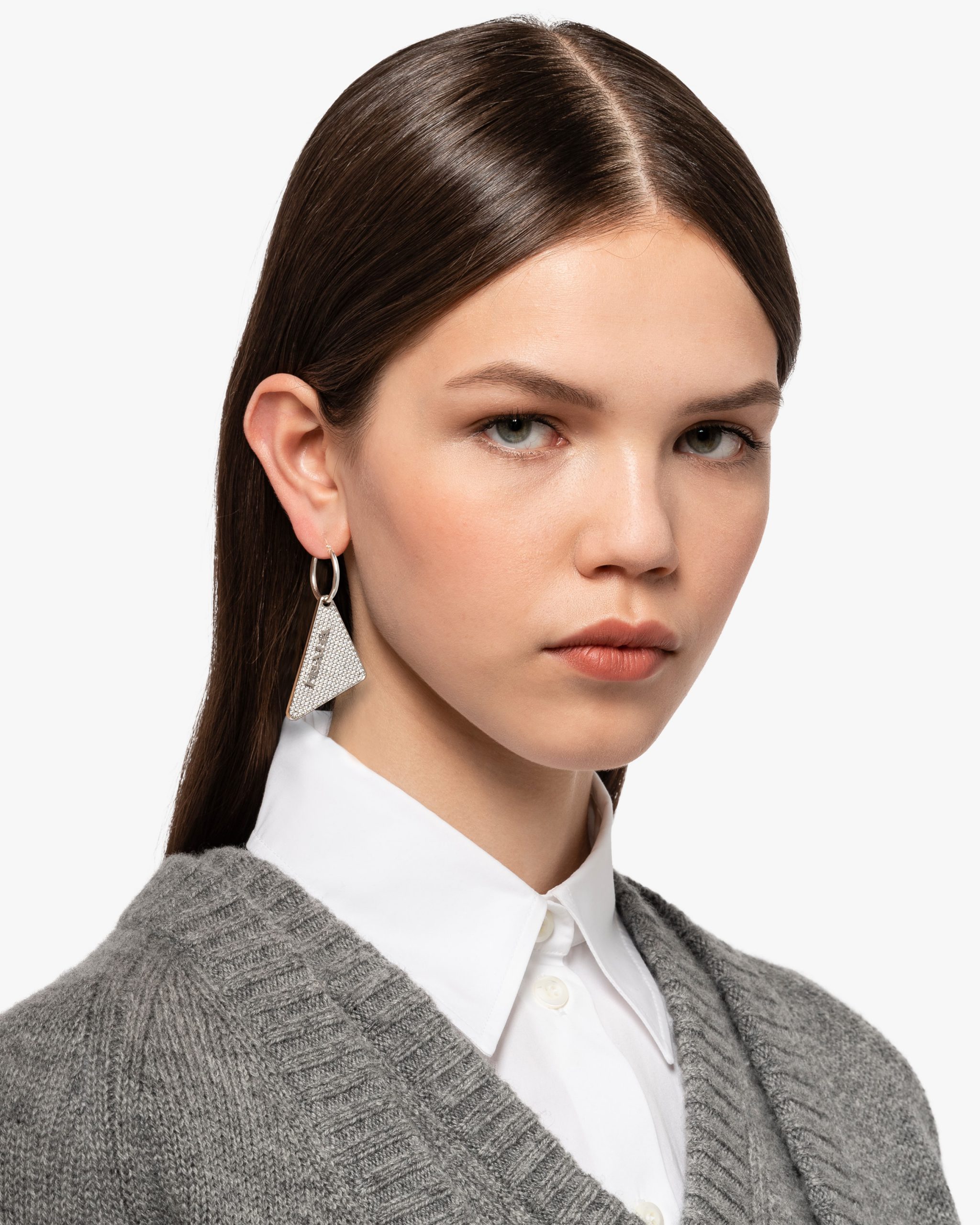 Prada plays with its most iconic shape, the triangle, which results in precious new details. The geometric logo illuminated with zircons defines the pendant of this single earring made of 925 sterling silver with a palladium finish.