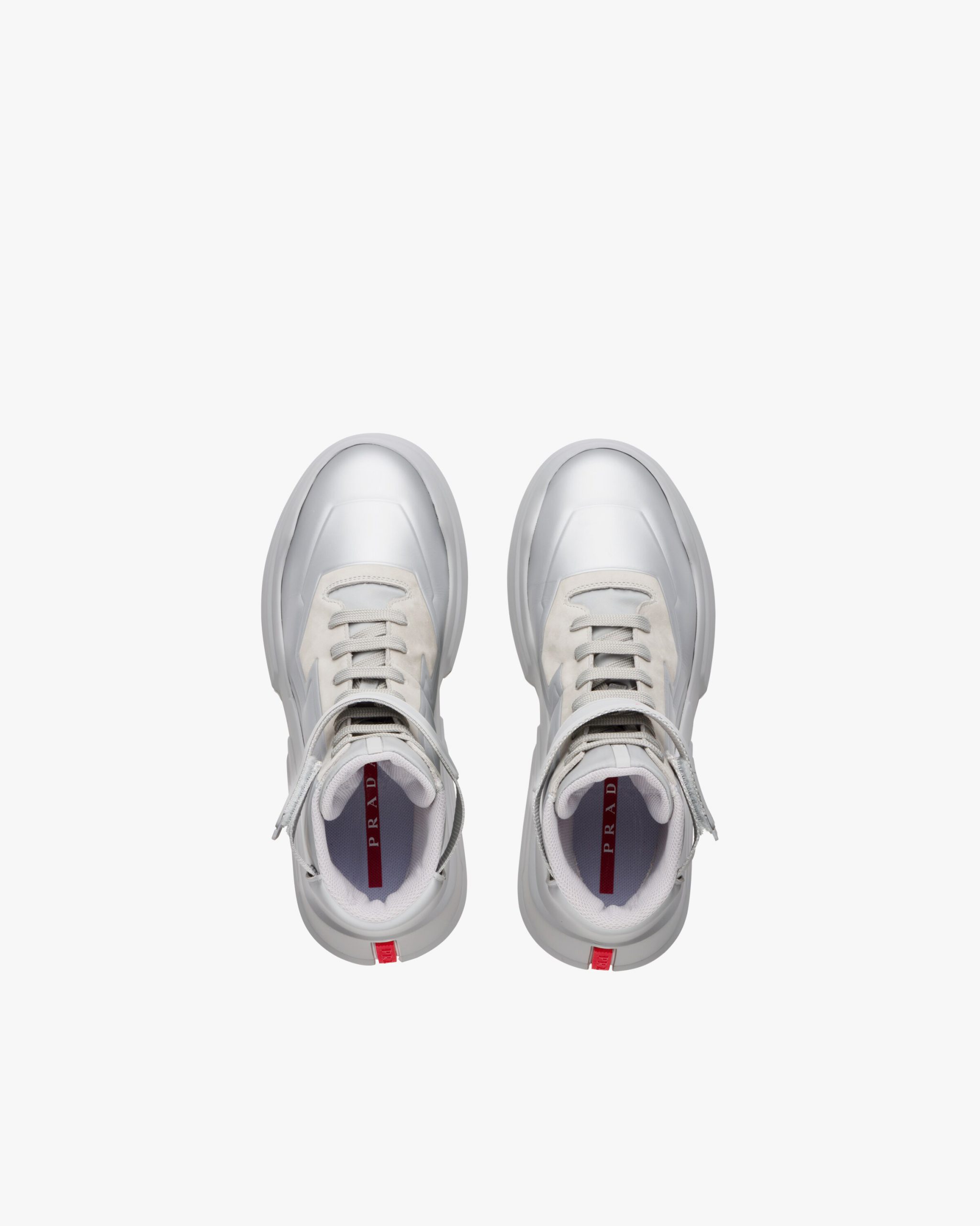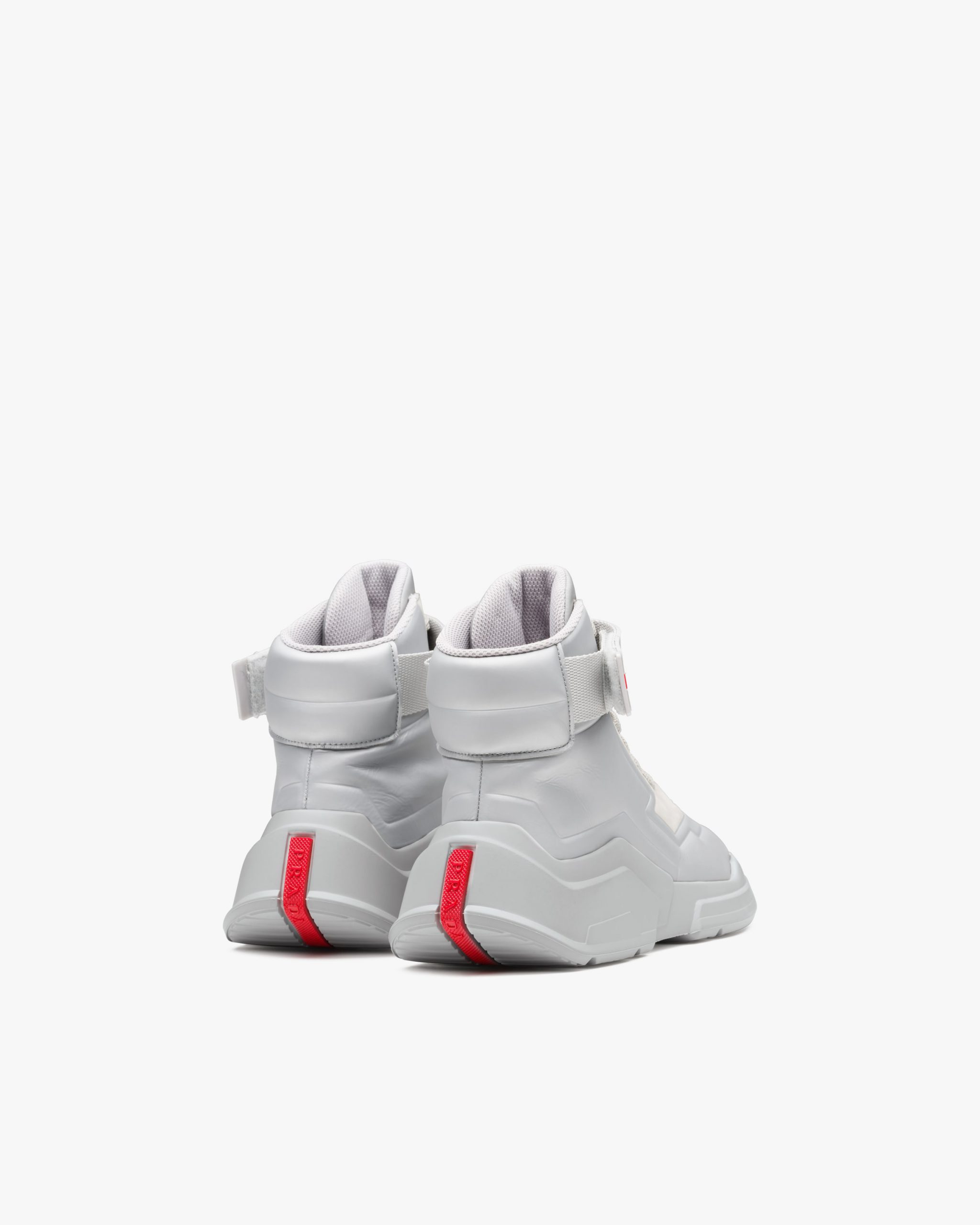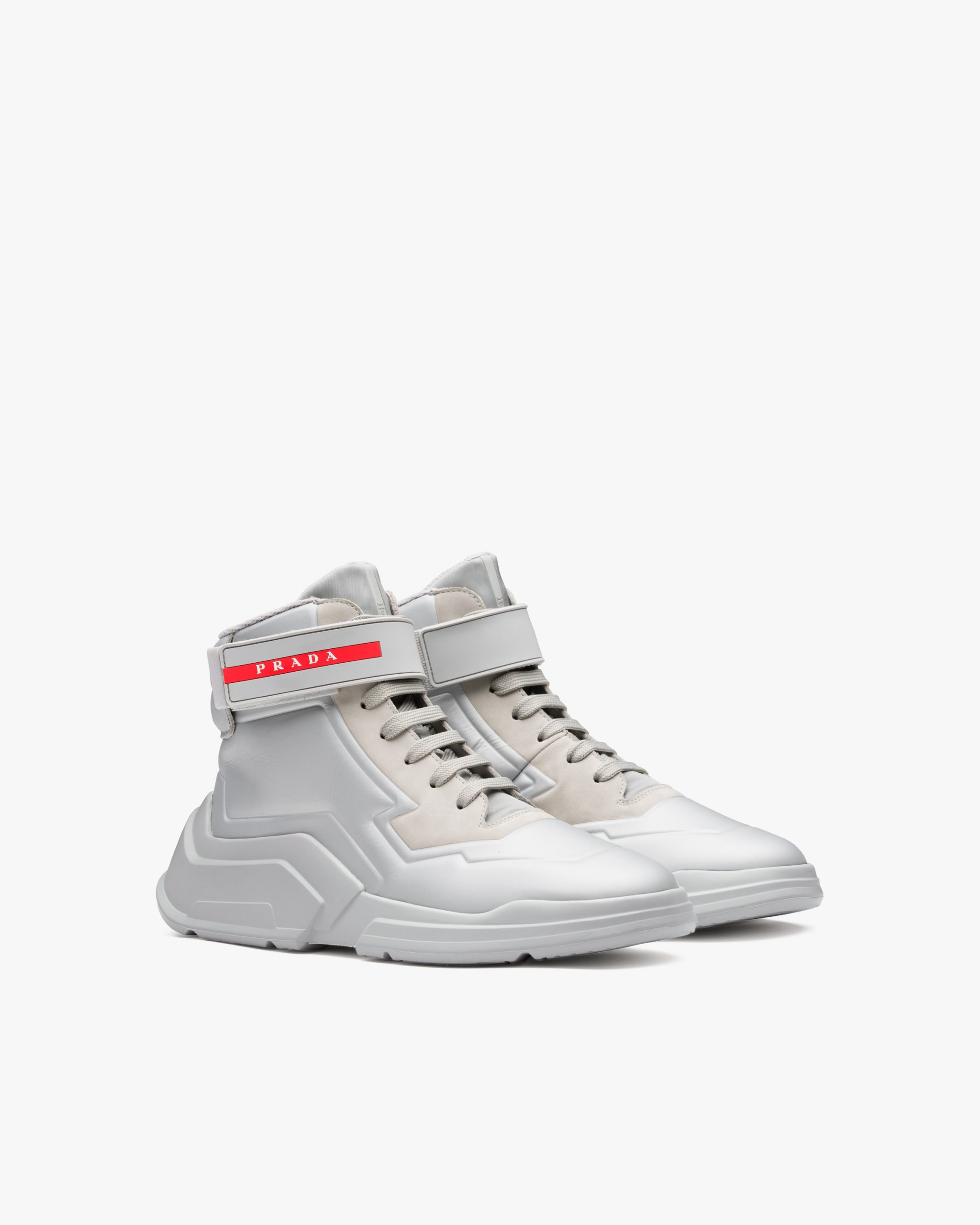 These leather high-top sneakers characterized by the hook and loop fastener strap with Prada Linea Rossa logo have a futuristic design.