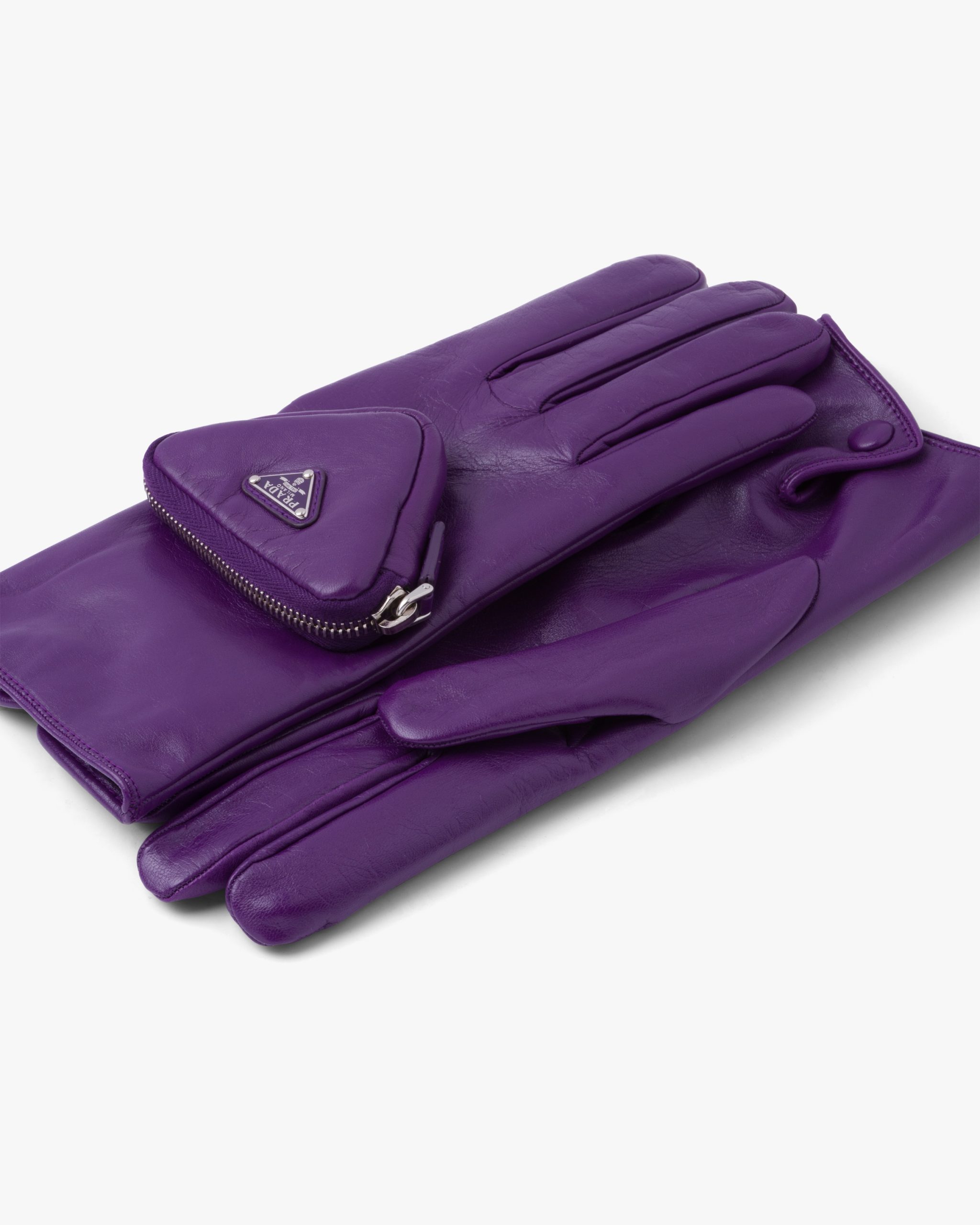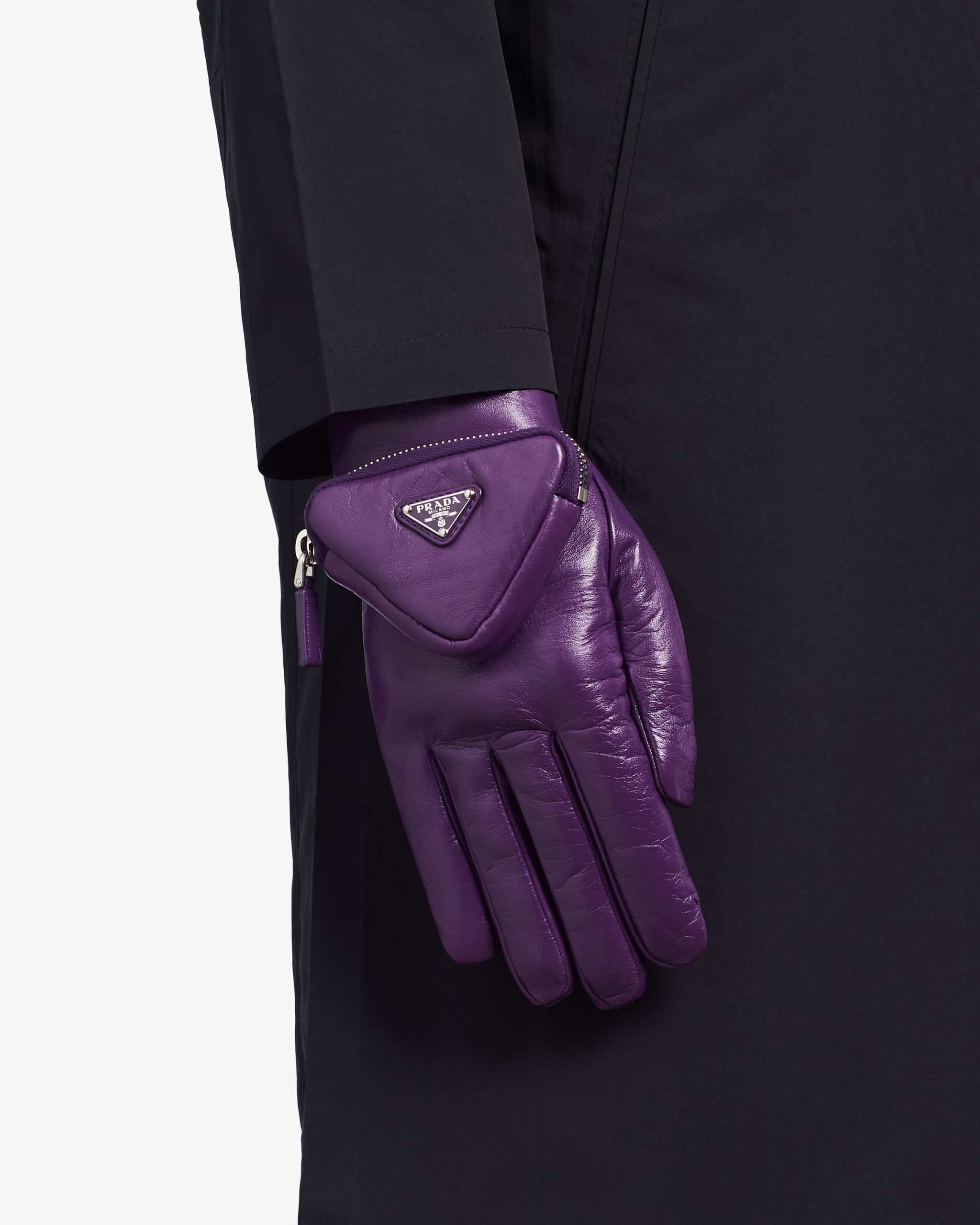 Made of glossy nappa leather with a slightly irregular surface similar to the leather used in the seventies, these gloves come in a series of lively shades and dark hues with a classic look. The design is made modern by the small zipper pocket and enamel triangle that decorates one of the two gloves, a recurrent element in garments and accessories of the Men’s Fall Winter 2021 collectsion.