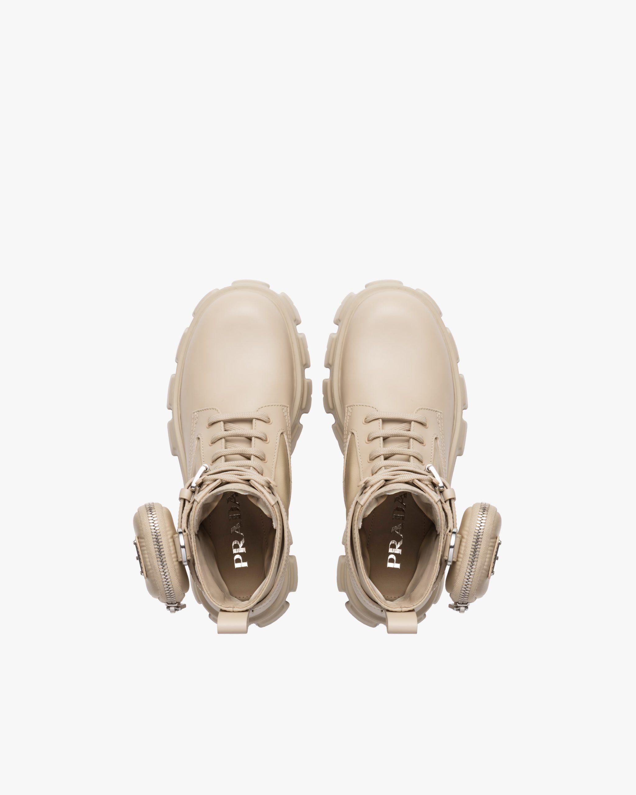 Monolith combat boots embody the hybrid soul of Prada. Made of leather and nylon, an industrial fabric traditionally tied to the brand, they are characterized for the combination of materials and stylistic codes for a voluminous design with chunky block sole. A removable pouch featuring the iconic enameled metal triangle logo decorates the footwear.