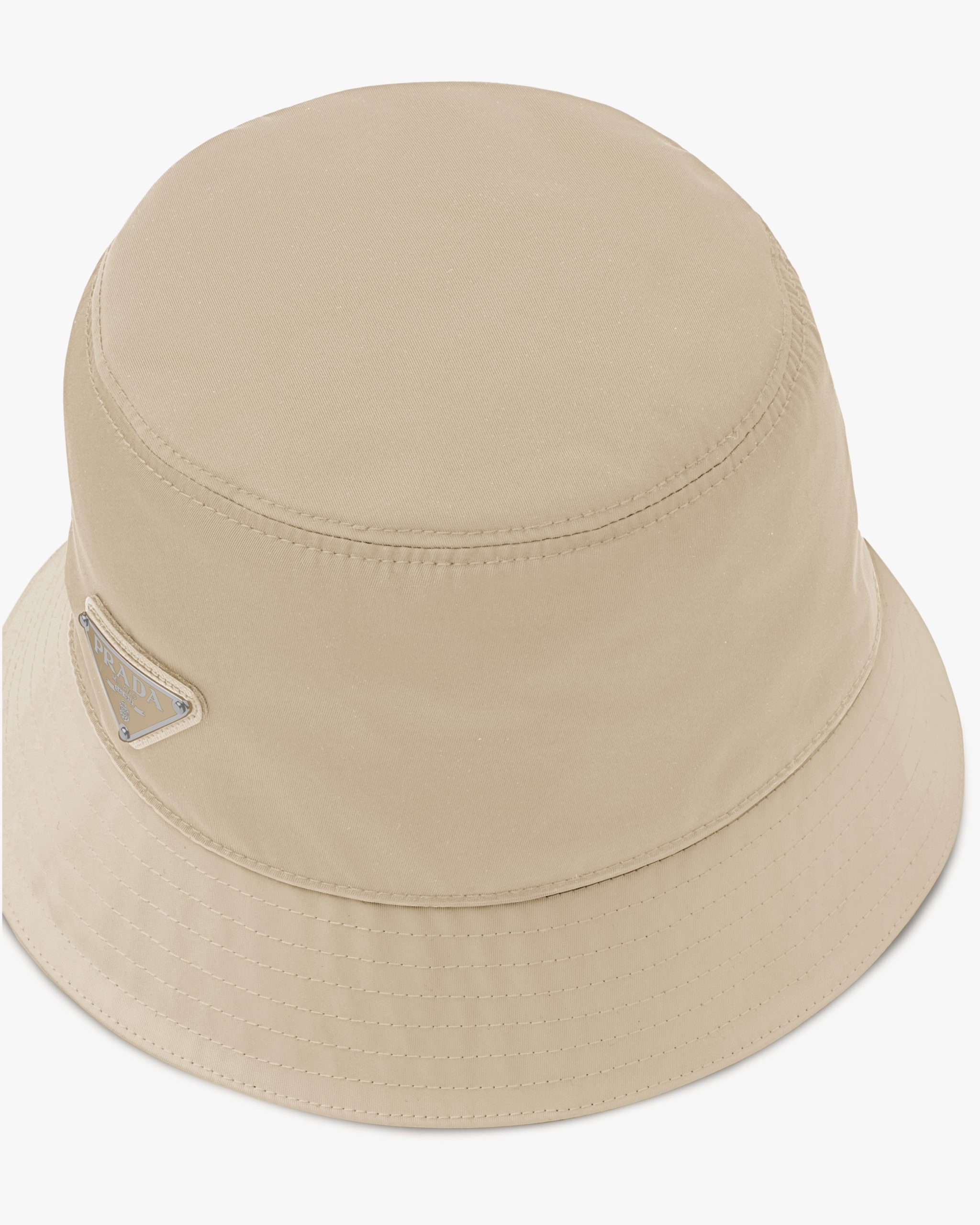 This bucket hat, an iconic accessory of Prada collectsions, is made of Re-Nylon: regenerated nylon yarn (ECONYL?)produced from recycled, purified plastic trash collectsed in the ocean, fishing nets and textile waste fibers.