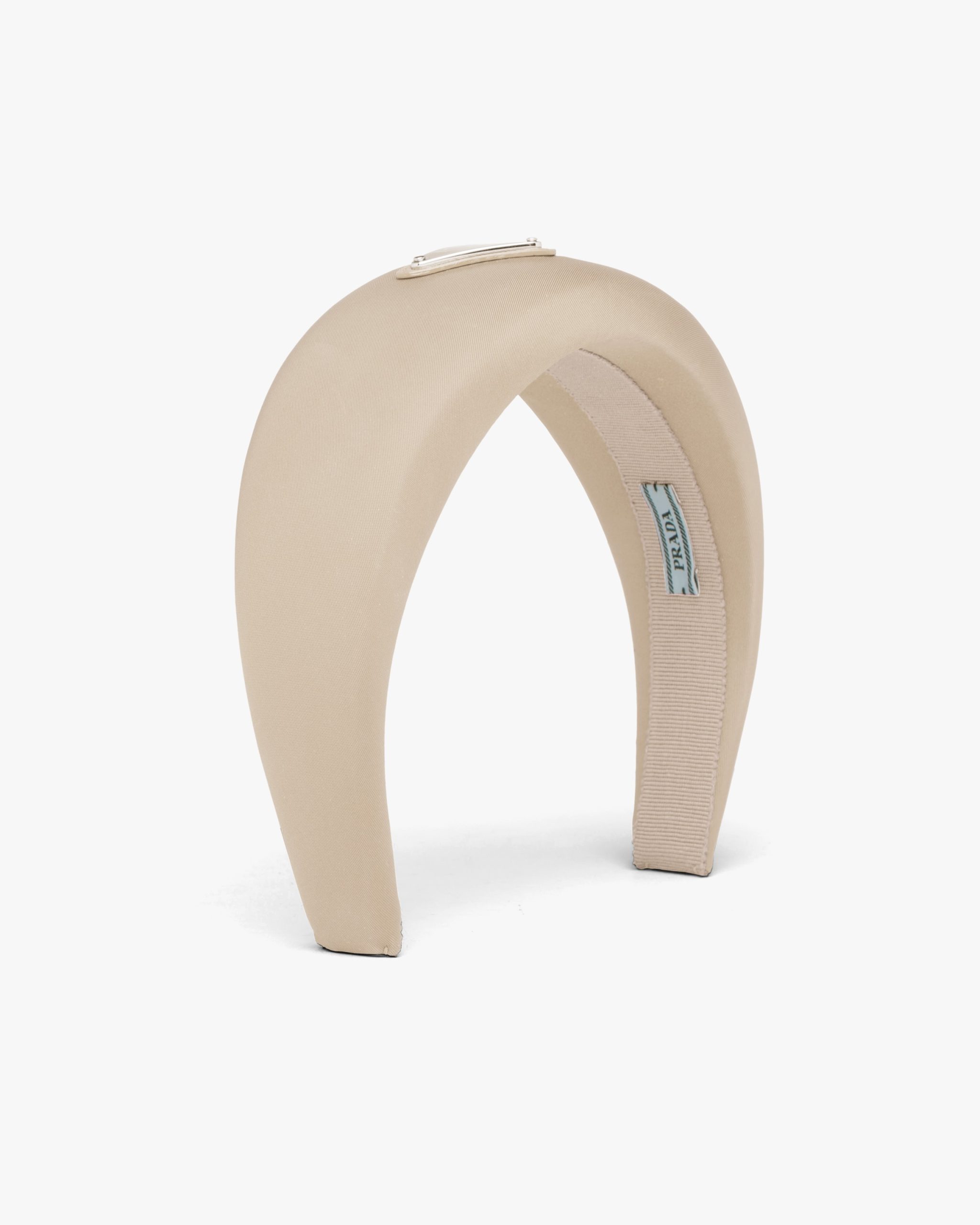 This oversized puffy headband, a sophisticated and emblematic accessory of Prada collectsions, is made of Re-Nylon: regenerated nylon yarn (ECONYL?)produced from recycled, purified plastic trash collectsed in the ocean, fishing nets and textile waste fibers.