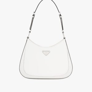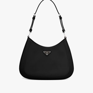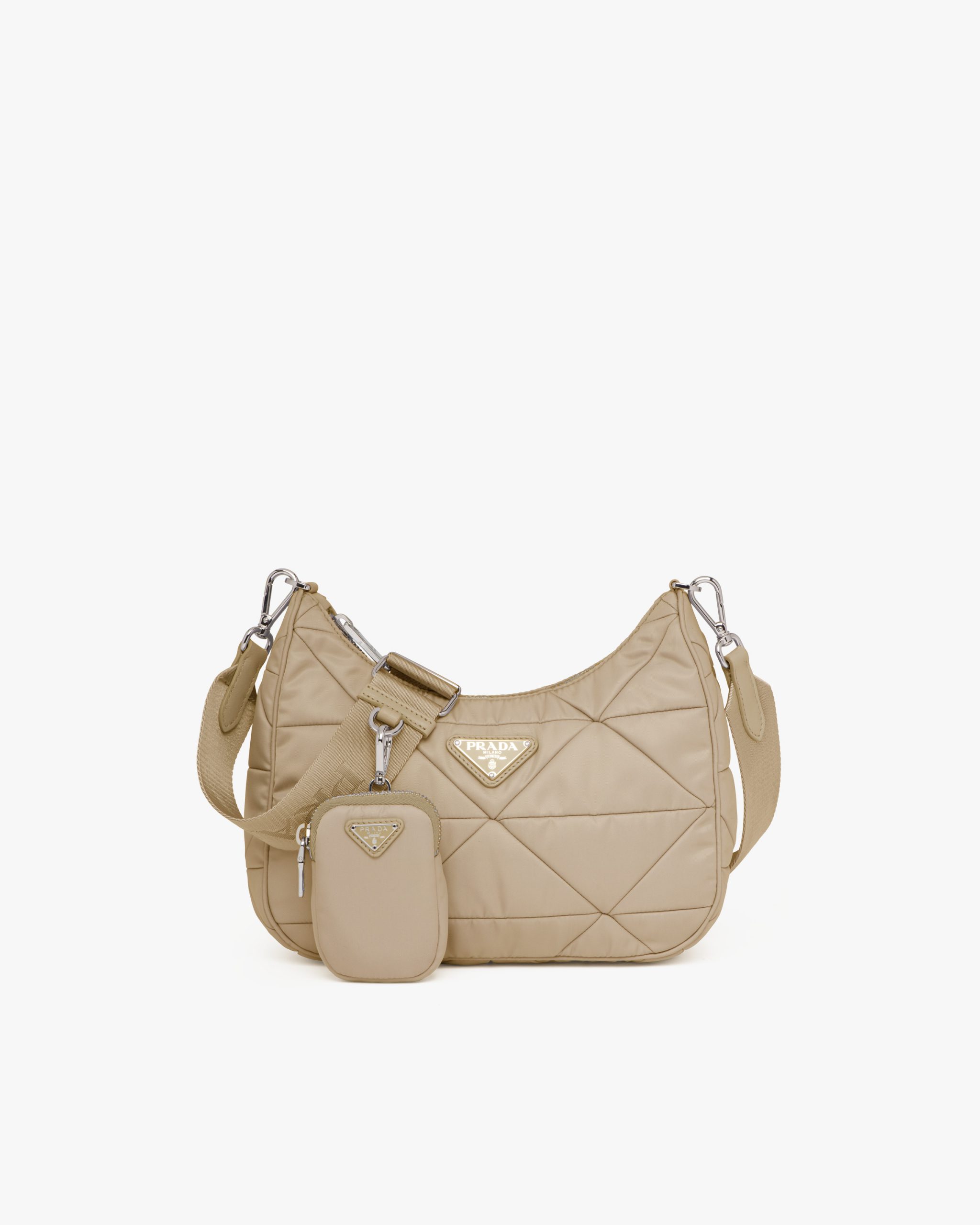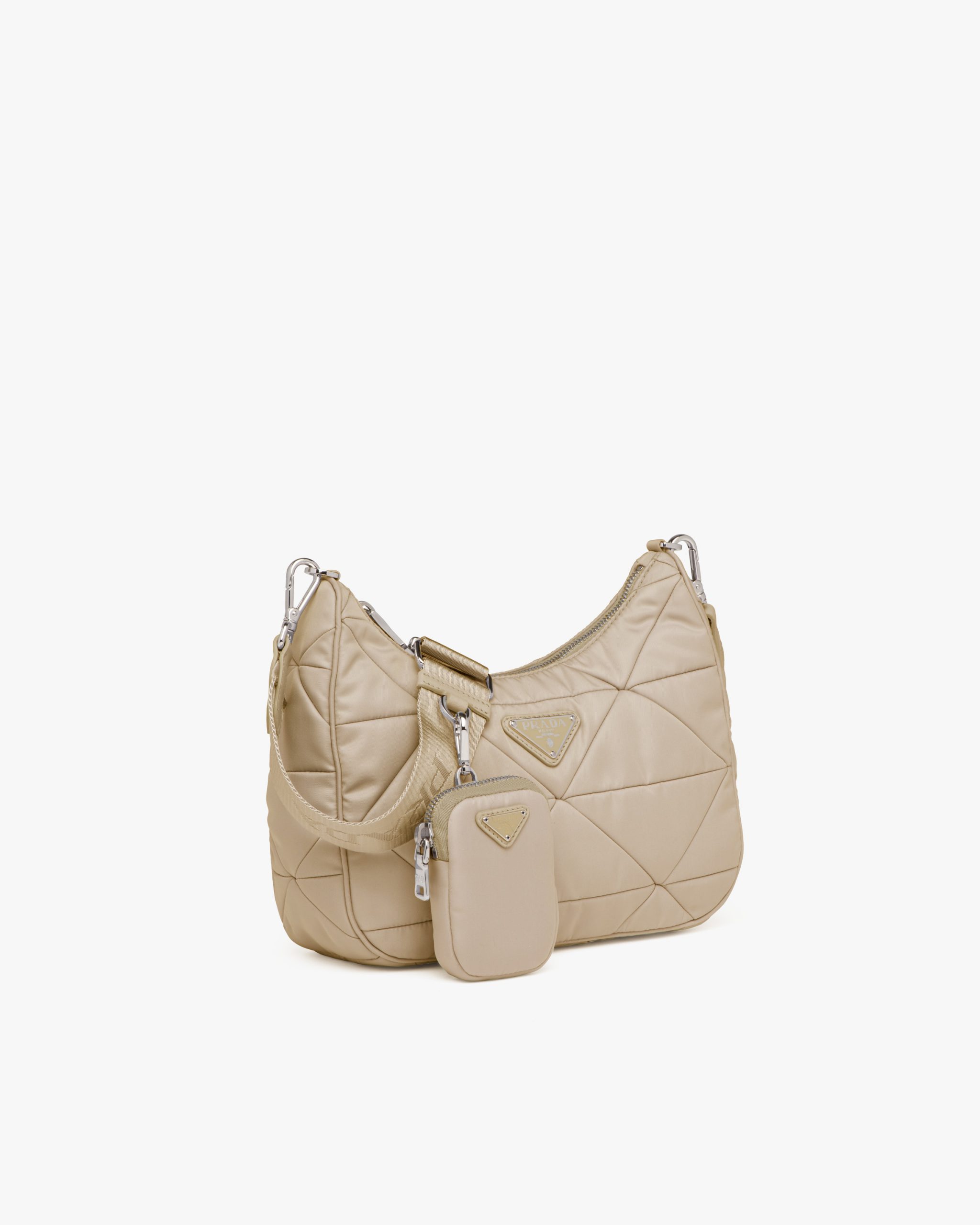 A patchwork effect triangle motif characterizes this padded hobo bag made of Re-Nylon and designed to also be worn as a shoulder bag thanks to the adjustable logo-print strap. Embellished on the front by the iconic enameled triangle logo, the multifunctional accessory is completed with a detachable nylon zipper pouch that attaches to the shoulder strap.