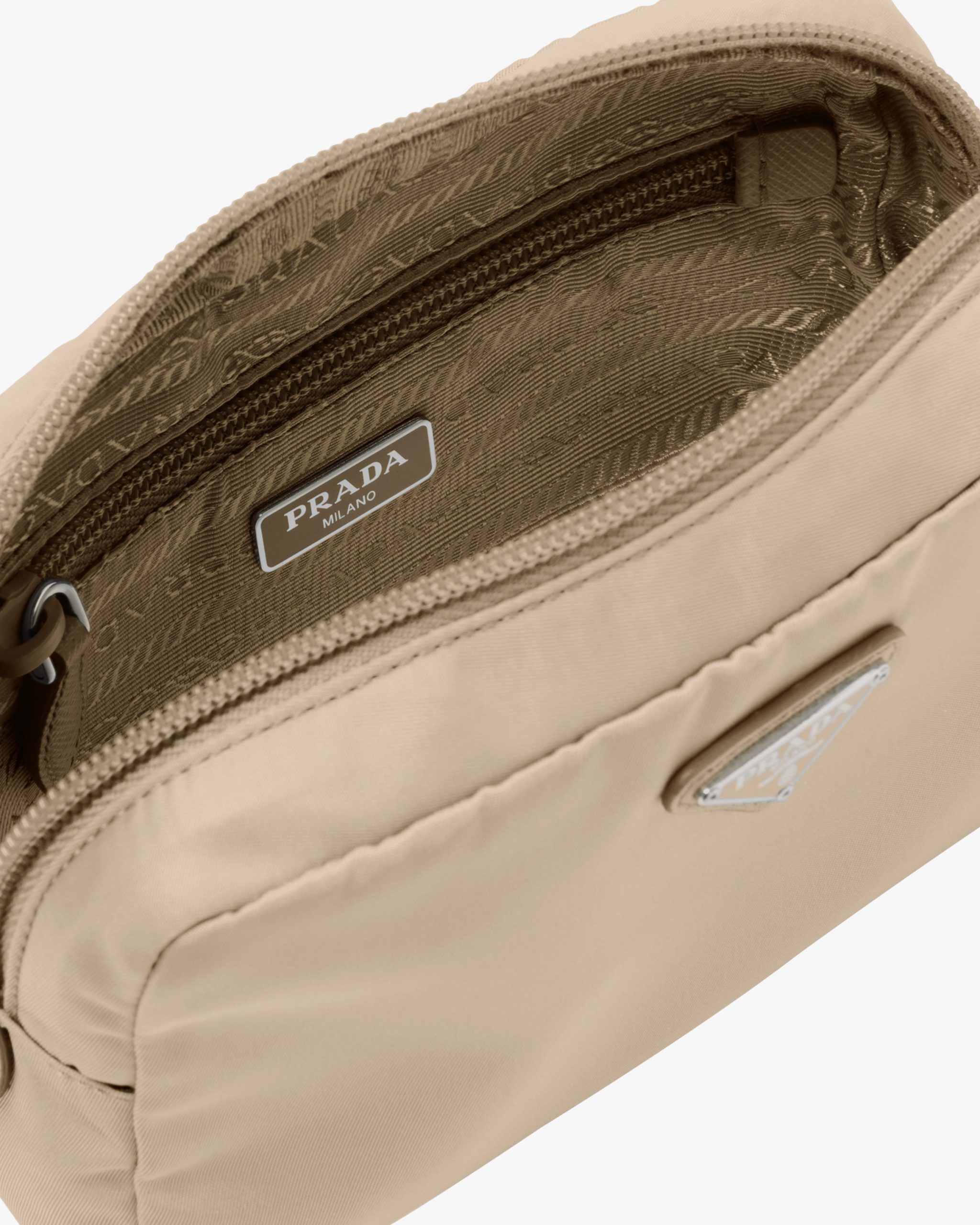 Made of Prada’s innovative Re-Nylon fabric produced from recycled plastic materials collectsed in the ocean, this pouch stands out for its practical attitude expressed by the removable strap on the side. The zipper closure has a metal zipper pull, while the interior has logo-print fabric lining.