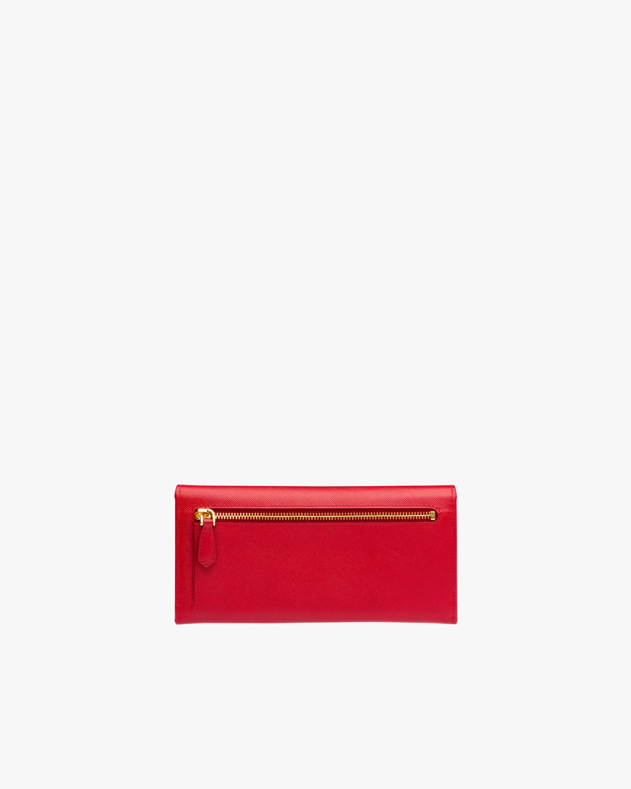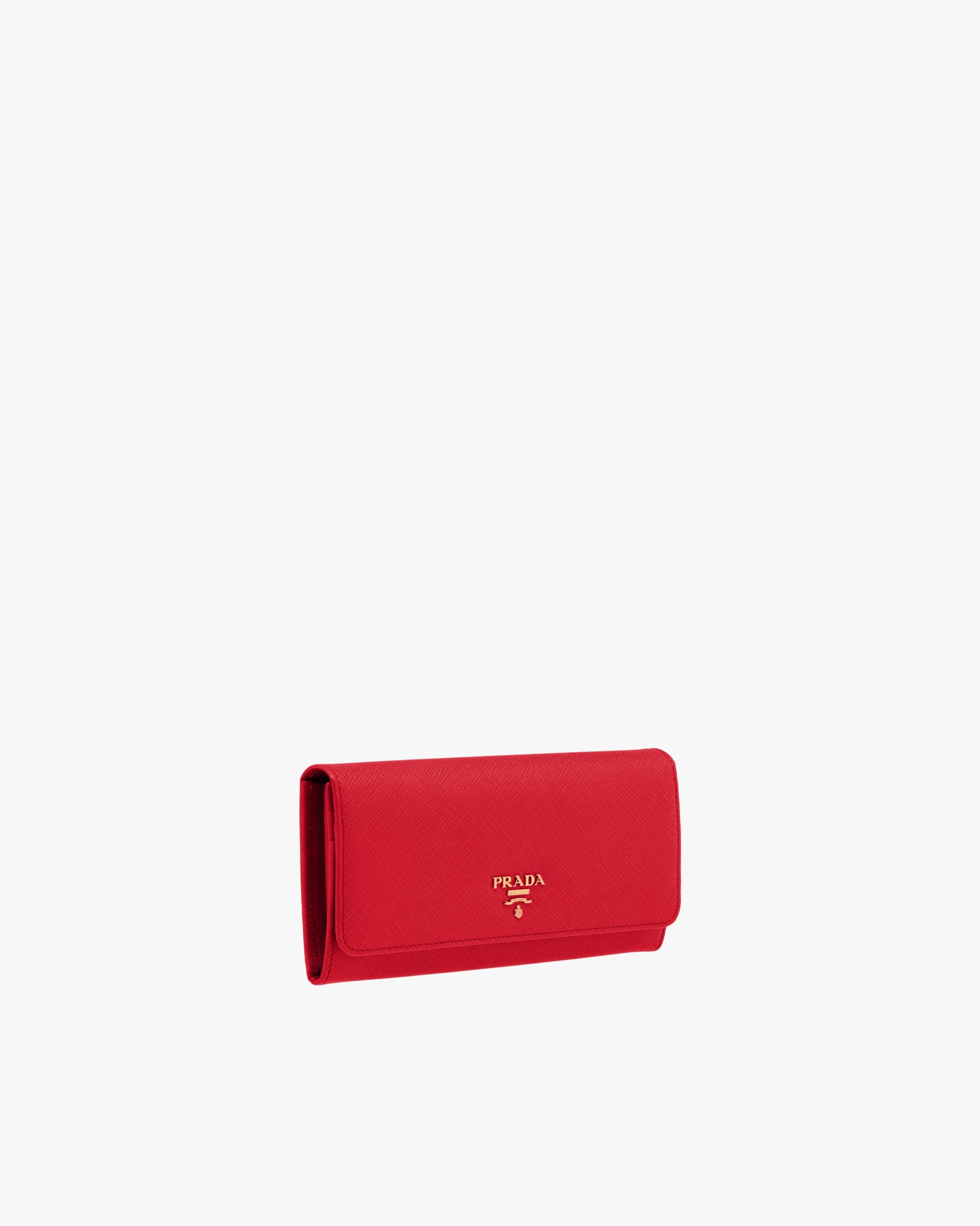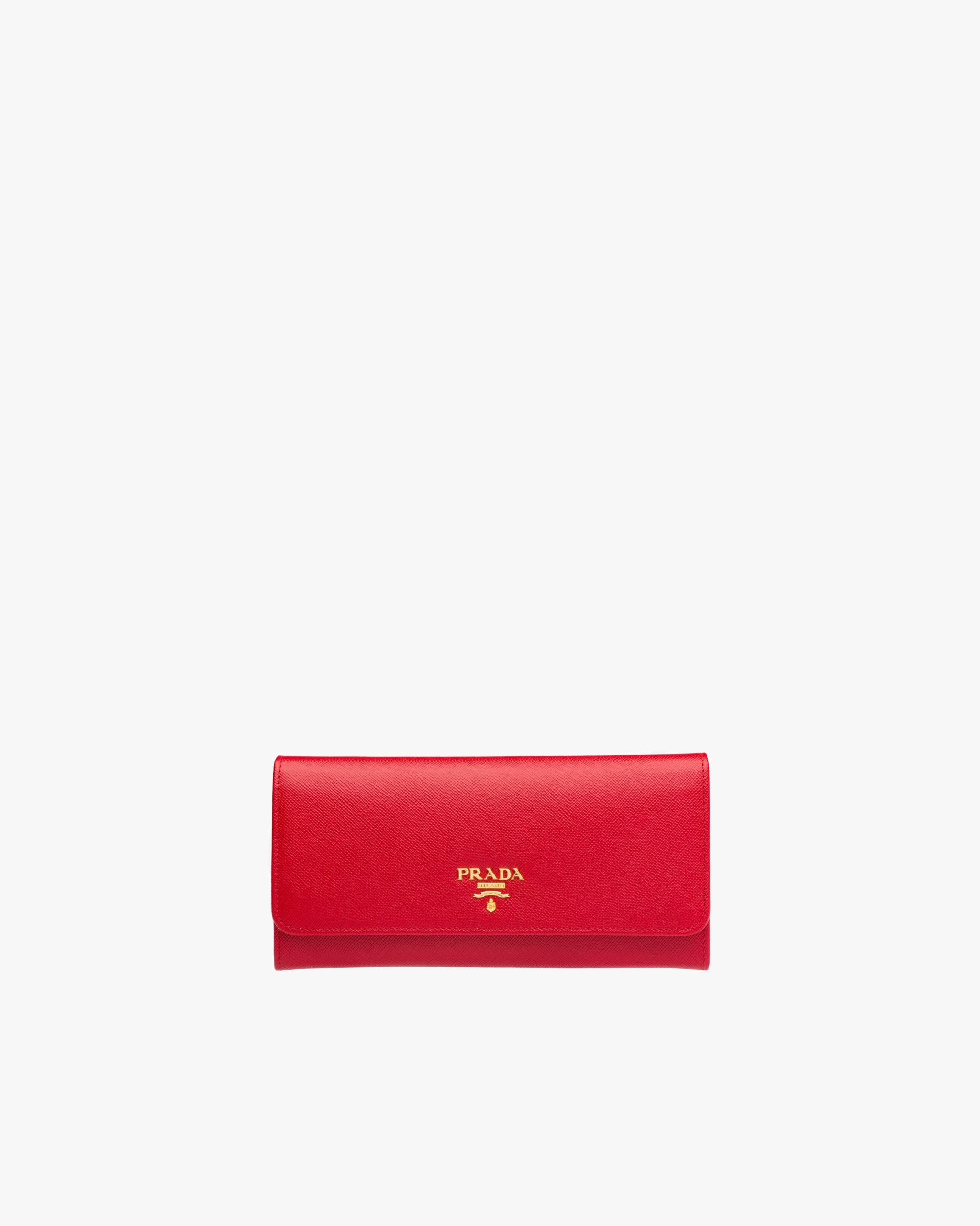 Decorated with Prada lettering, this flap wallet is crafted in Saffiano leather. The double snap closure opens to various compartments, pockets and an extractable badge and credit card holder.