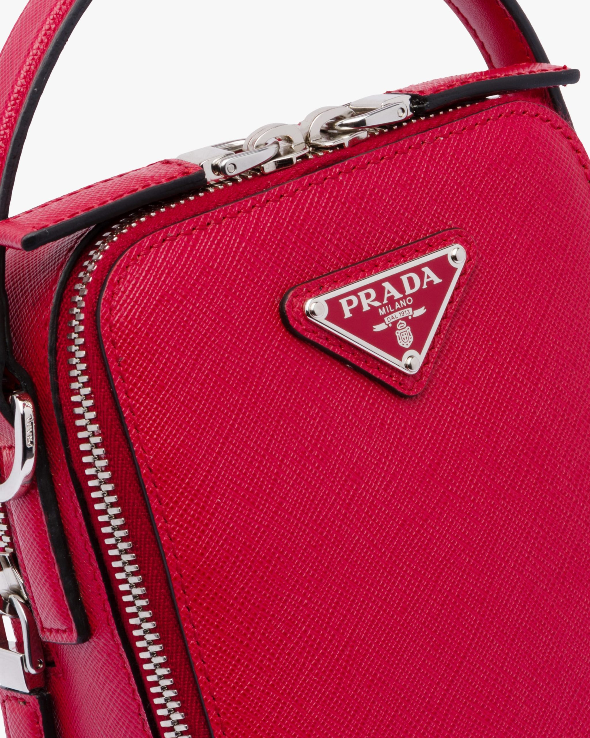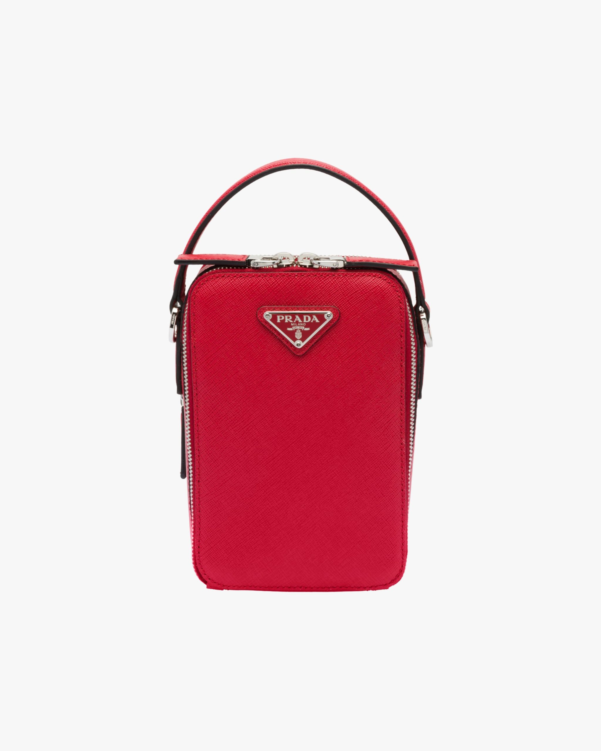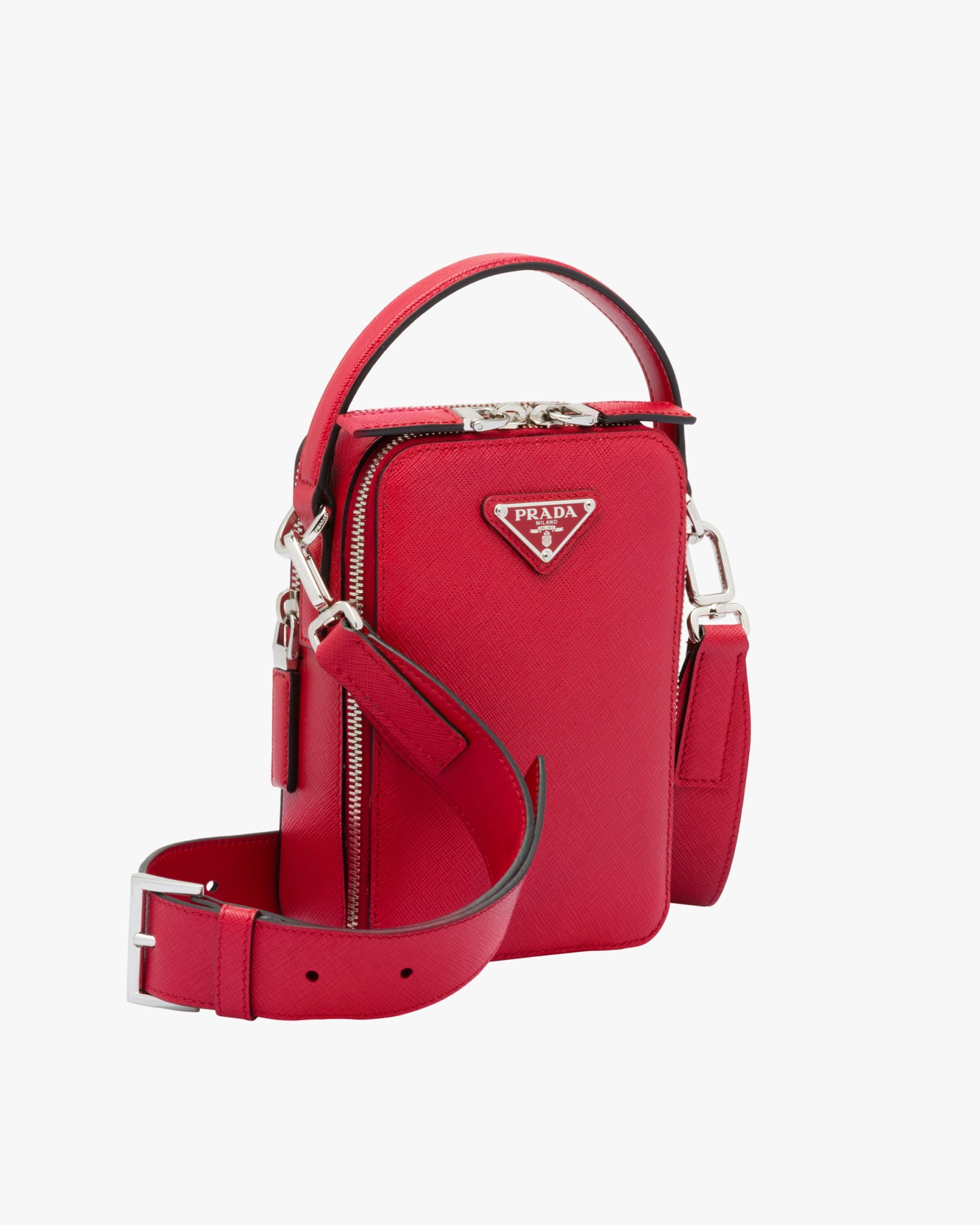 Saffiano leather bandoleer bag with metal triangle logo. The bag has two outside zipper pockets. A leather shoulder strap completes the accessory.