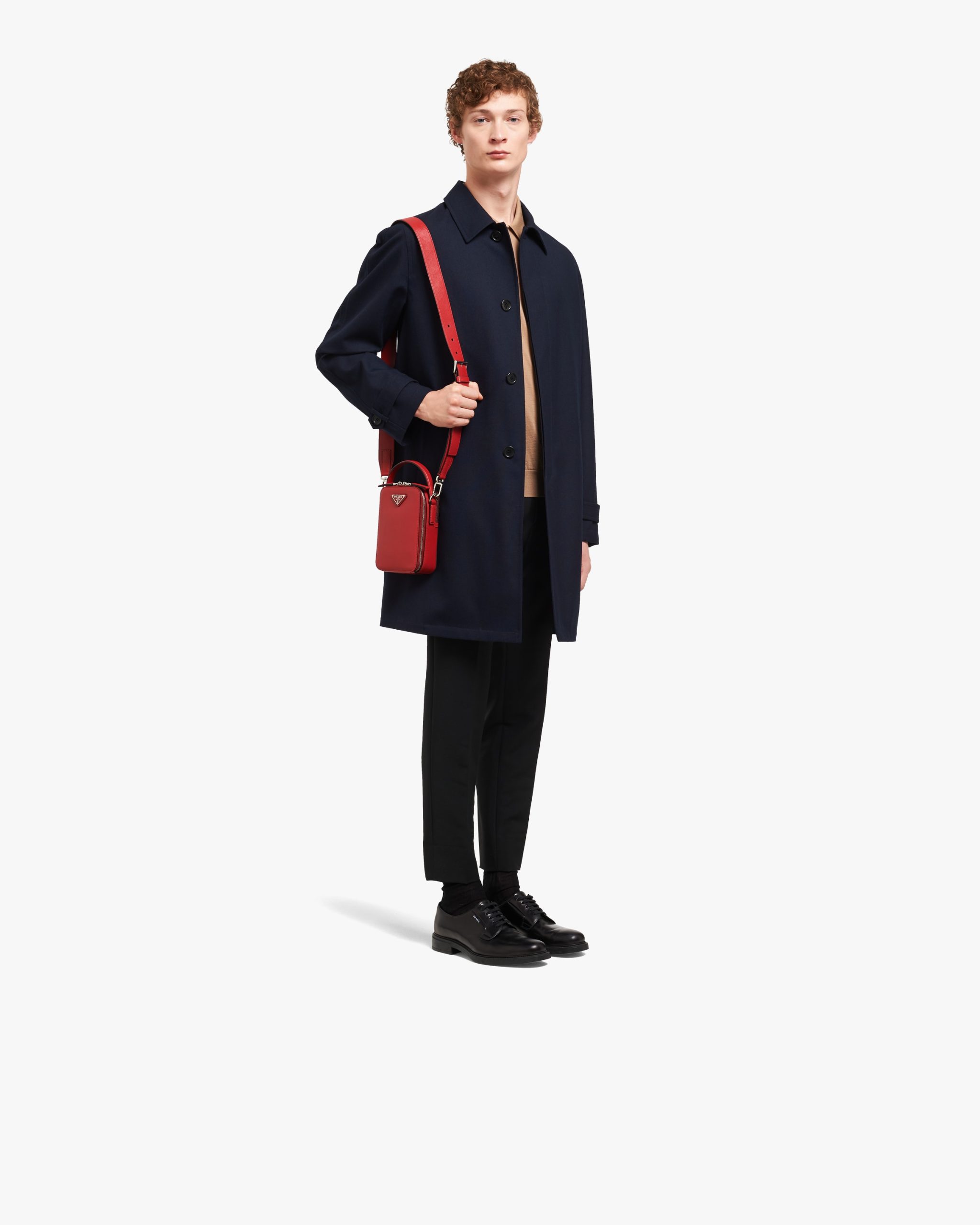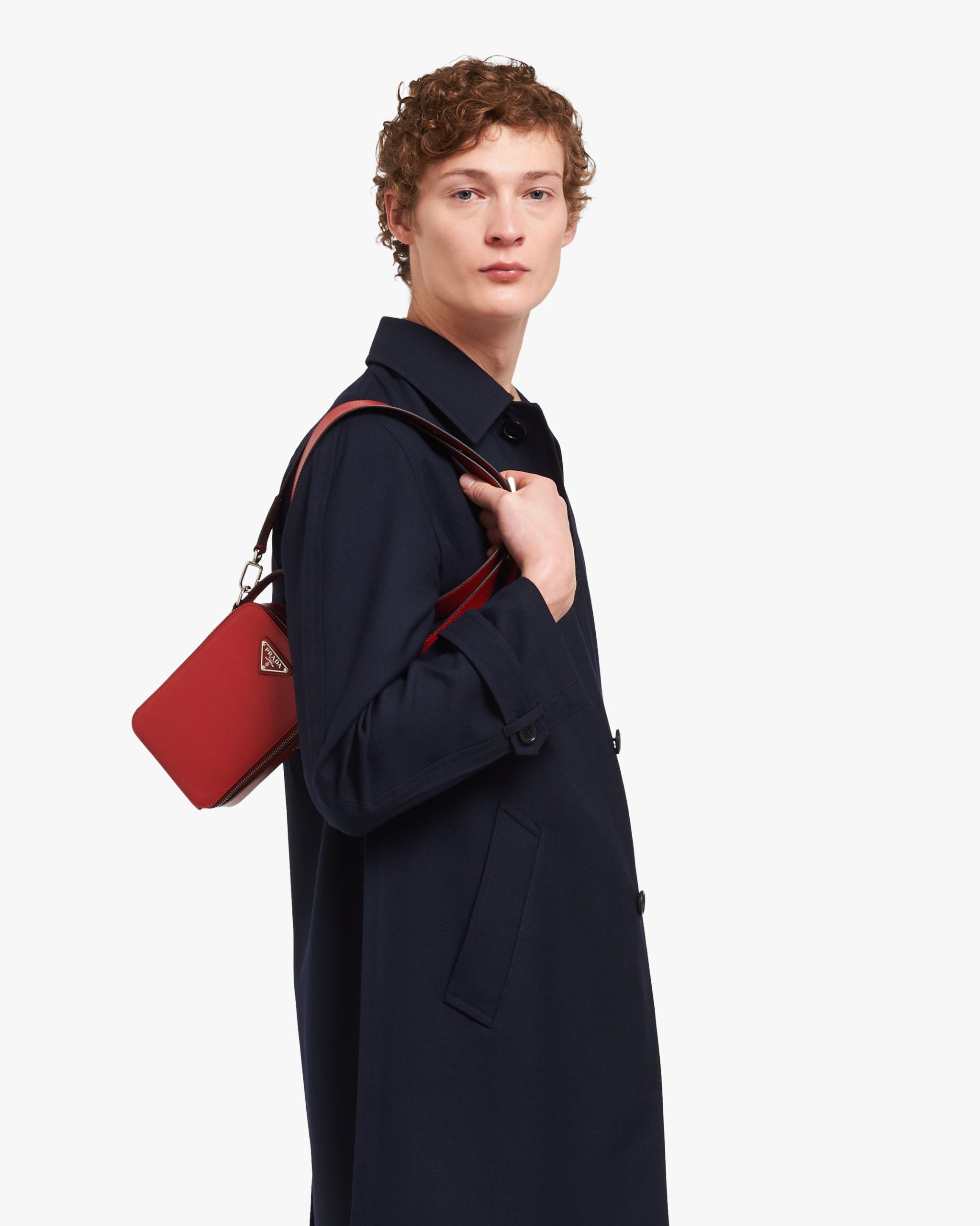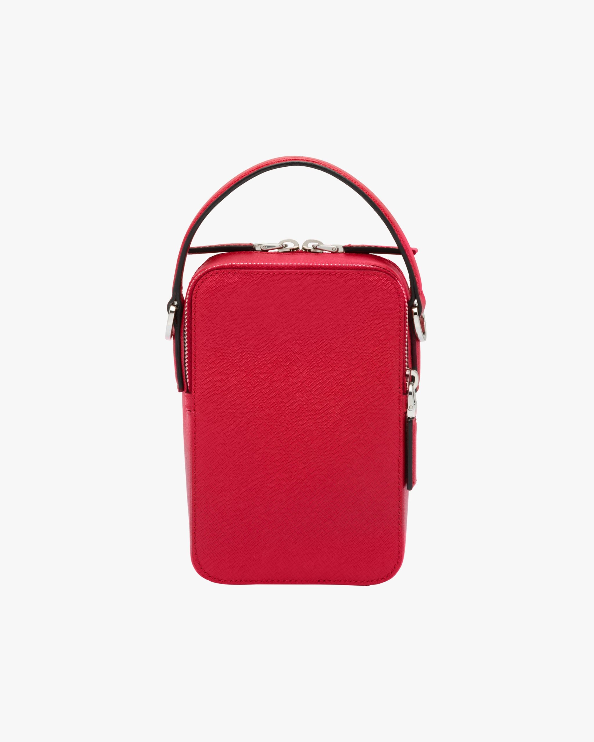 Saffiano leather bandoleer bag with metal triangle logo. The bag has two outside zipper pockets. A leather shoulder strap completes the accessory.