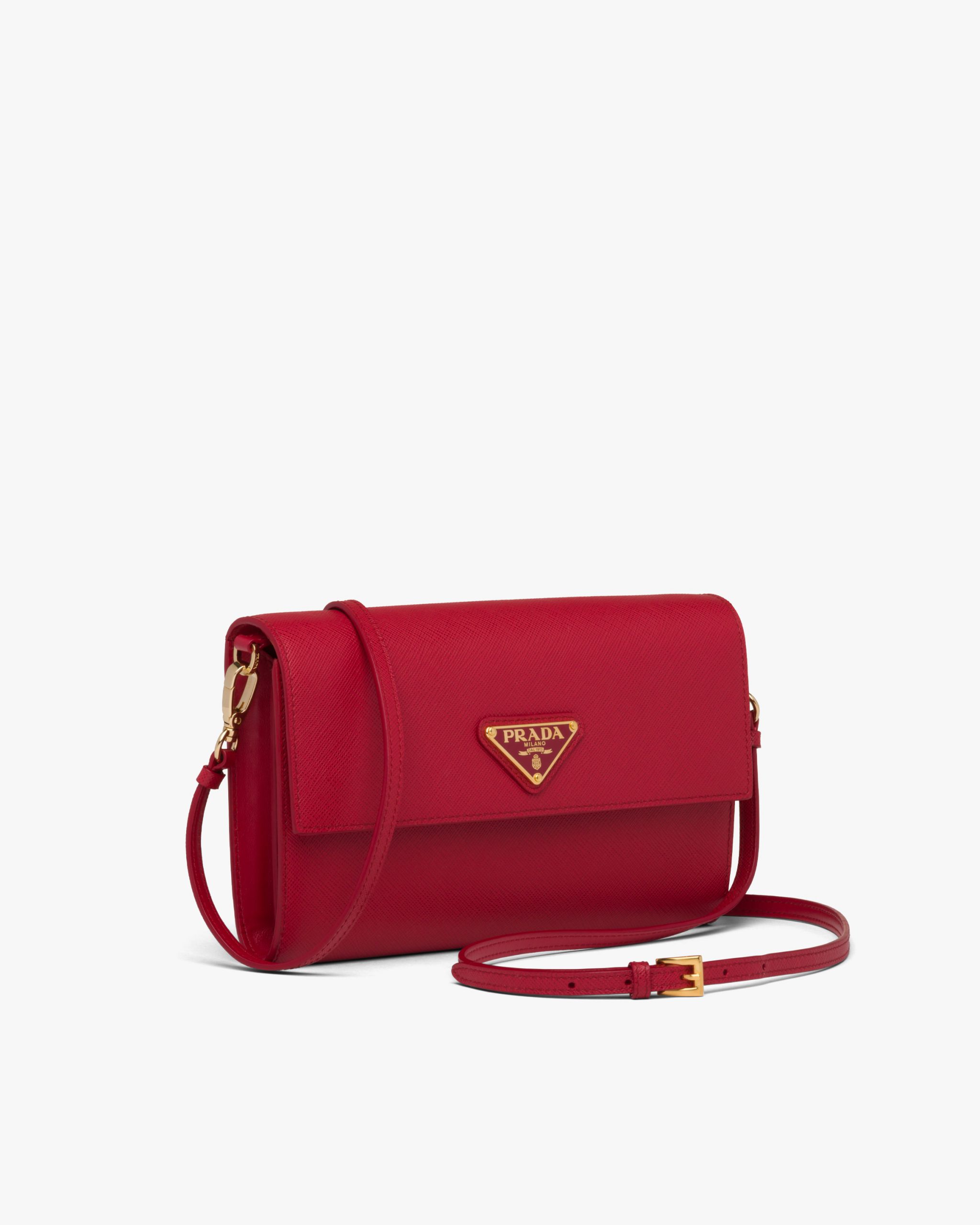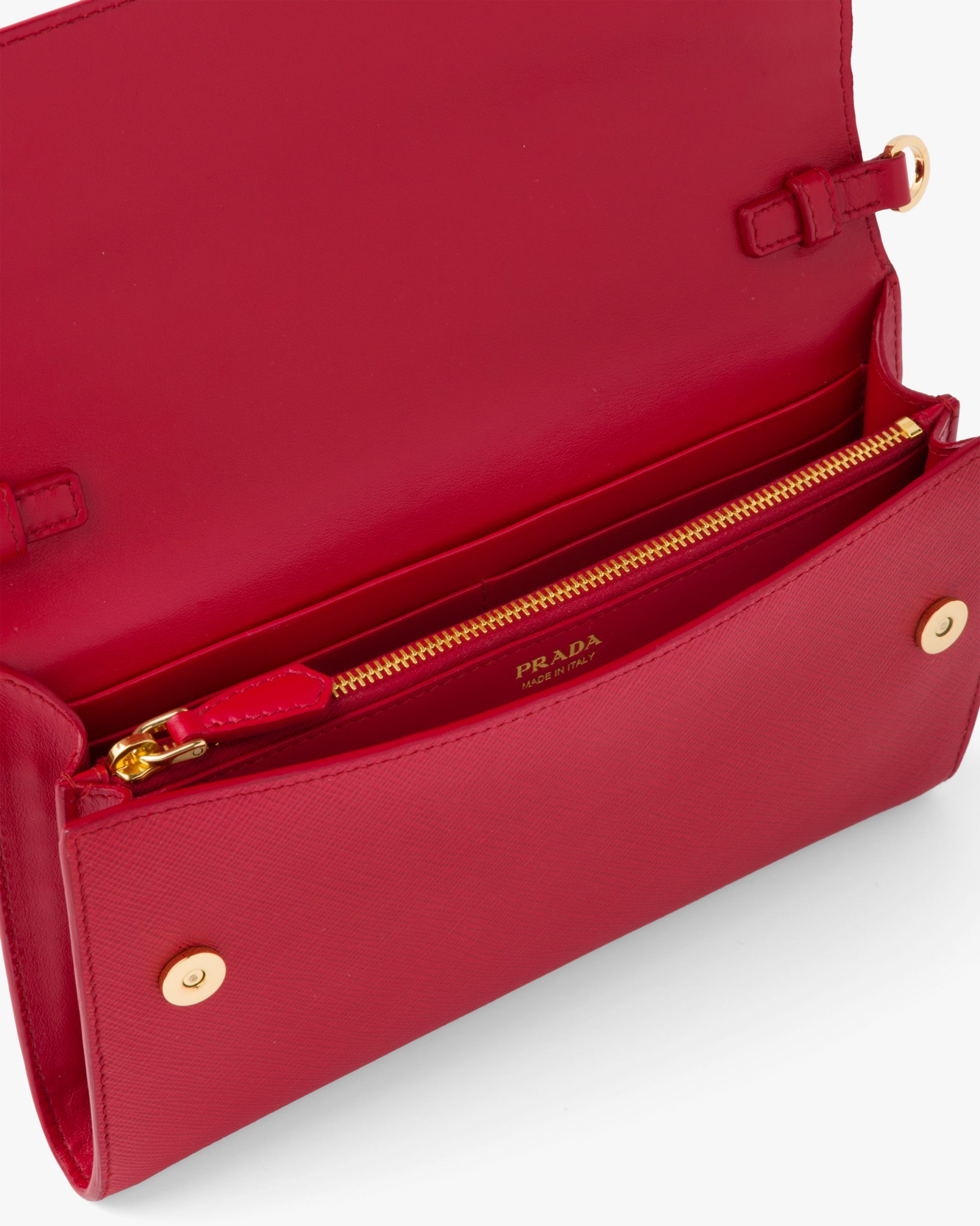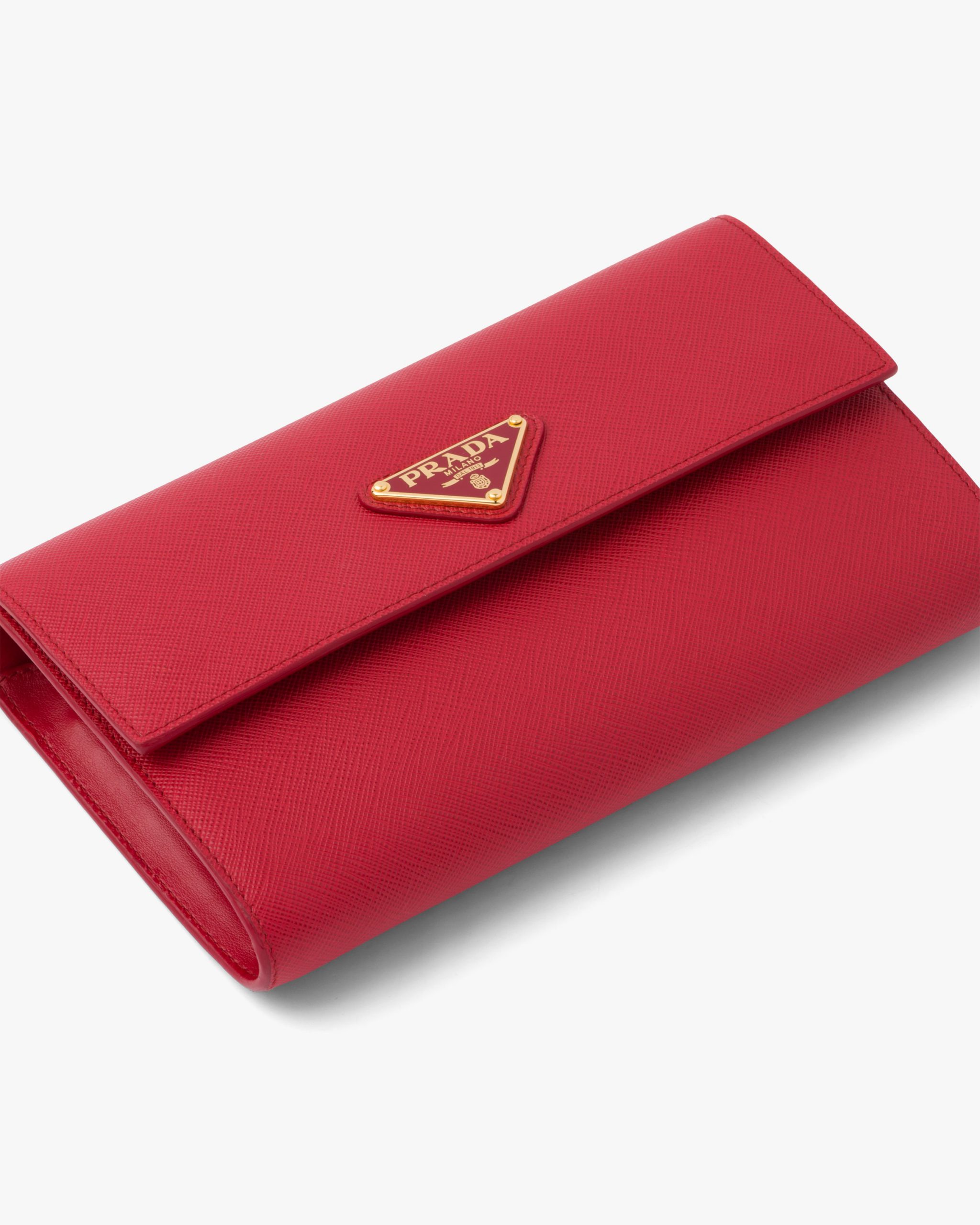 This Saffiano leather wallet embellished with an enameled metal triangle logo is even more versatile with its elegant detachable shoulder strap. It has several compartments and pockets inside.