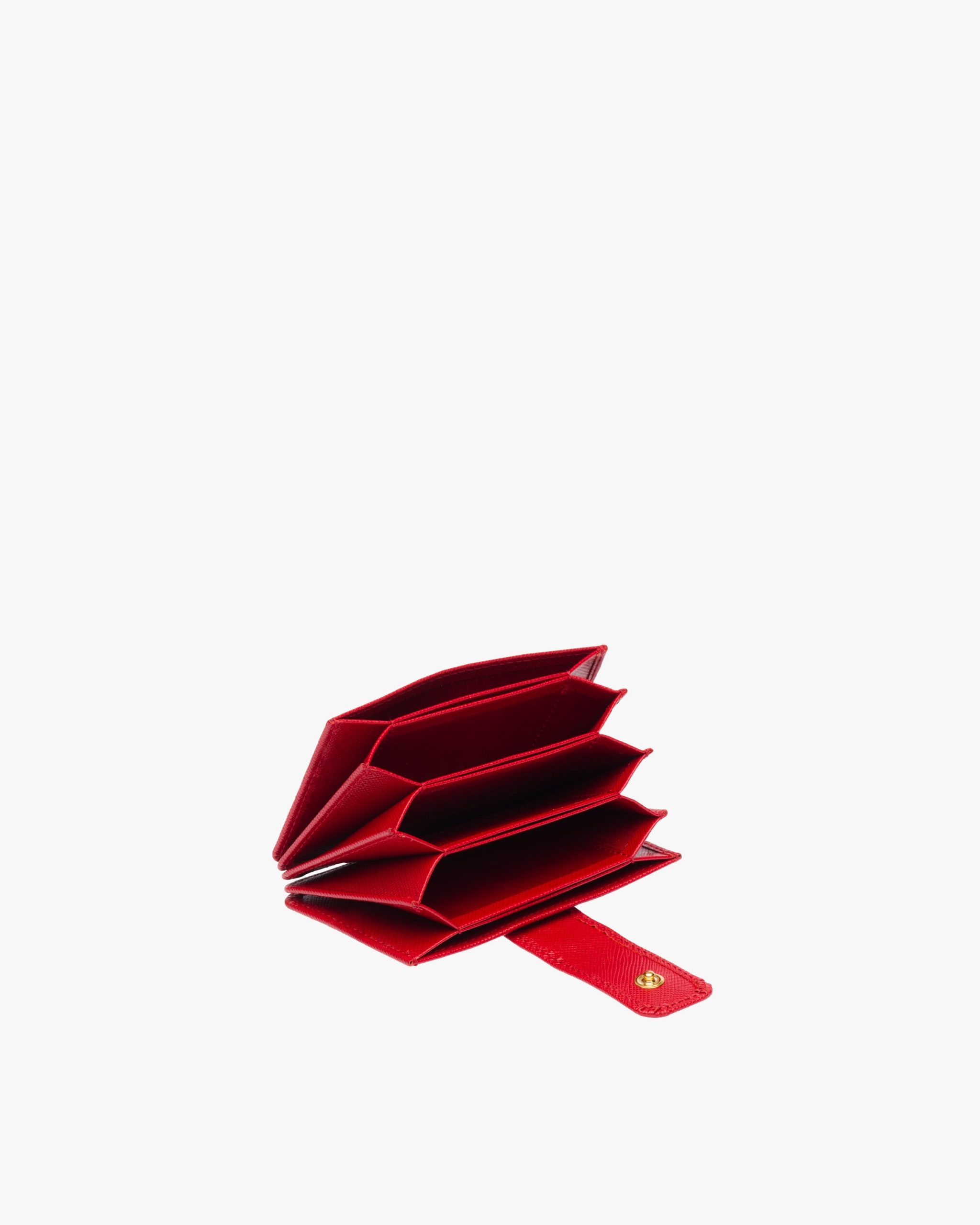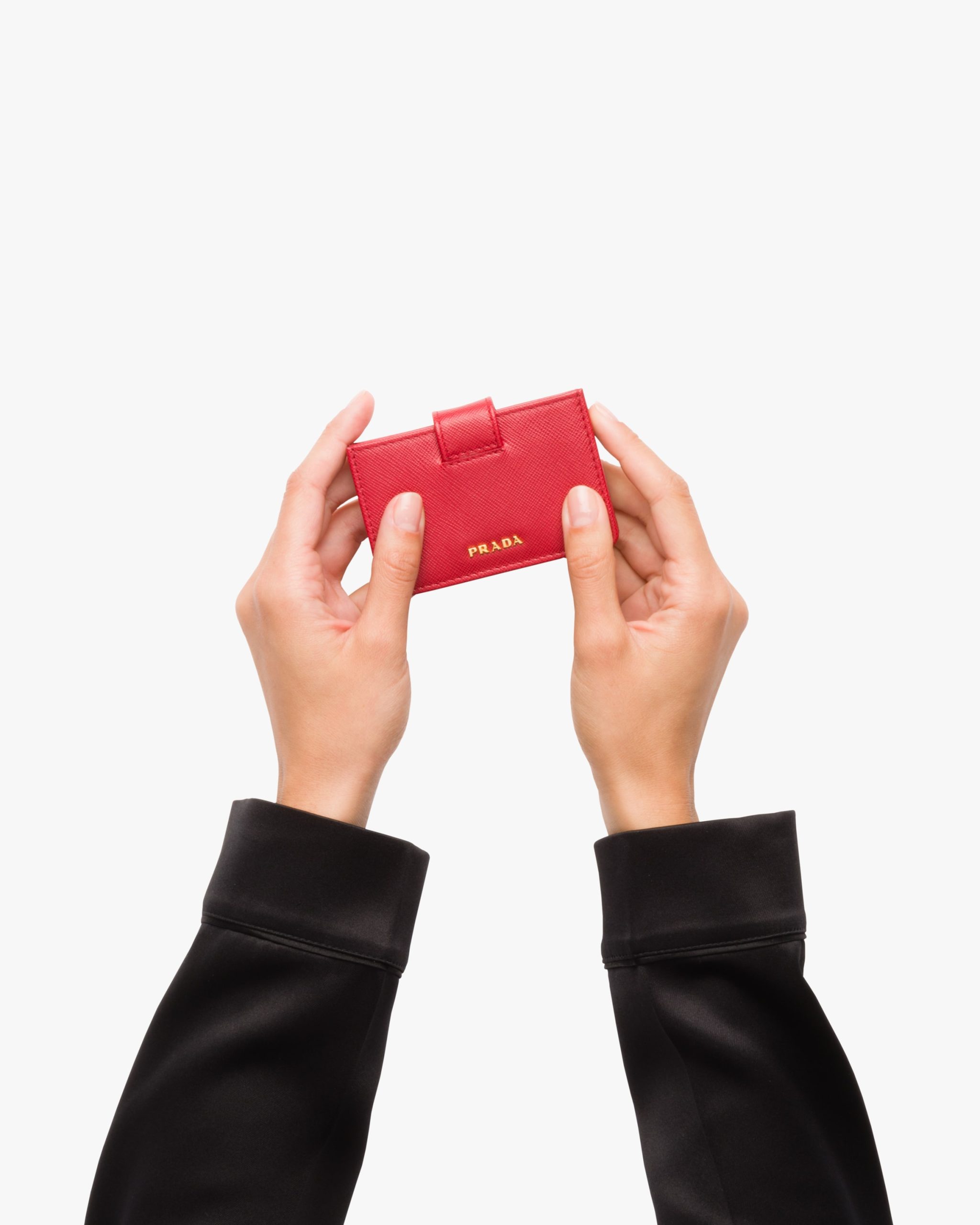 A Saffiano leather wallet with gold-finish Prada lettering. The snap closure releases from the back, giving way to five slots with bellow sides for credit cards or tickets.