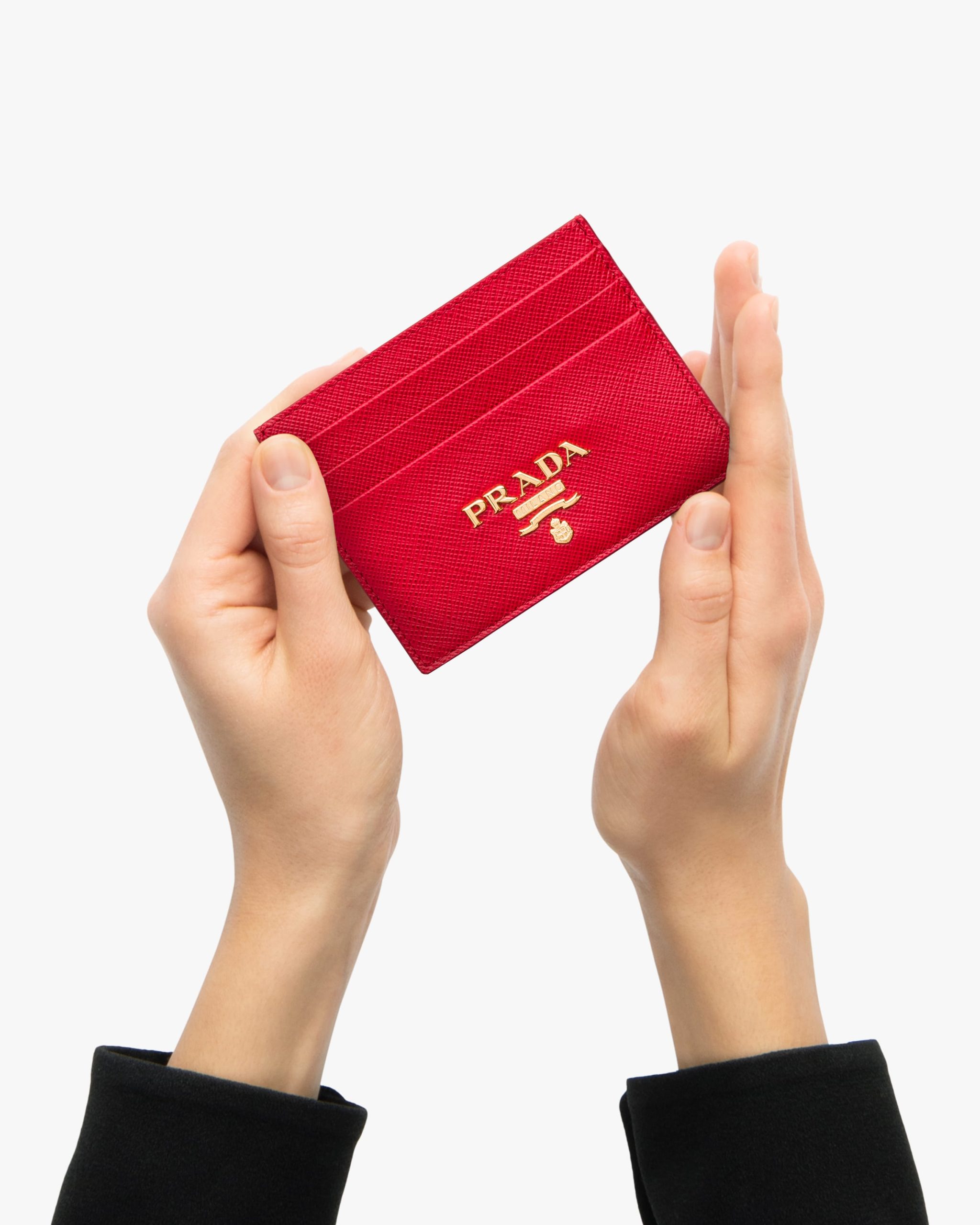 This Saffiano leather card holder expresses elegant simplicity. It is decorated with the metal logo.