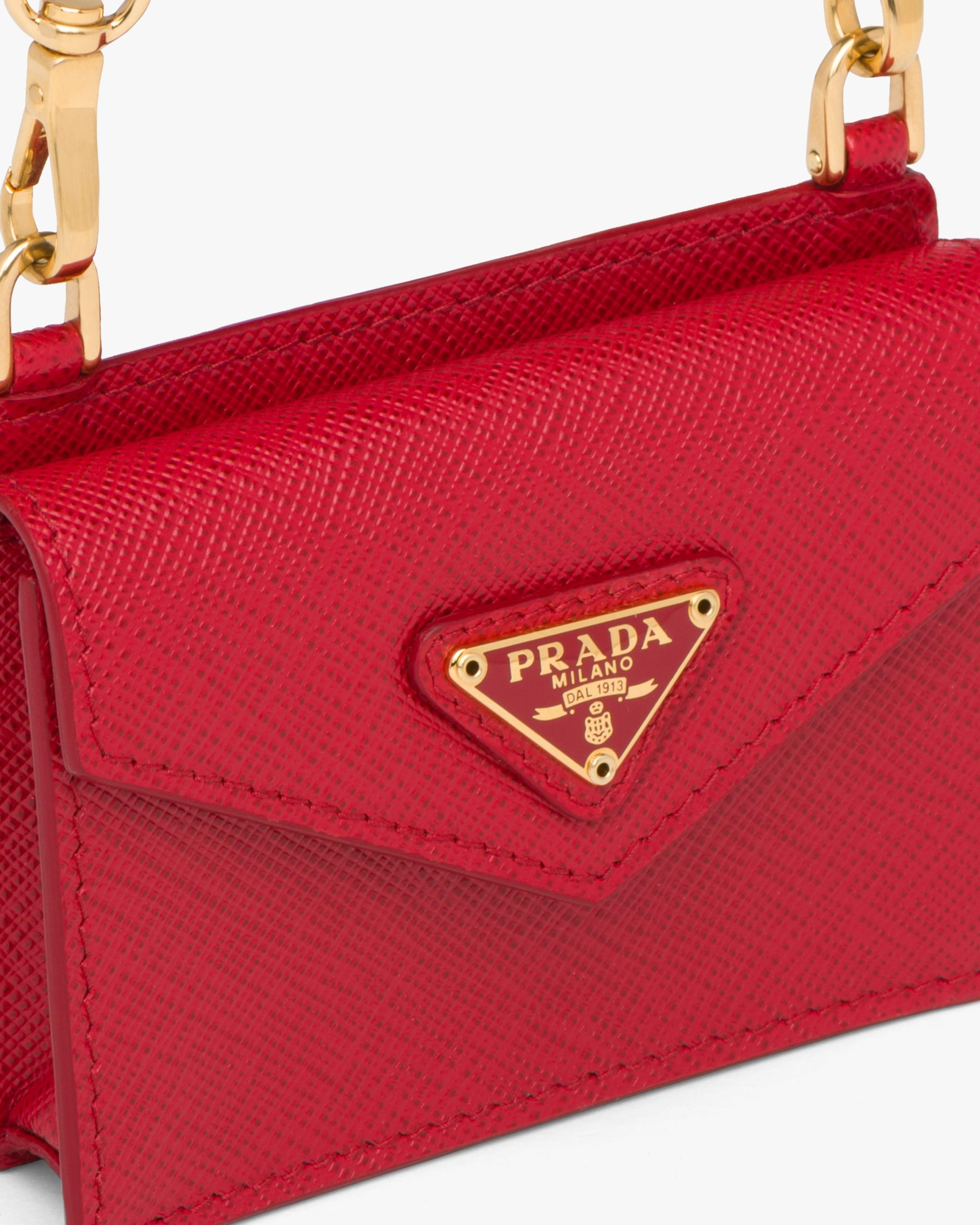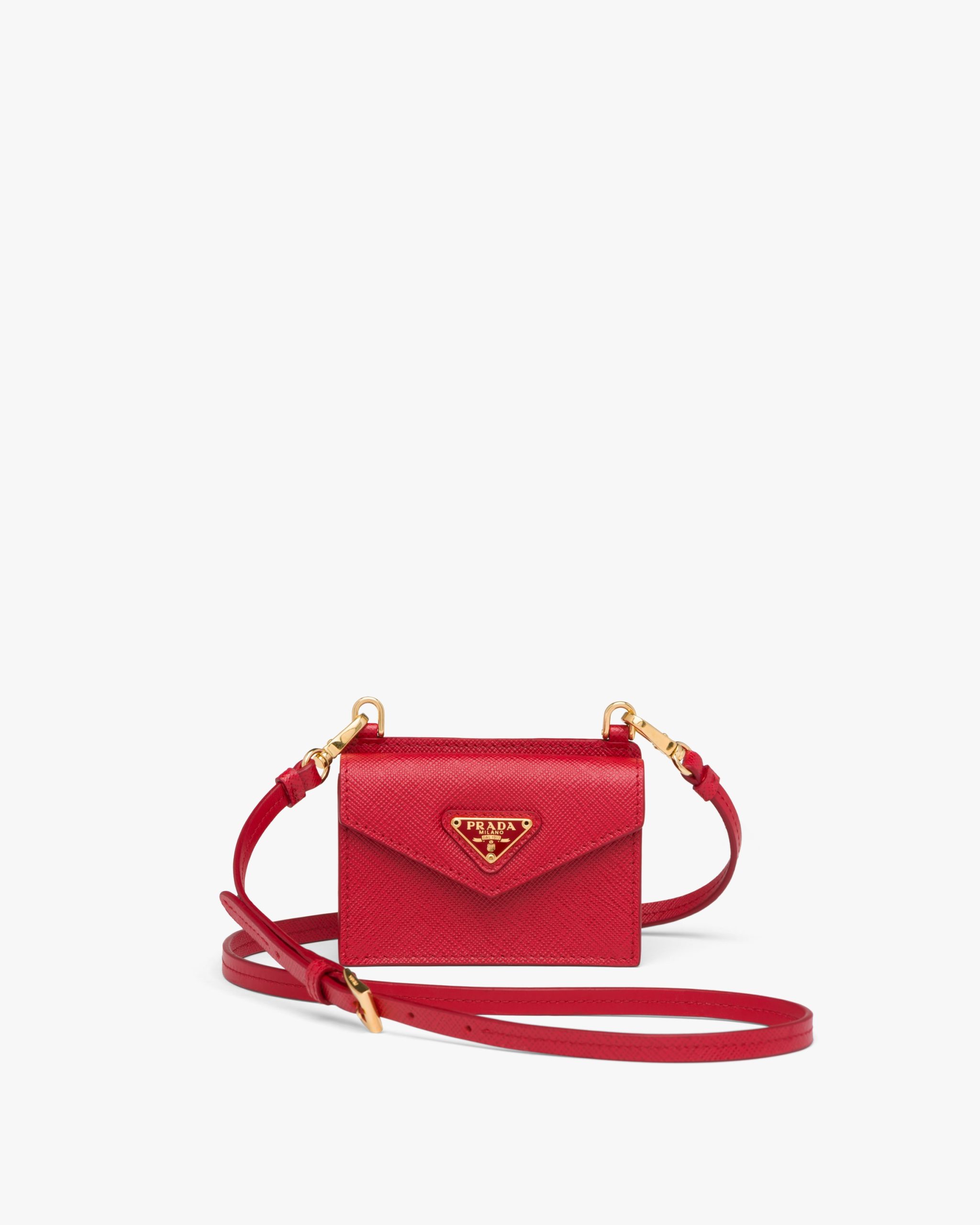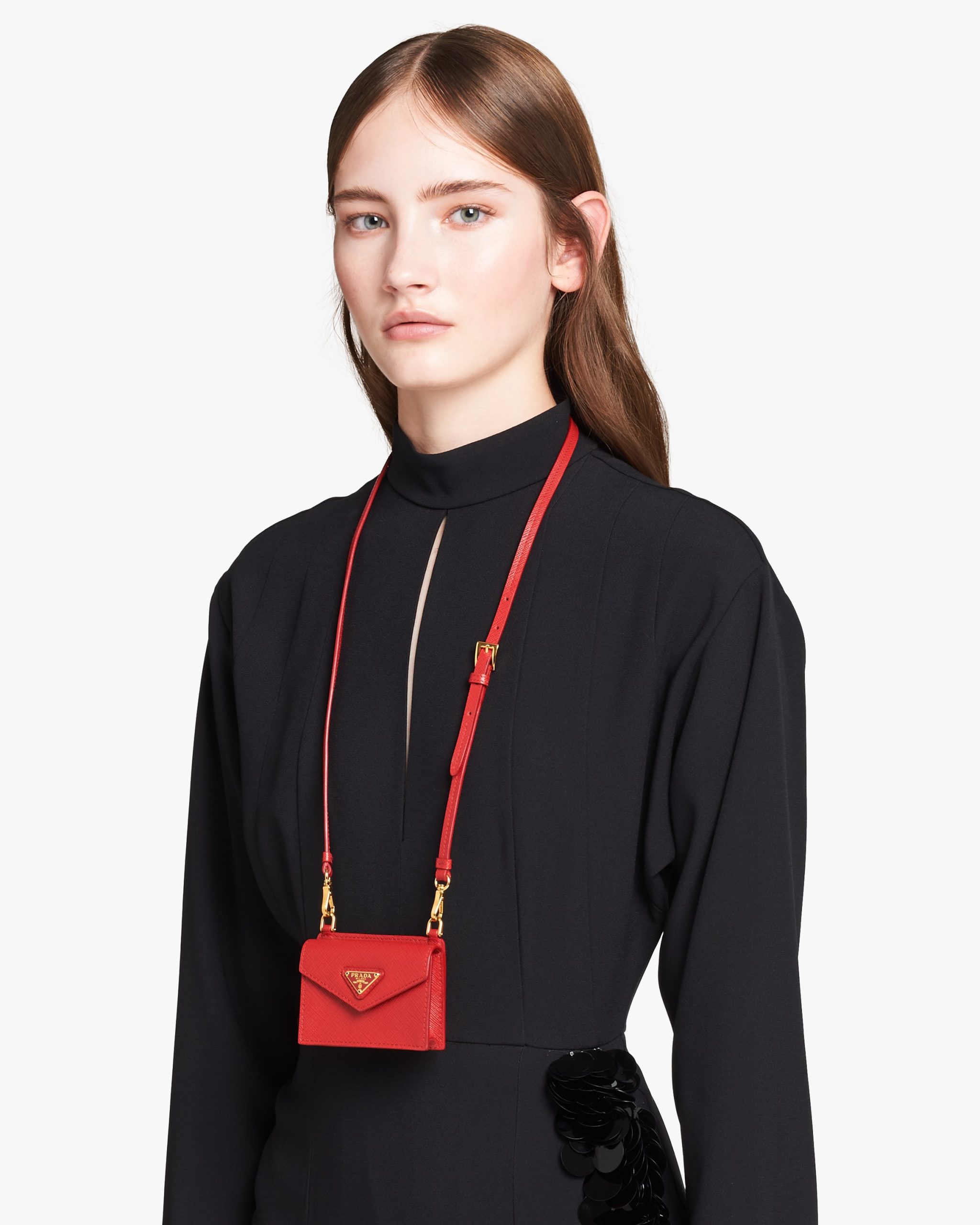 This Saffiano leather card holder comes with a shoulder strap. The triangle logo decorates the accessory.